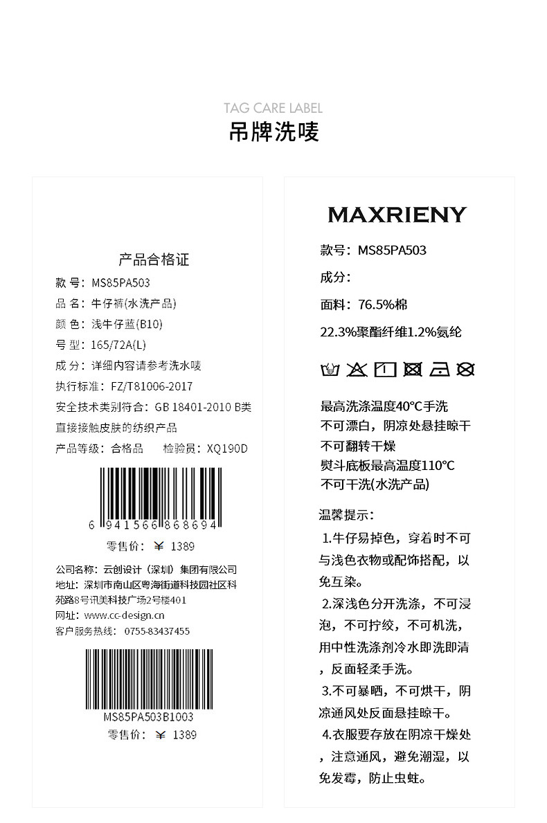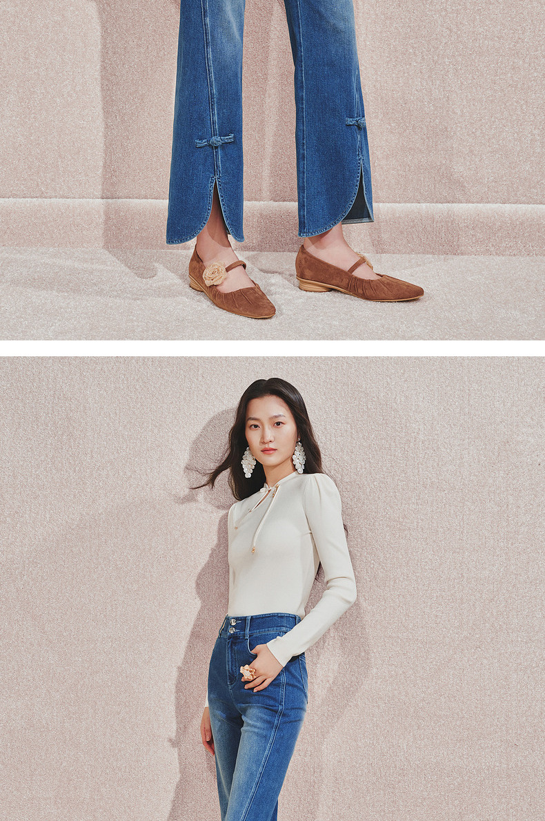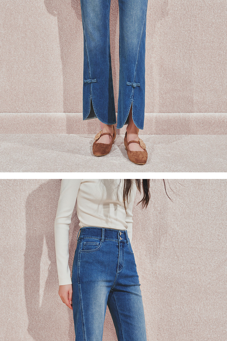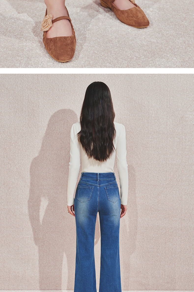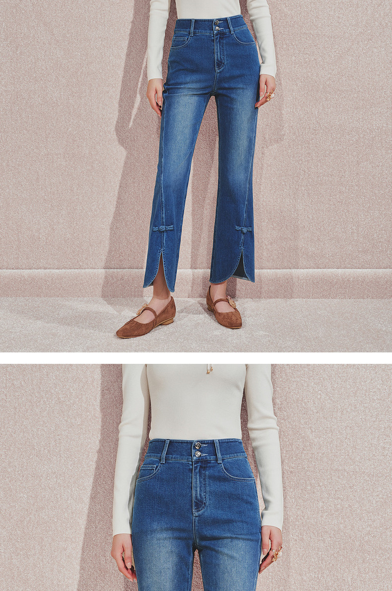 MAXRIENY复古优雅微喇牛仔裤2024秋冬新款腰头双扣设计长裤(货号:MS85PA503)