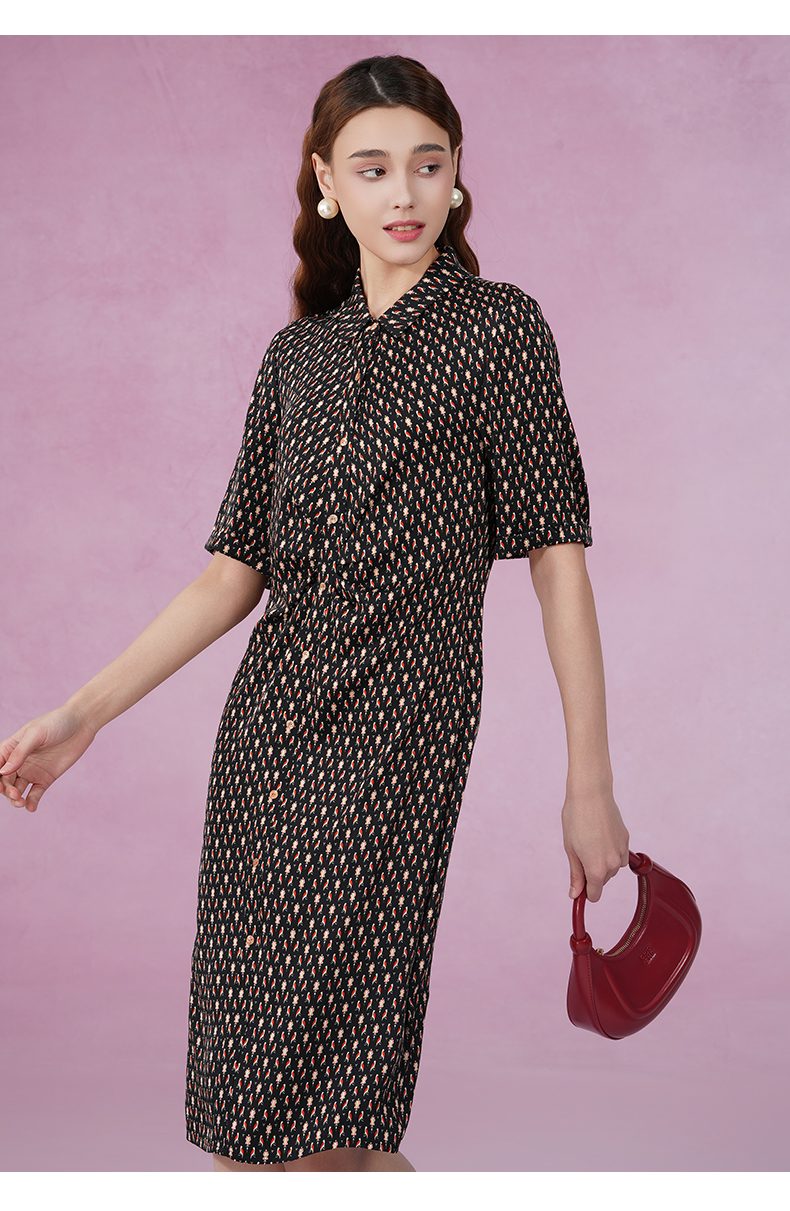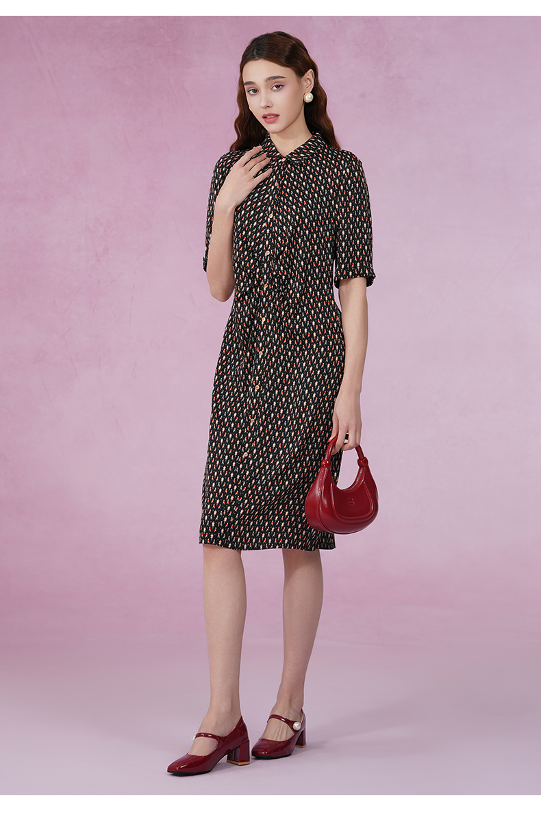 乔万尼规则印花桑蚕丝飘带领真丝连衣裙EI2E836