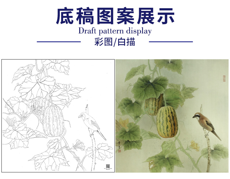 【大彩图】龚雪青工笔画白描底稿斗方小品《瓜园》西瓜临摹勾线花鸟线稿XQ47