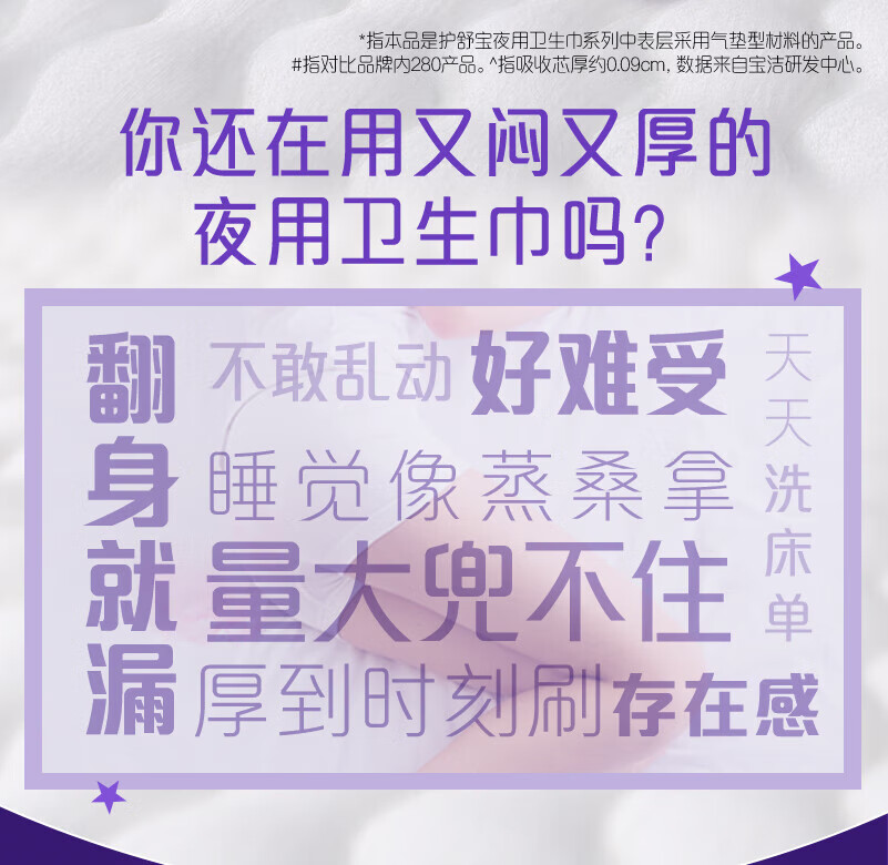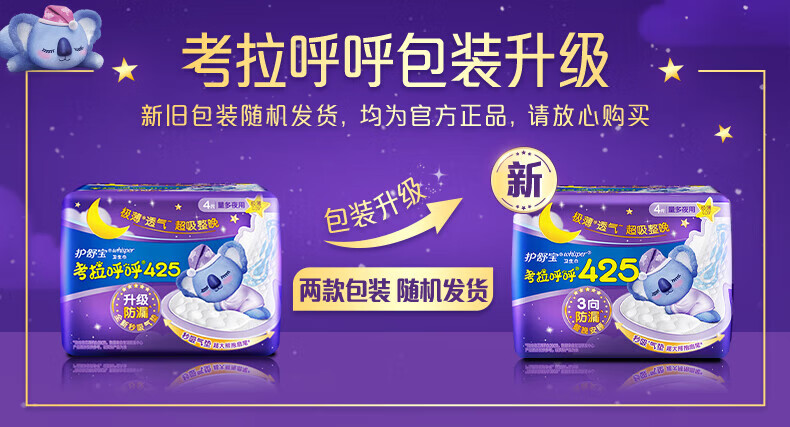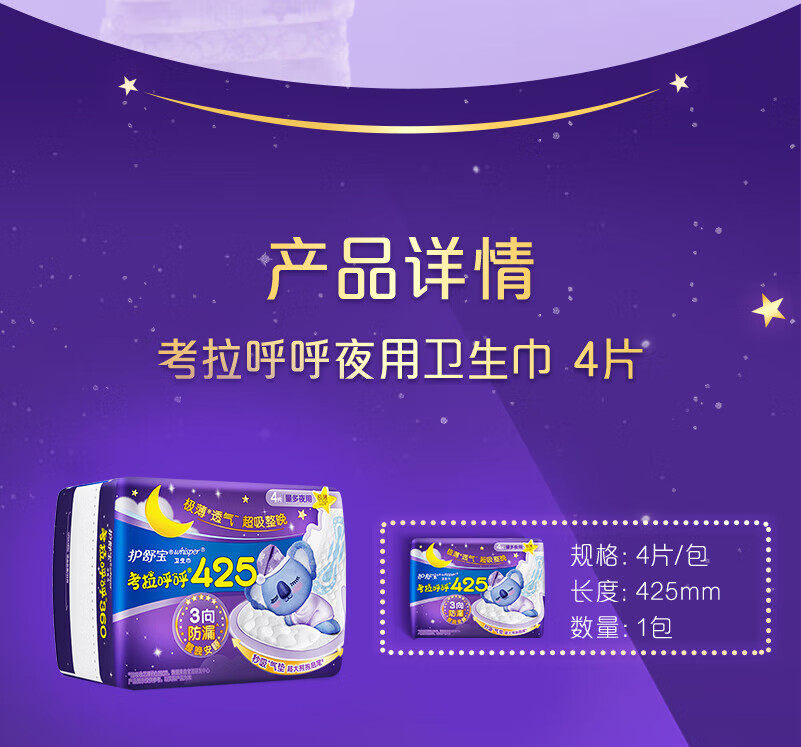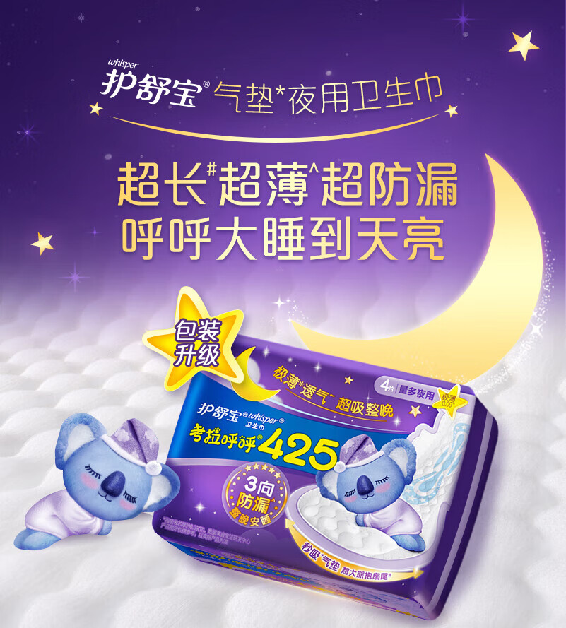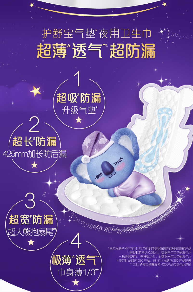 护舒宝考拉呼呼极薄卫生巾425mm4片加长夜用无感保护姨妈巾