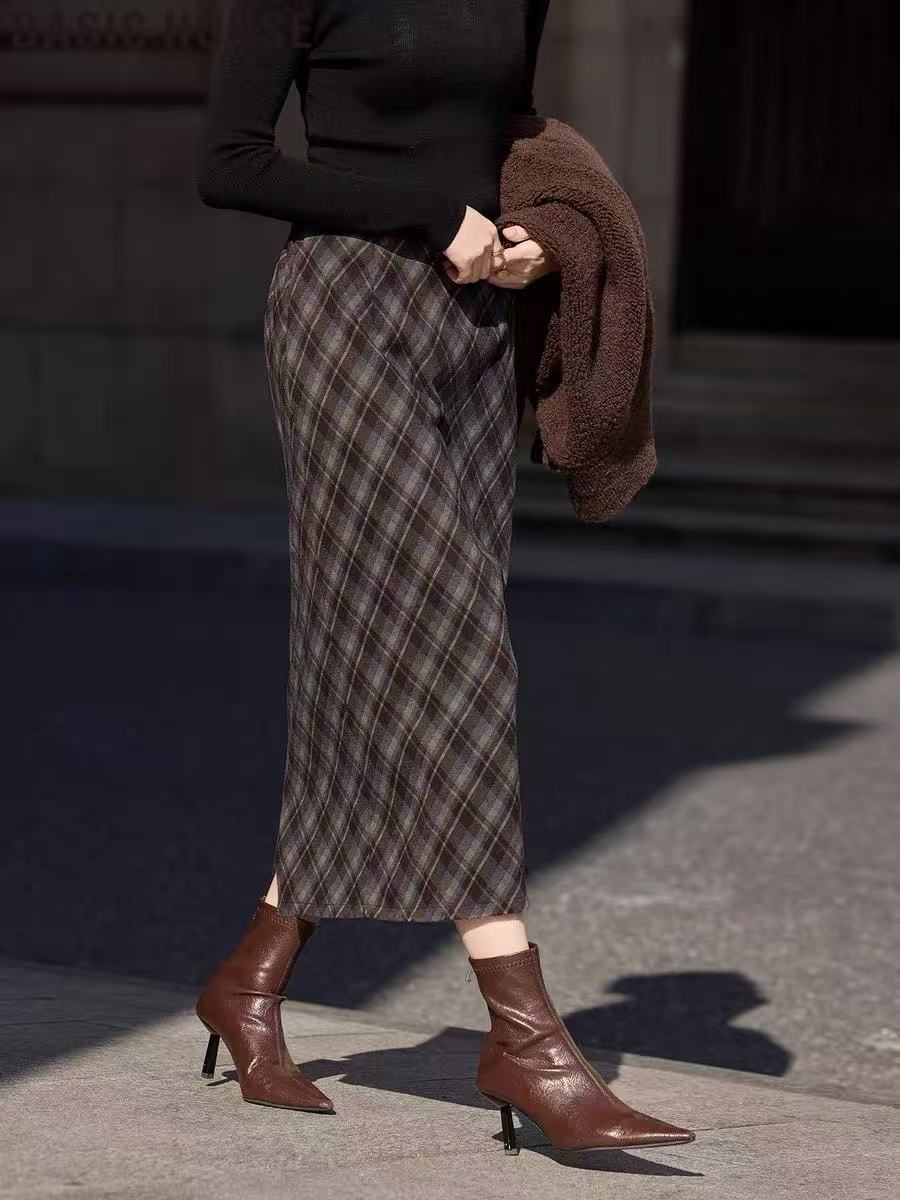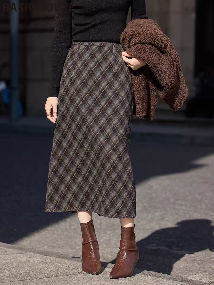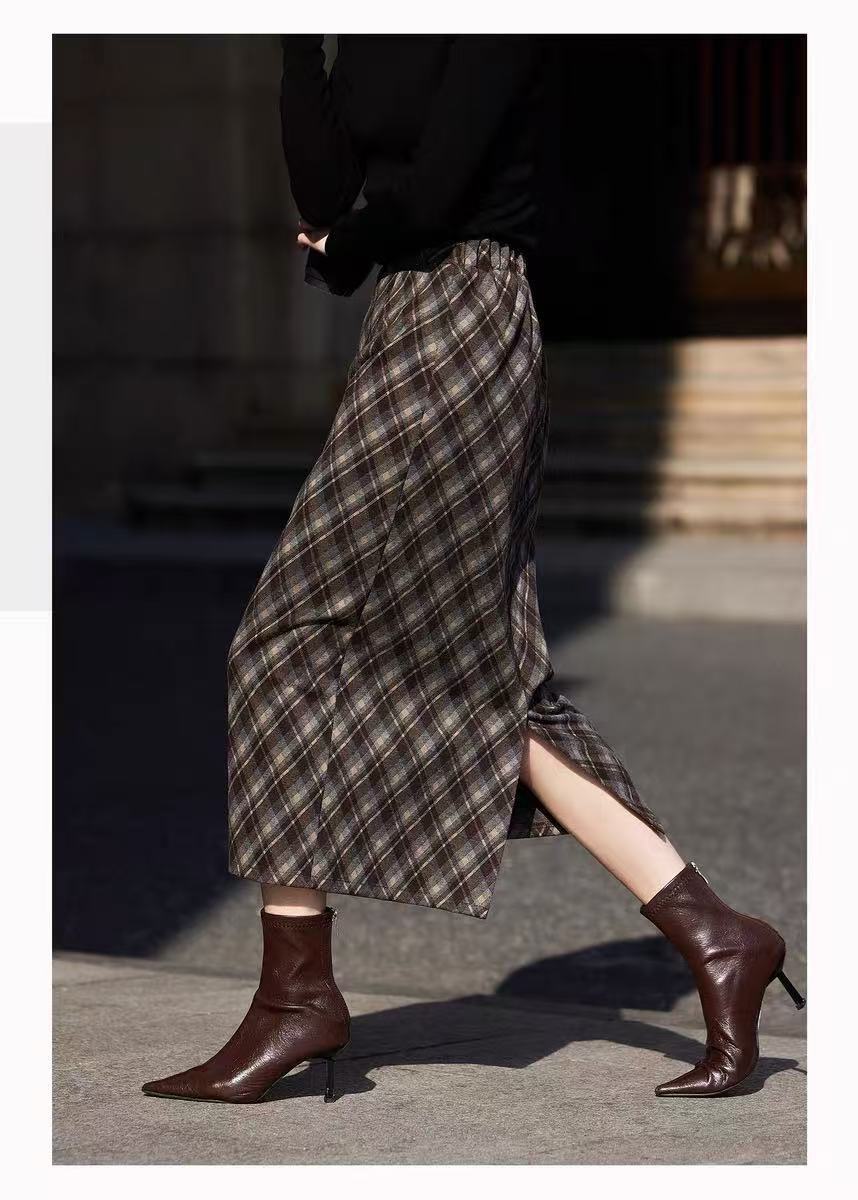 【孤品捡漏】G112呢料咖色格子直筒半身裙-喜出