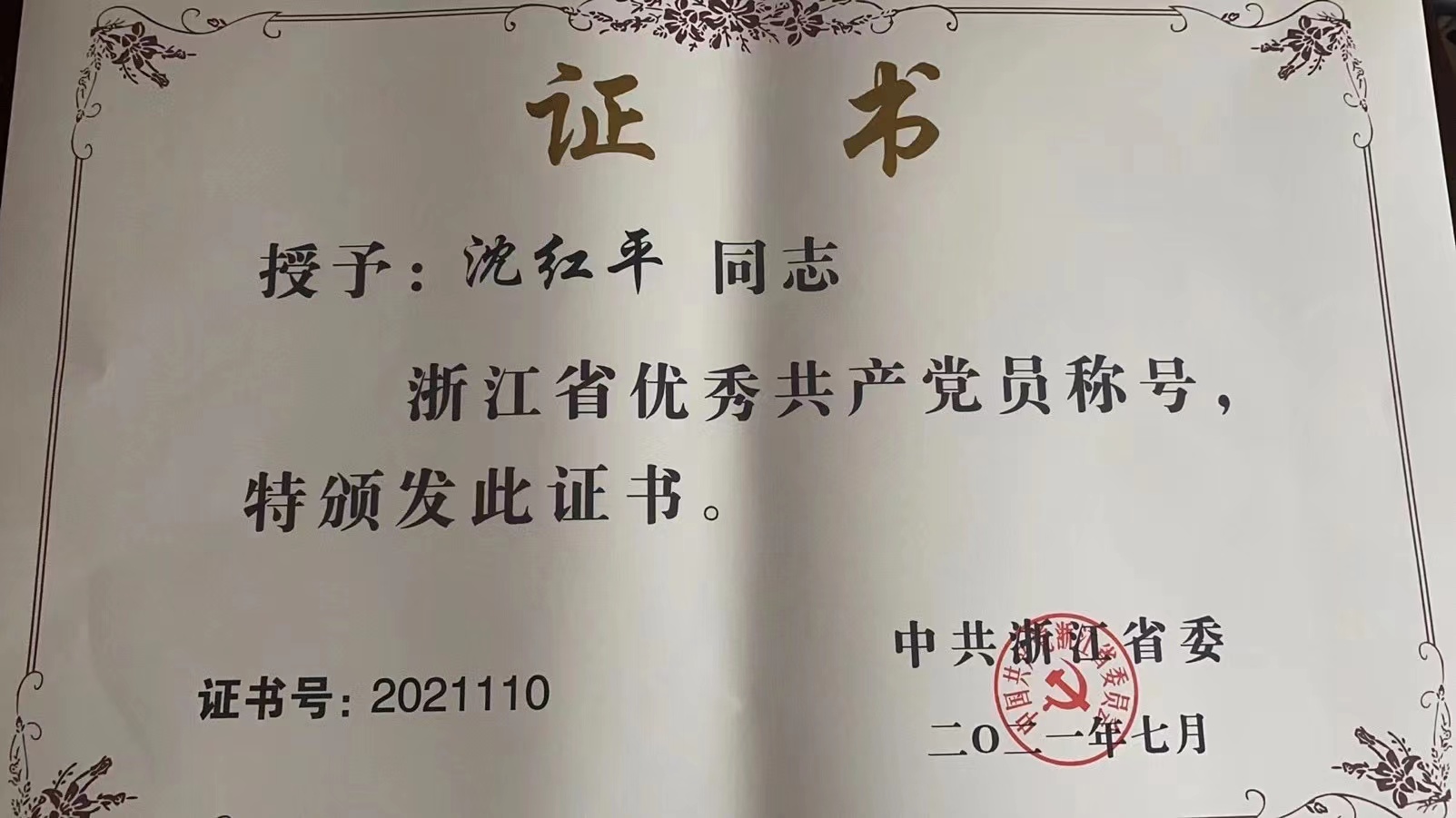 2021年,沈红平先后被授予浙江省优秀共产党员、浙江省担当作为好支书等政治荣誉。