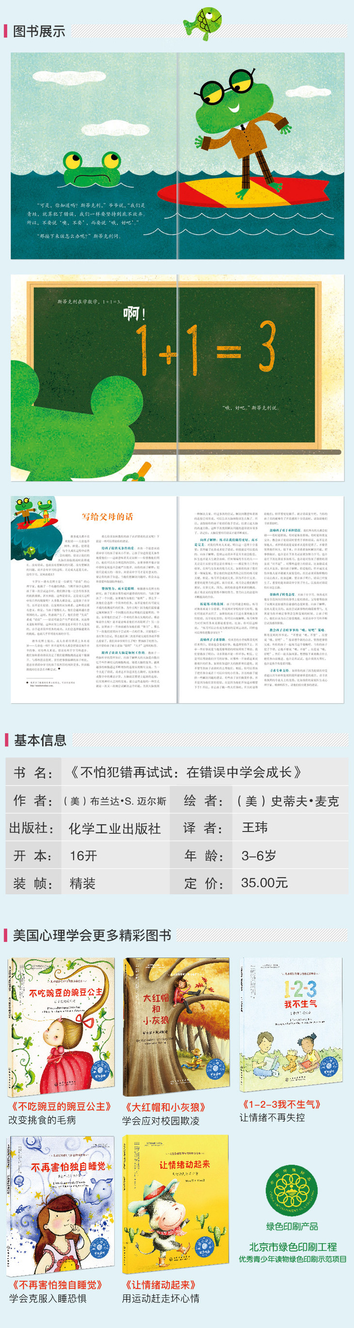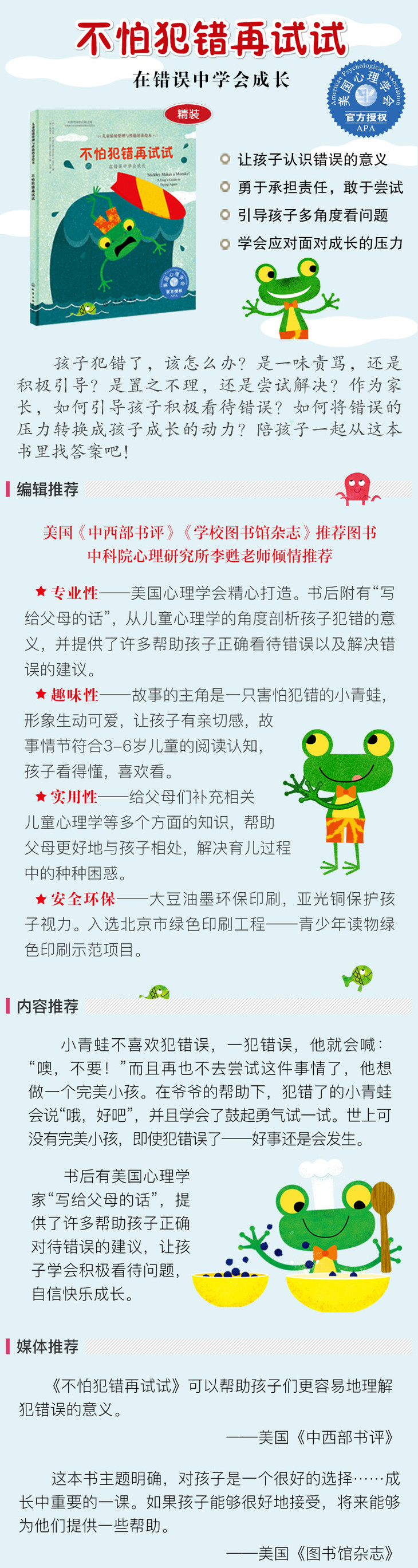 本书讲述了一个追求完美的小青蛙,害怕犯错误,一旦翻了错误,他就不再尝试做这件事情。在爷爷的帮助下,他认识到,错误本身不可怕,最重要的是犯错误后要改正错误,勇于尝试,才能做好一件事情。这个故事告诉孩子,不要怕犯错误,强大自己的内心,正视问题,不断尝试,做内心强大的自己,另外,书里小青蛙对待错误的一些方法:吸口气、不断尝试、加把劲,对孩子的成长也是非常有帮助的。 书后所附的《写给父母的话》,为父母提供了许多帮助孩子正确看待错误的意见和方法。