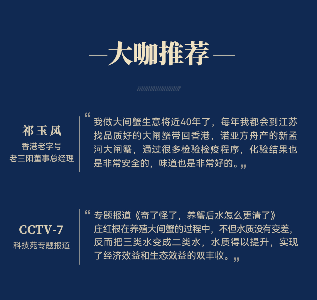 - “好水养好蟹”新孟河“引江济太”是国家治理太湖水环境的重要组织部分,新孟河大闸蟹养殖基地约5000亩,是中华绒螯蟹出口基地,受香港环境卫生署专程考察,生态养殖受中央电视台专题报导;29年养蟹,匠心坚守