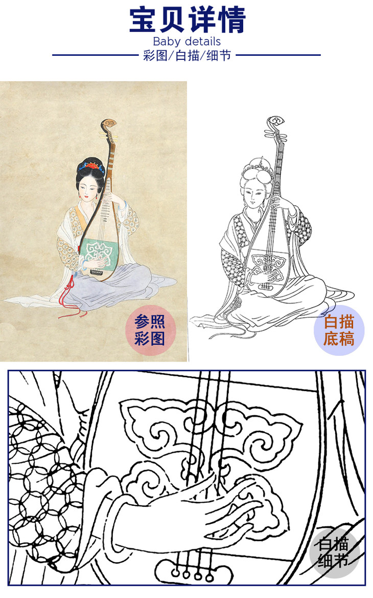 杨淑涛竖幅工笔传统仕女人物白描底稿《音如石上流》-多种白描尺寸可以选-B063