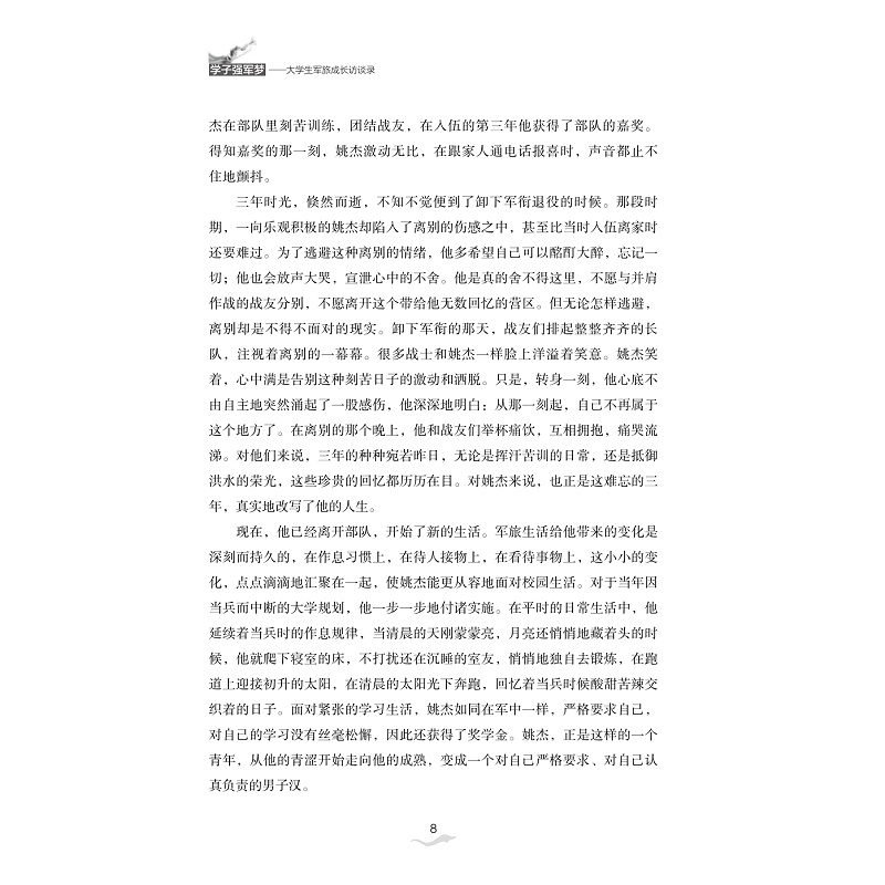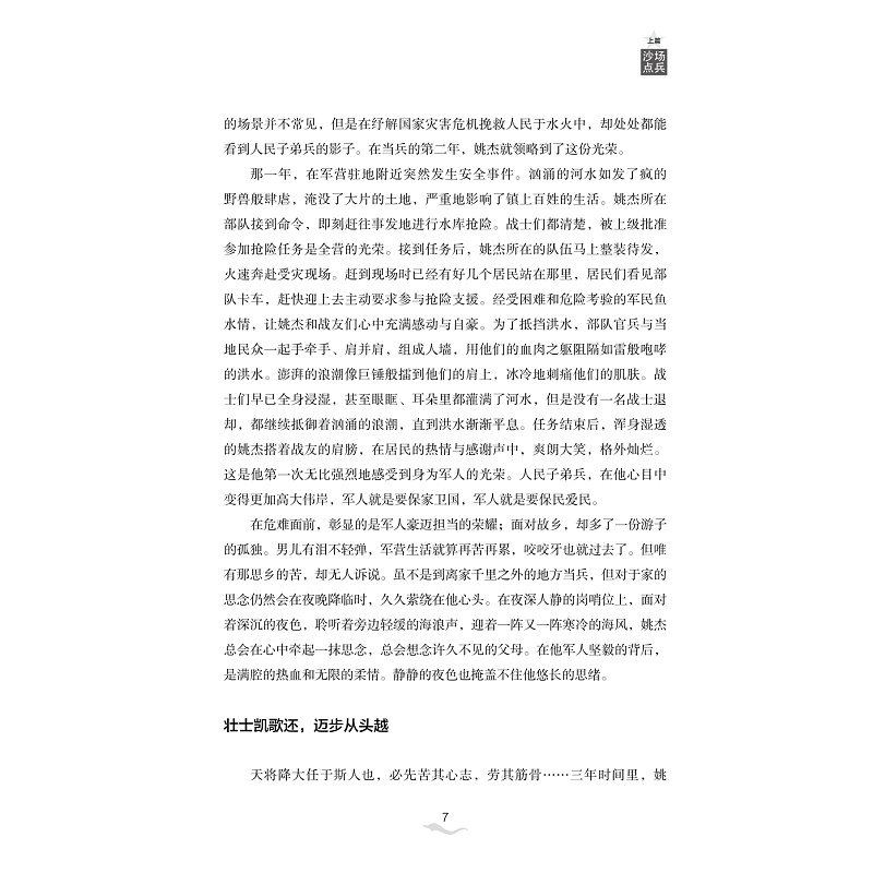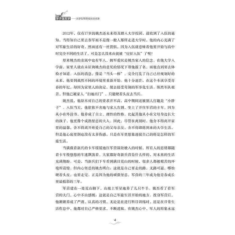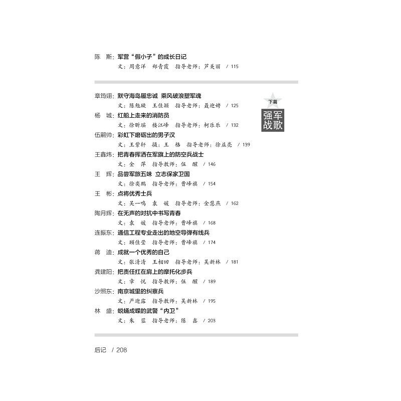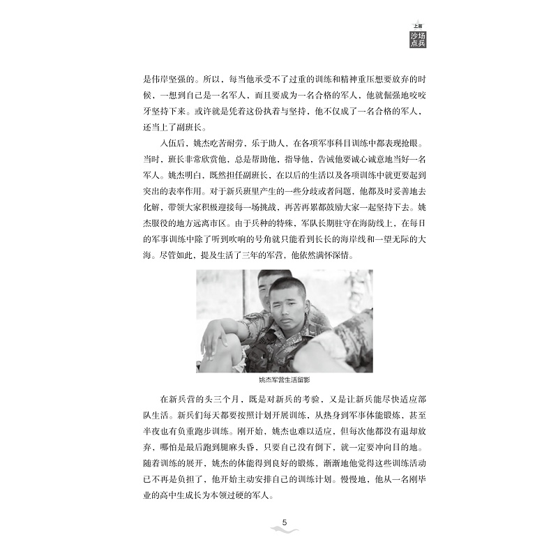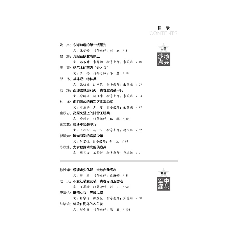 本书是宁波理工学院思政课“微化”教学改革的系列成果之一,主要是以浙江大学宁波理工学院27名参军入伍学生为对象,通过访谈等形式,记录大学生士兵在两年军旅生活中的心路历程与点点滴滴,比较全面的展示大学生在部队服役以及复员返校后这段青春时光里的个人成长,同是,在每一位受访对象的实录文末,附以采访同学的心得体会与采访感悟,与正文彼此呼应。文稿总共分为三个篇章,即“沙场点兵”“军中绿花”“强军战歌”,篇章之间各有侧重,又互为关联,对青年学生自省成长历程,感受军旅生活,增强国防意识有一定的辅助作用,是大学生思想政治教育深化实践育人、丰富地方化教学元素、发挥同辈影响效用的一次融合与探索。