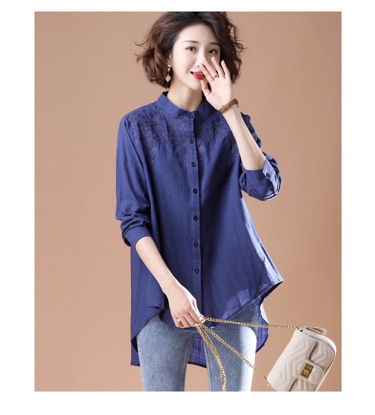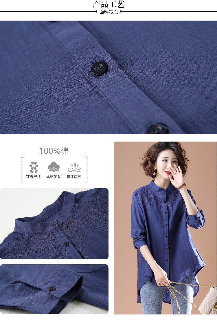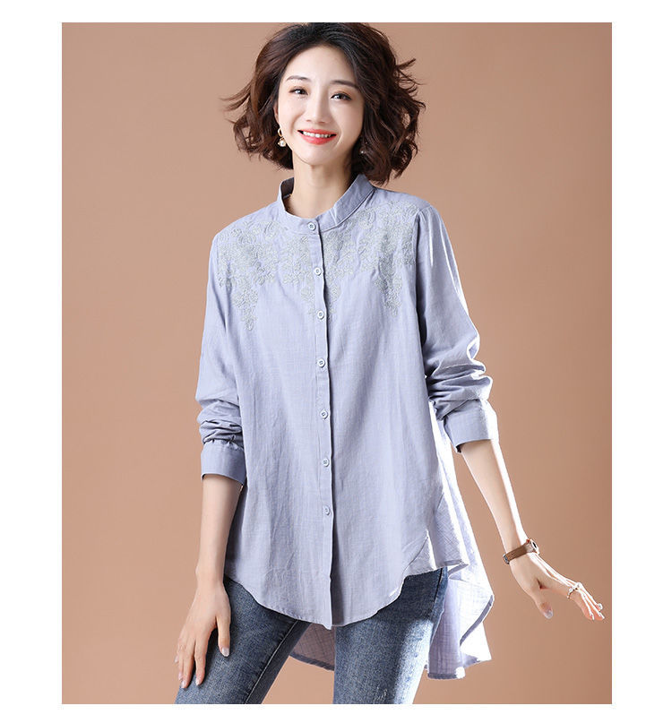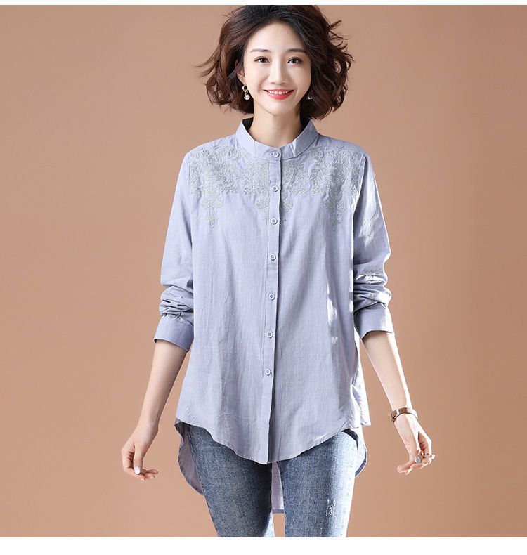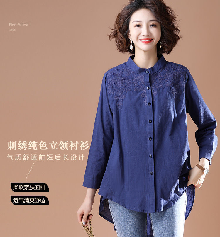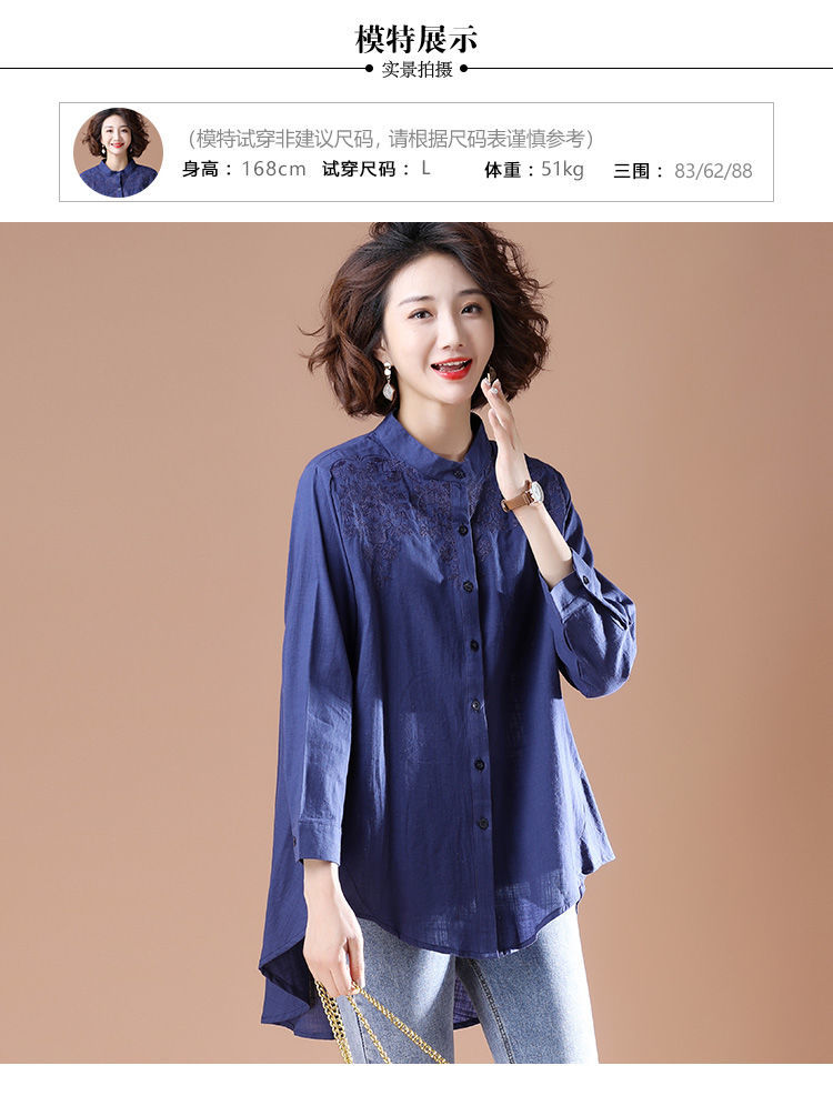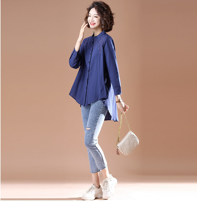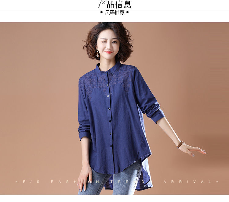 TZW-大码女装2022春新款胖mm遮肚显瘦棉麻刺绣不规则衬衫女