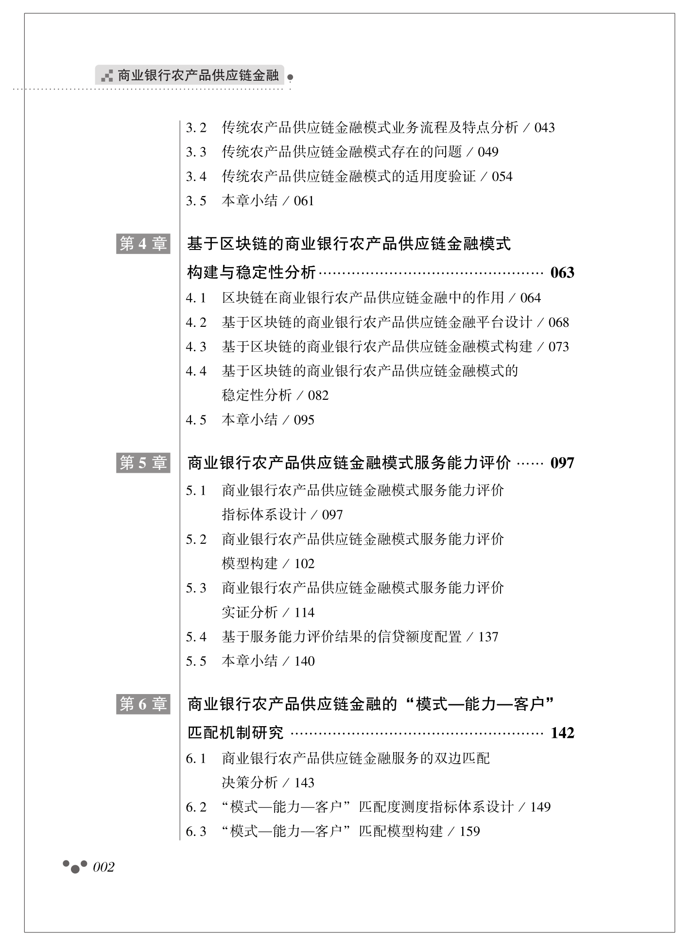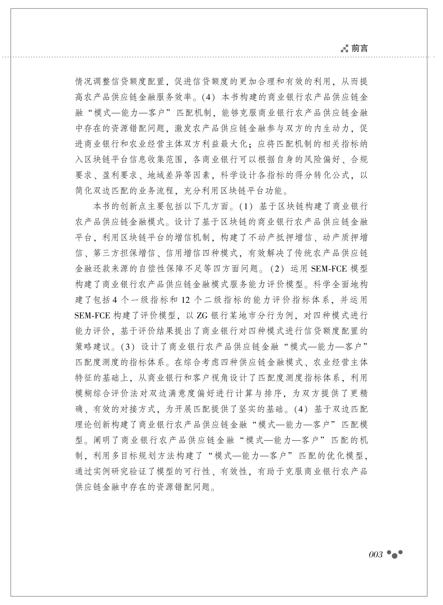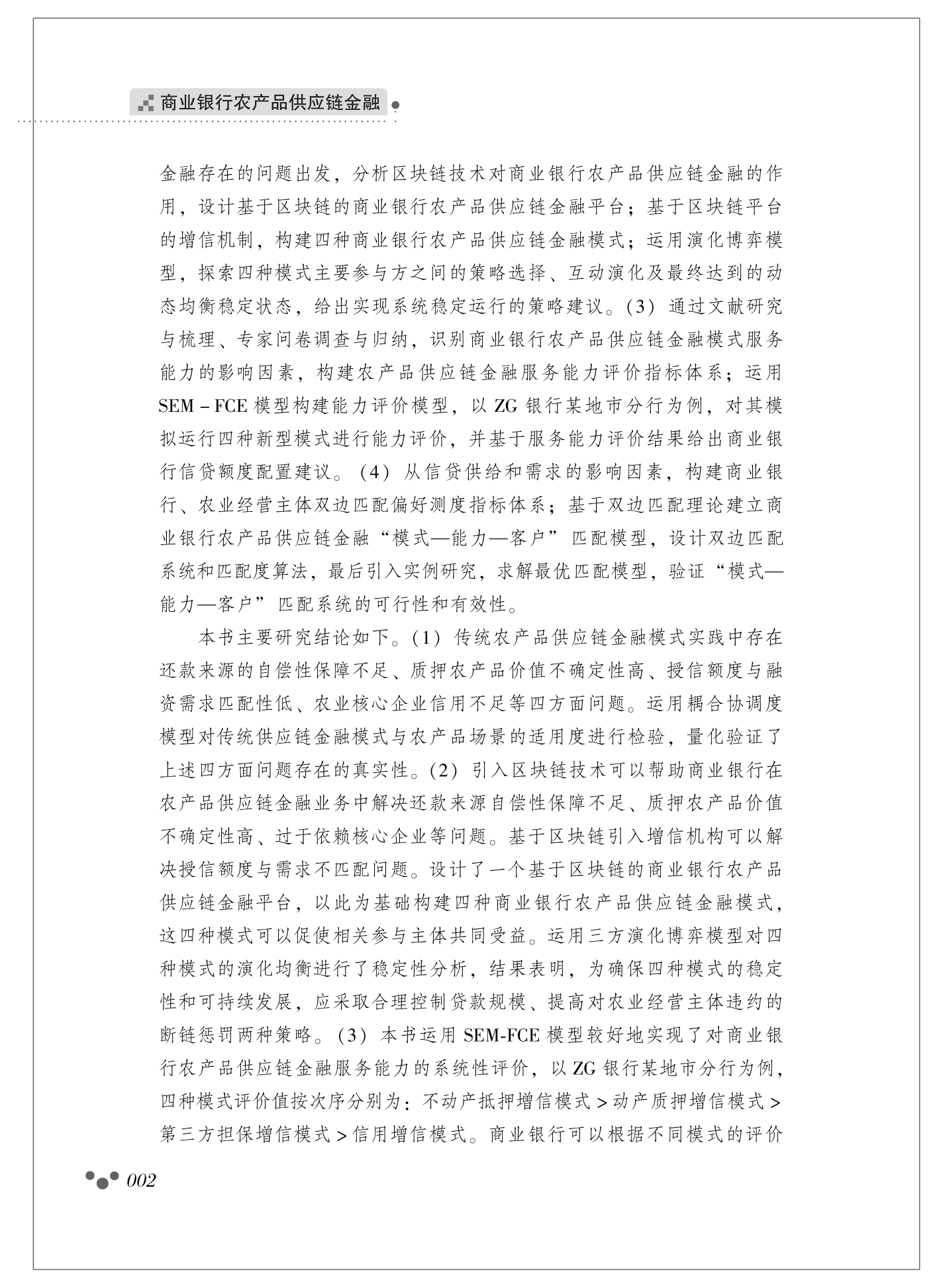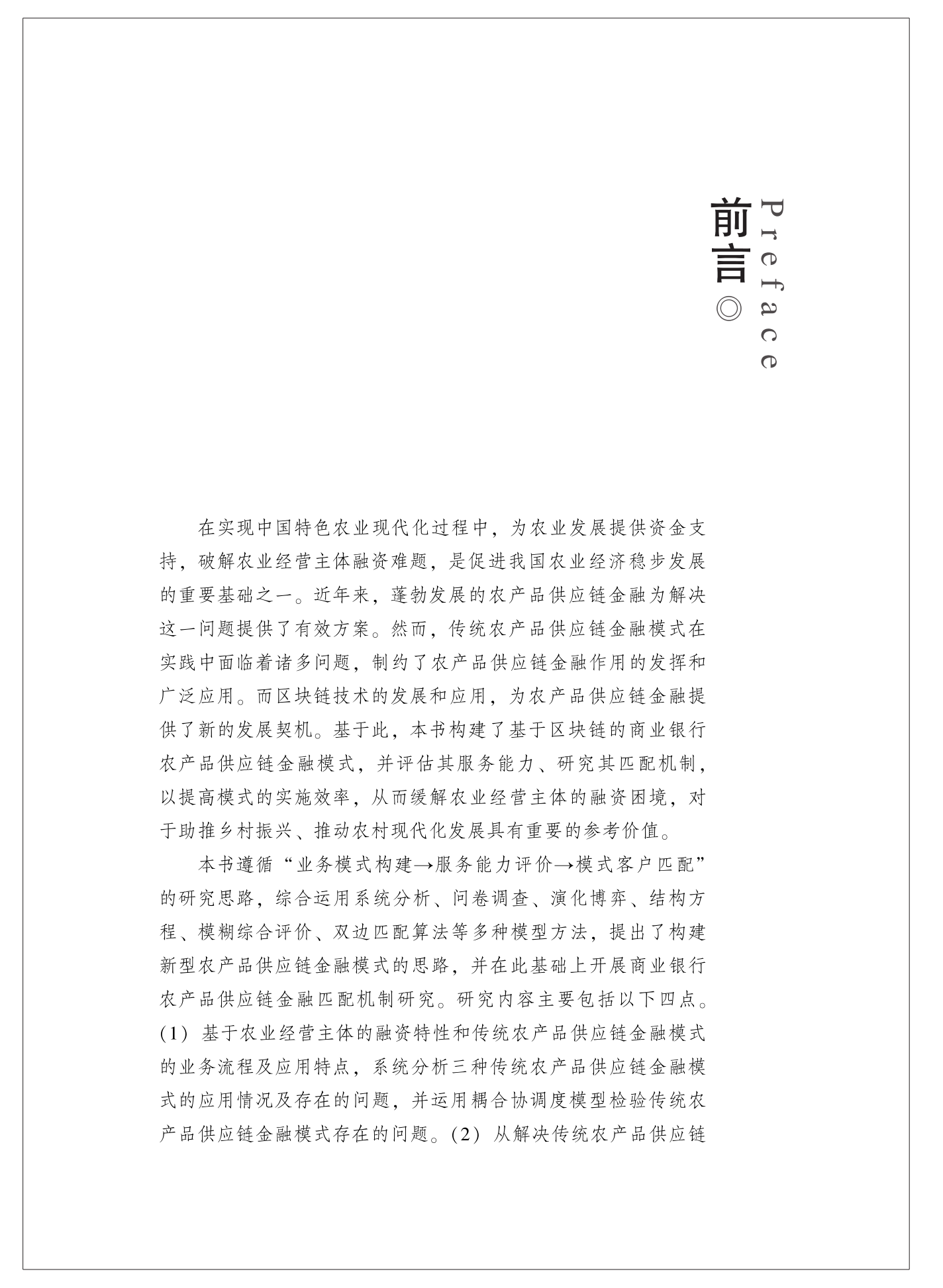 传统农产品供应链金融模式在实践中面临着信息不对称、信用体系不健全、风险控制难度大等诸多问题,严重制约了农产品供应链金融作用的发挥和广泛应用,导致农业经营主体融资难、融资贵问题突出。为破解这一难题,本书创新性地将区块链技术引入农产品供应链金融领域,构建了基于区块链的商业银行农产品供应链金融新模式。该模式利用区块链去中心化、不可篡改、可追溯等技术特性,有效解决了传统模式下的痛点问题。本书不仅构建了新模式,还对其服务能力进行了科学评价,并深入研究了“模式—能力—客户”匹配机制,以提高模式的实施效率和精准度,最终实现缓解农业经营主体融资困境的目标。本书成果将为商业银行发展农产品供应链金融业务提供理论指导和实践参考,对推动农业现代化、助力乡村振兴具有重要意义。