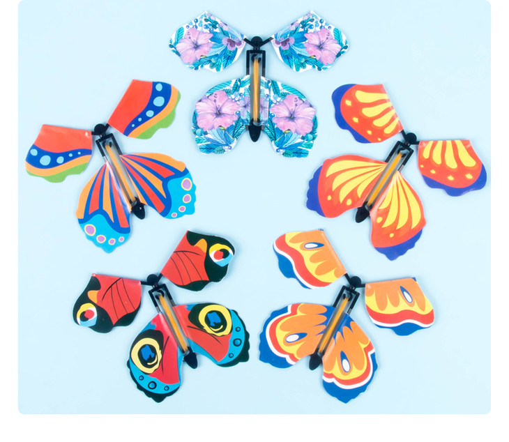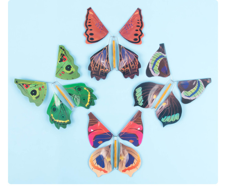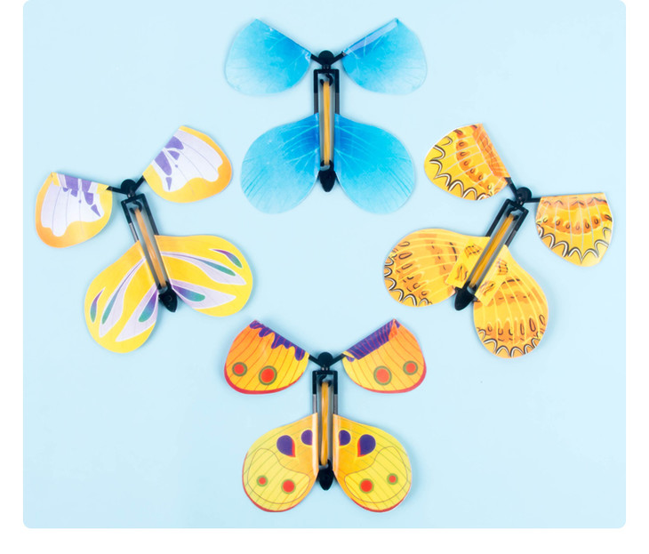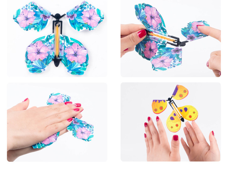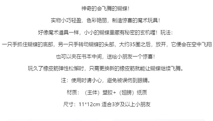 使用方法:把皮筋旋紧,夹在书中间,打开书的同时向空中一抛,蝴蝶就会飞出,也可以直接从手中扔出。