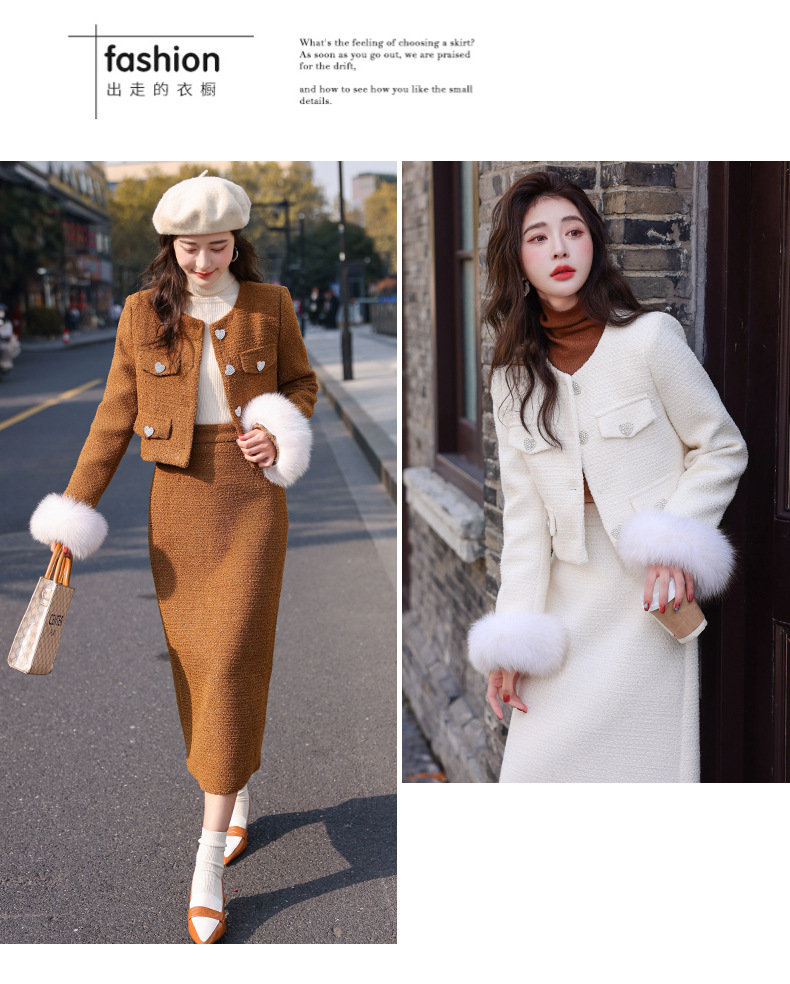 HR SNX2893小香风时尚套装裙气质毛呢子羽绒外套半身裙两件套 商品图1
