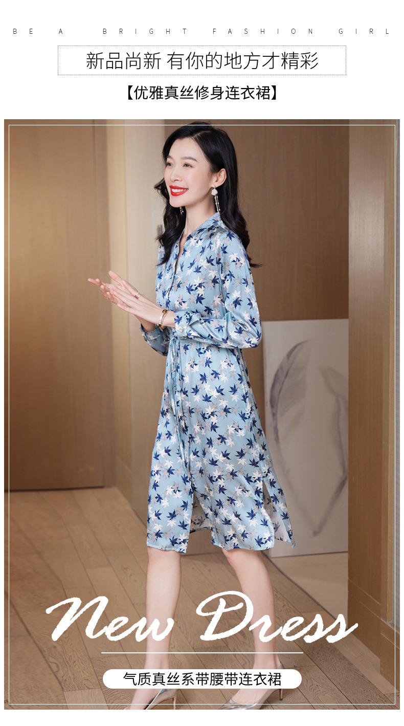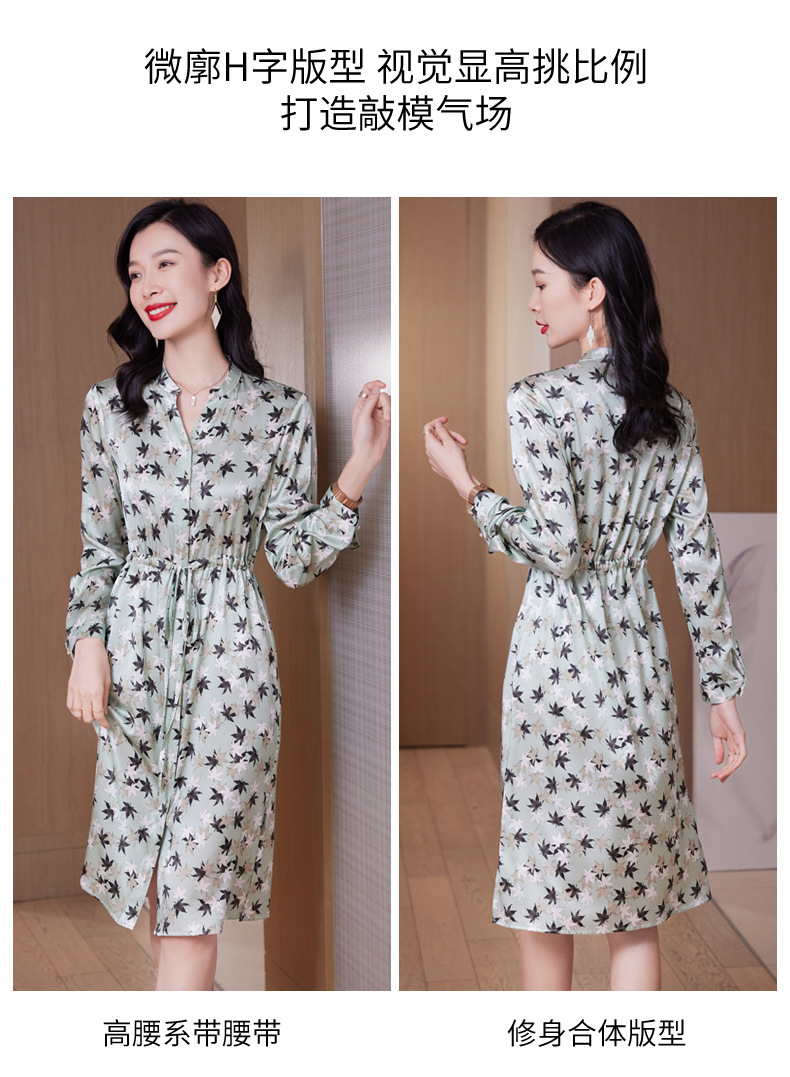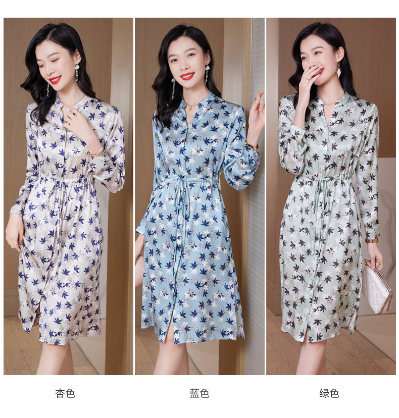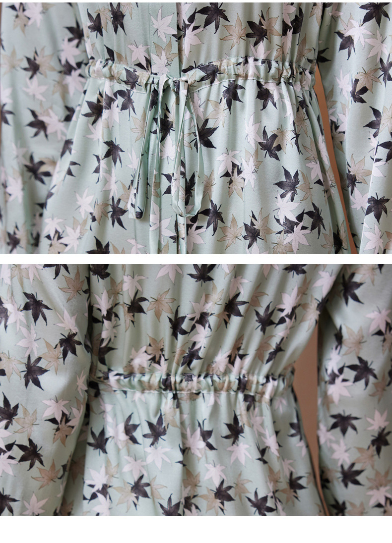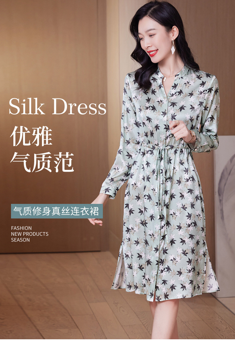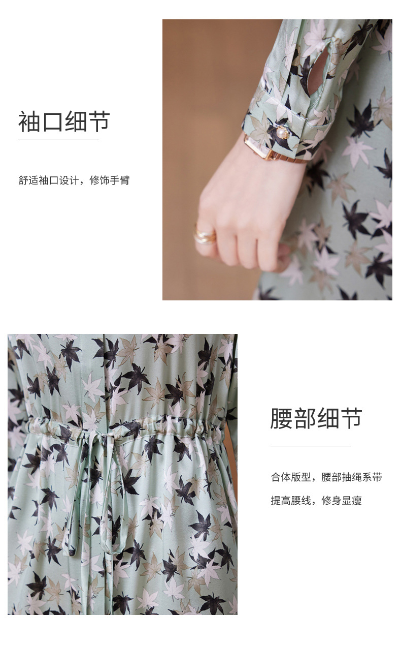 ASE-9516温柔风长袖真丝连衣裙春装女2023新款枫叶系带收腰显瘦桑蚕丝