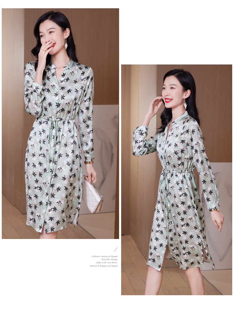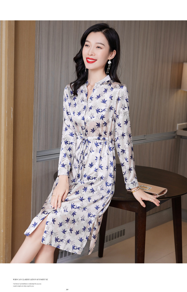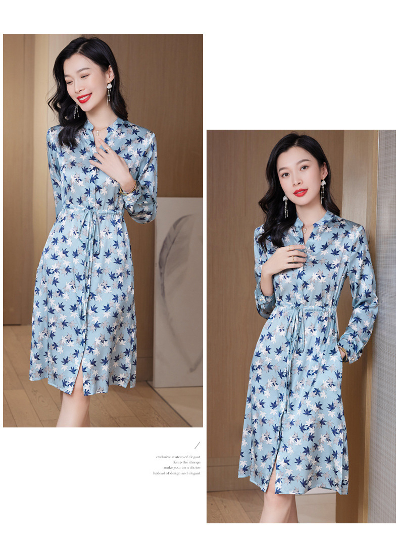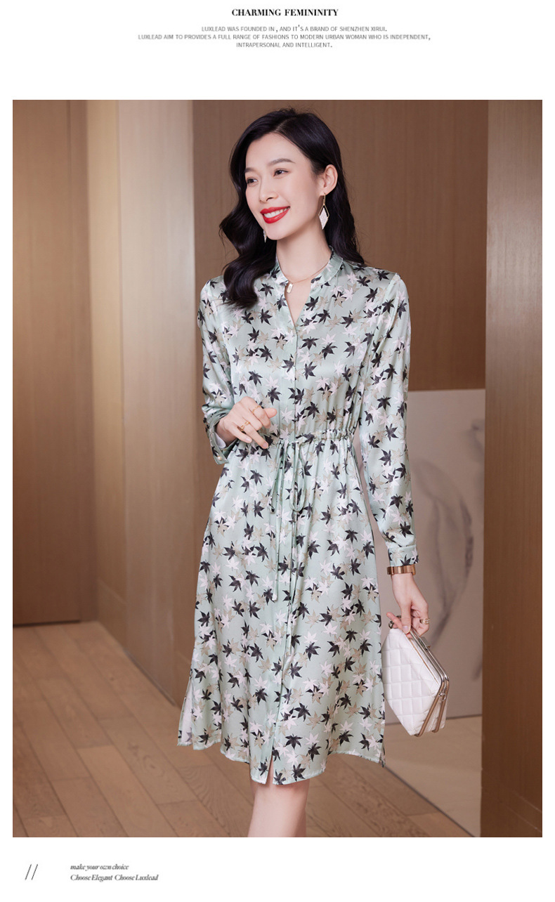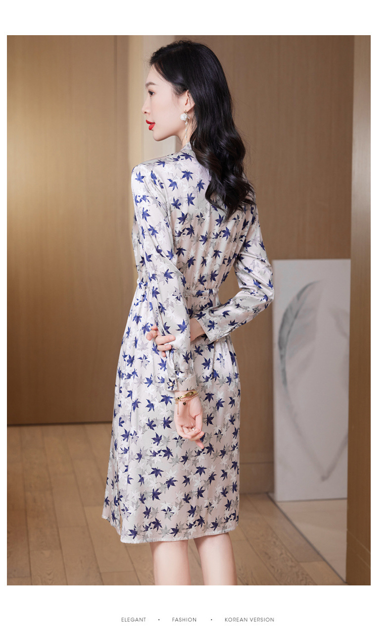 ASE-9516温柔风长袖真丝连衣裙春装女2023新款枫叶系带收腰显瘦桑蚕丝