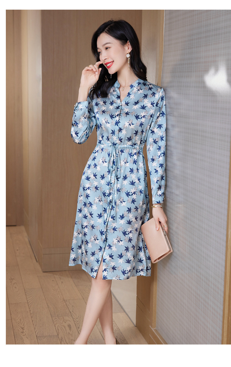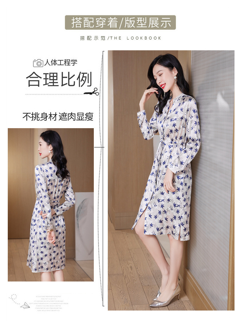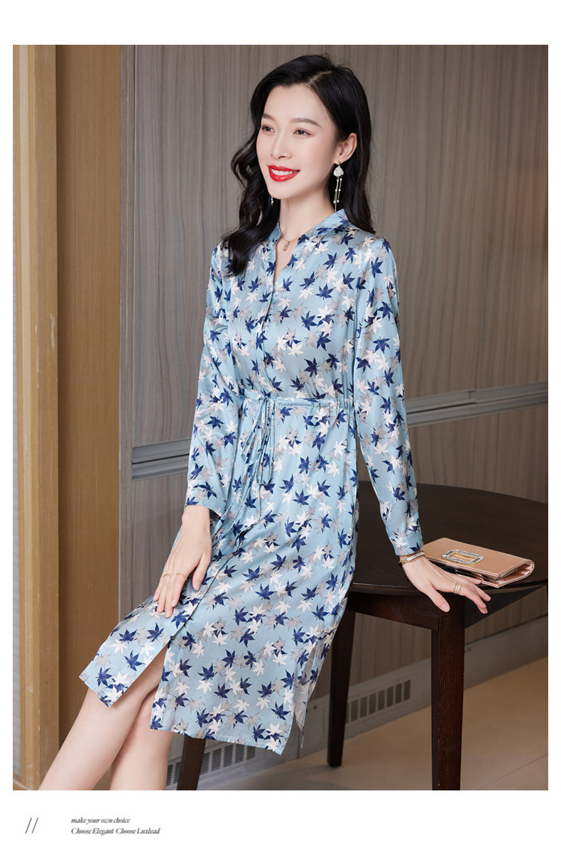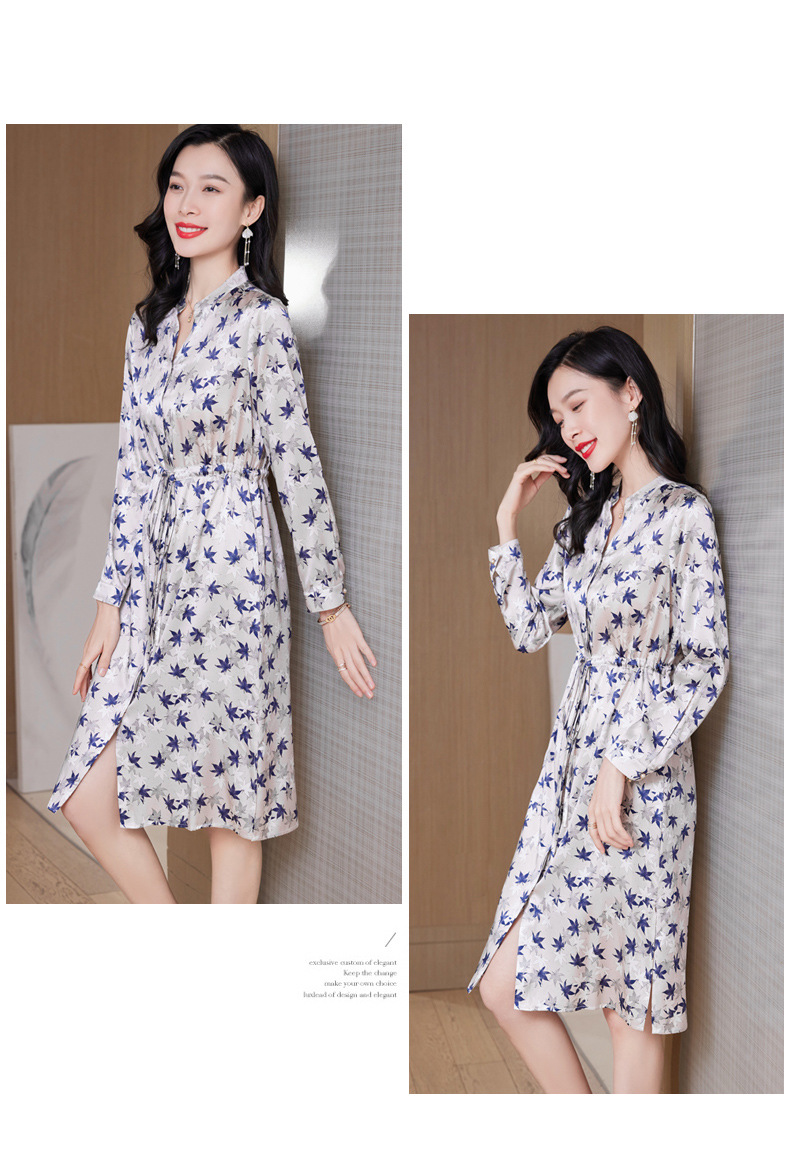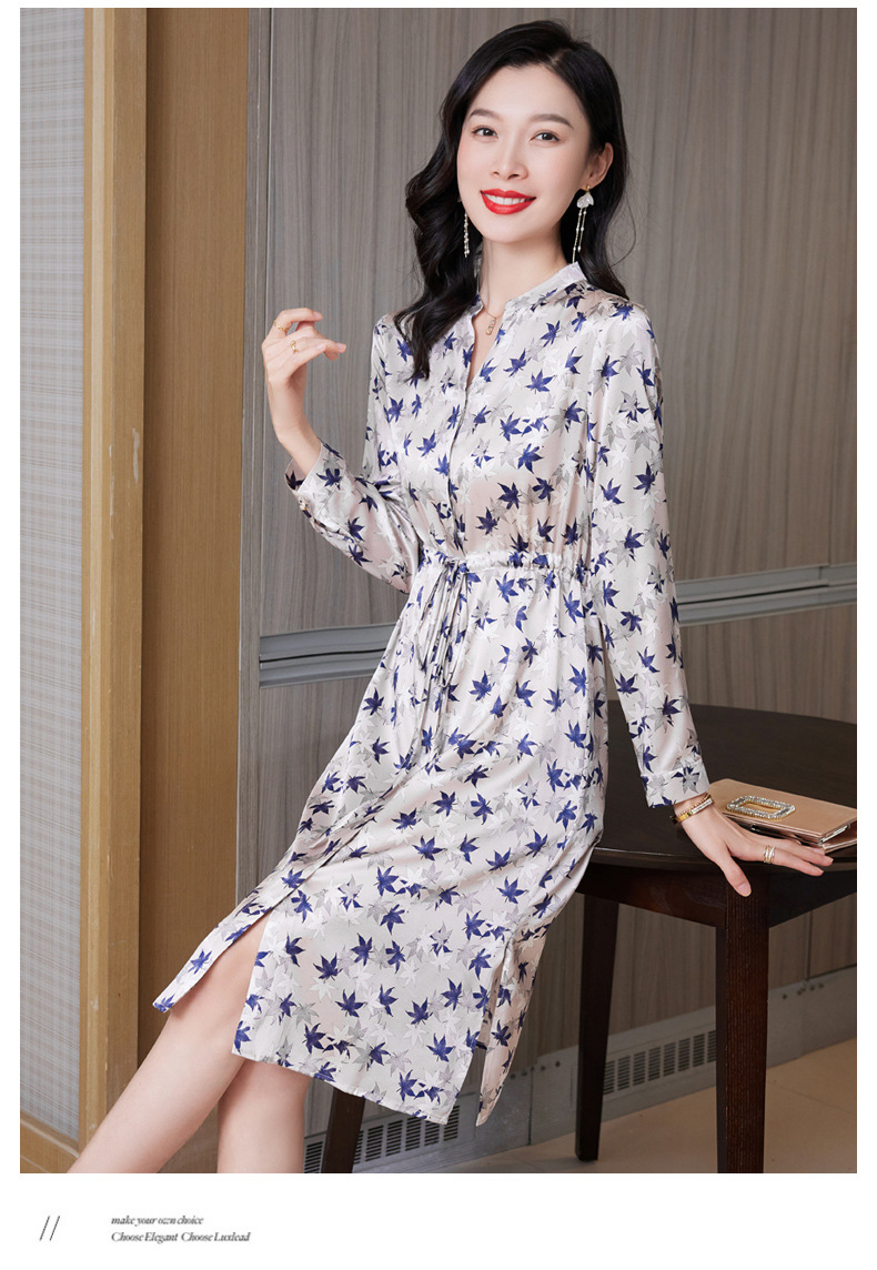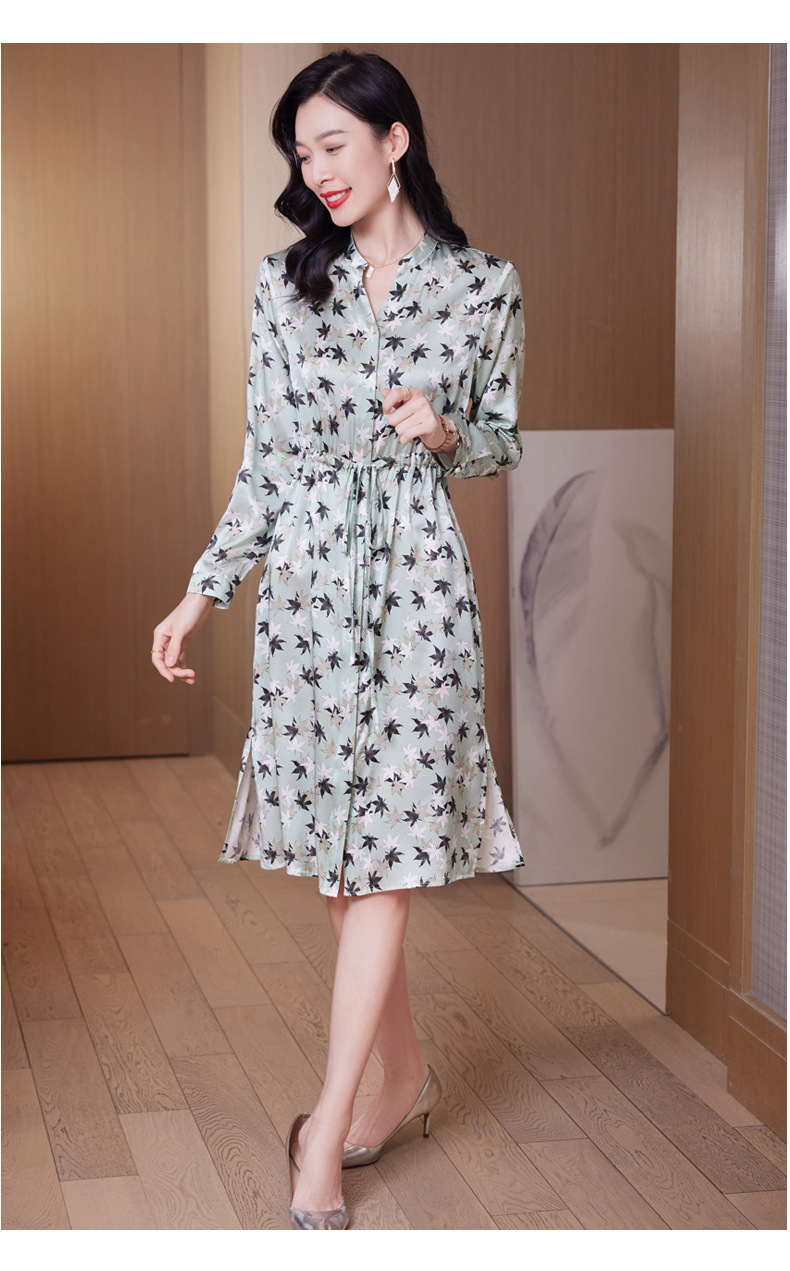 ASE-9516温柔风长袖真丝连衣裙春装女2023新款枫叶系带收腰显瘦桑蚕丝