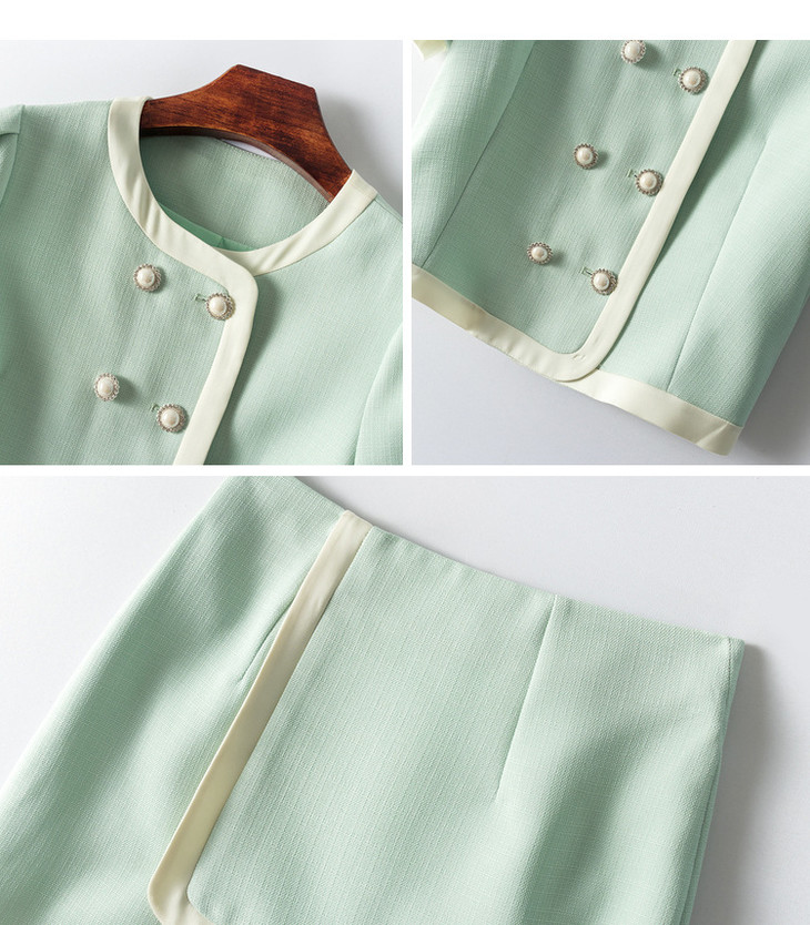 OLSZ85910新款时尚优雅气质圆领短袖单排扣上衣拼接包臀裙两件套