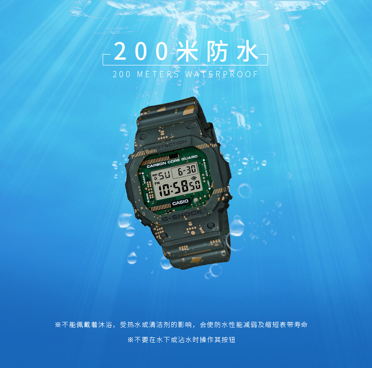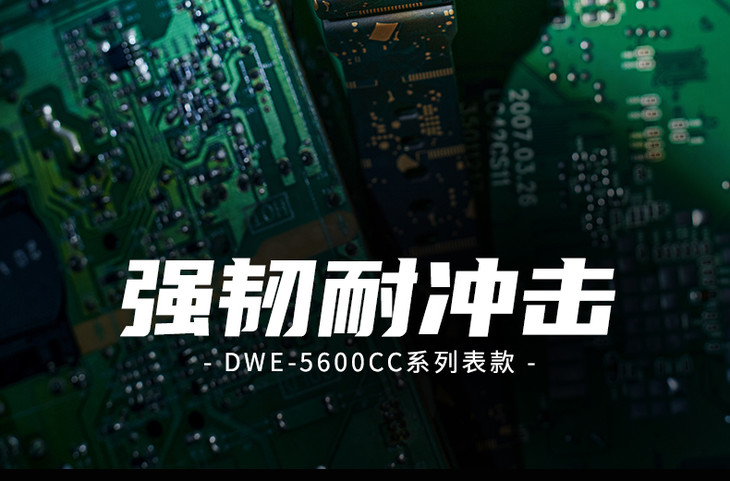 在外观设计上,采用了5600系列中实际使用的电路板的迷彩图案,并作为整只表款的主要设计元素。3款表带与2款表壳为一套搭配,全新耐冲击可换装款G-SHOCK登场。
