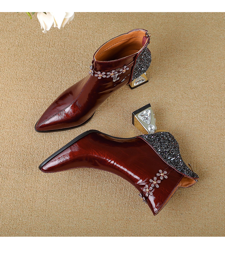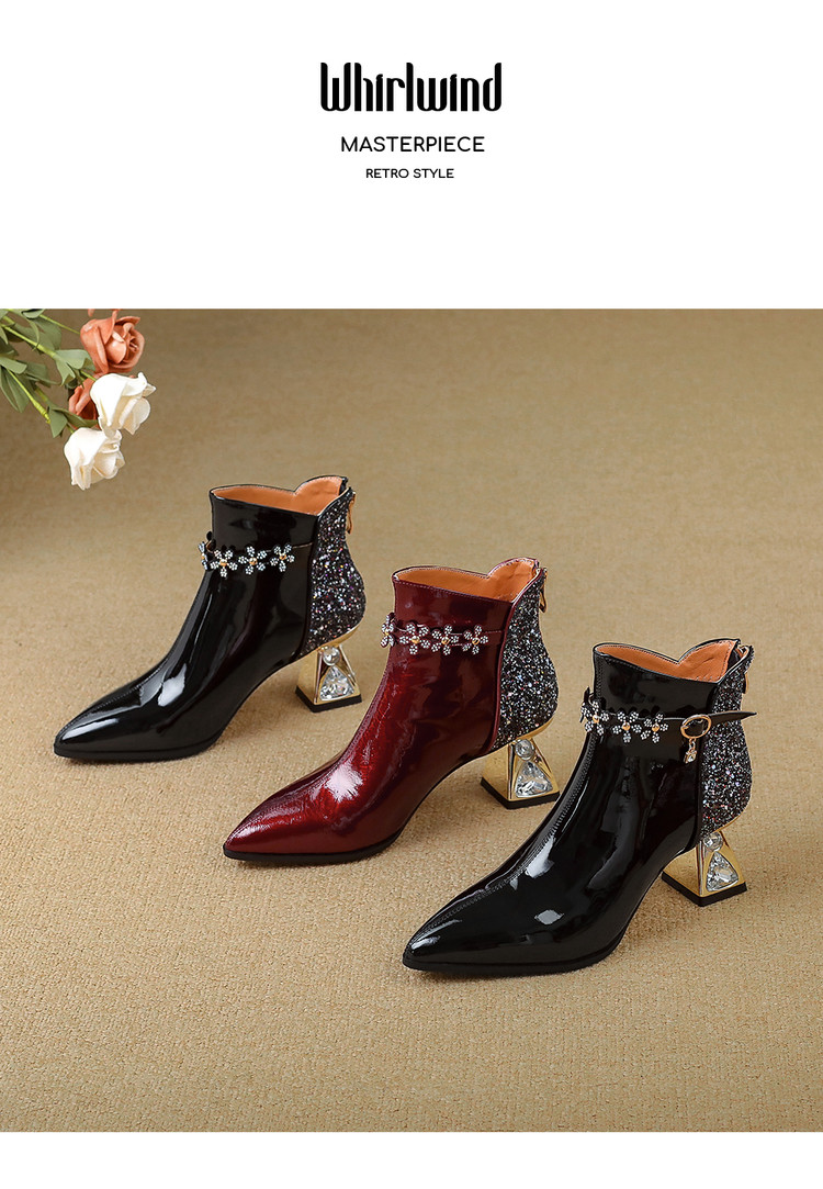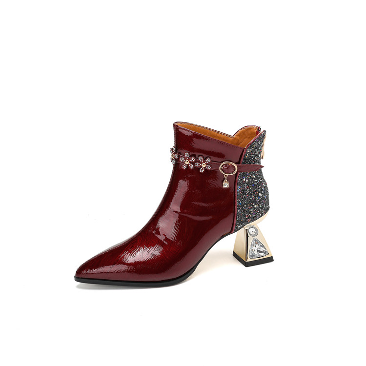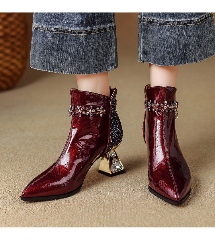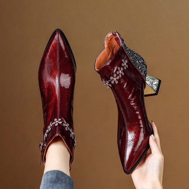 【预售5天】秋冬新款头层牛皮马丁靴女短靴粗跟尖头酒红色时尚超洋气女靴XME&898-806