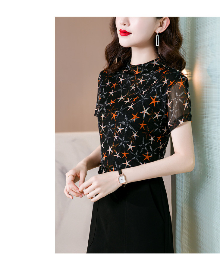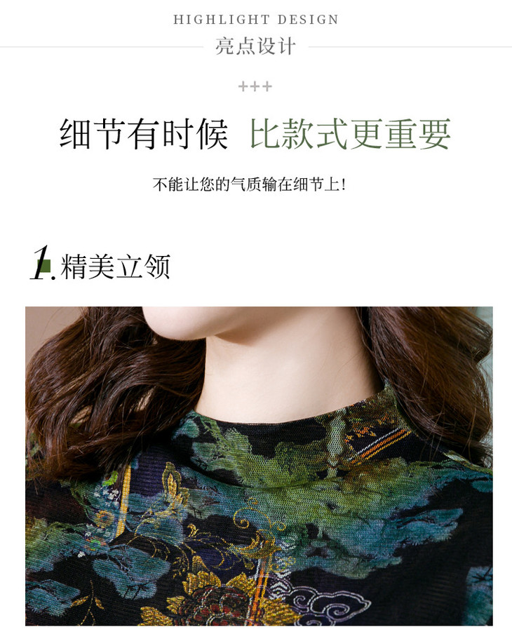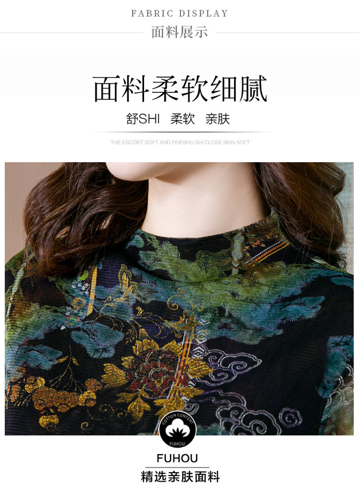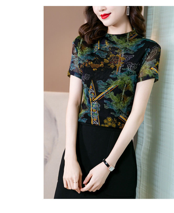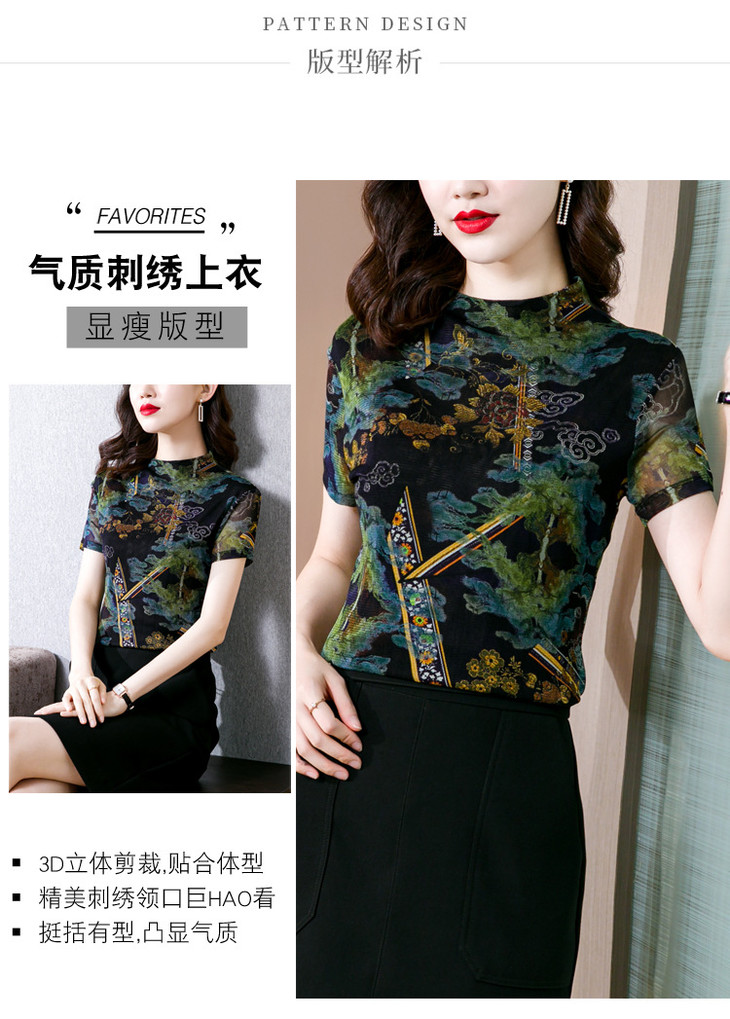 半高领仿真丝短袖T恤女网眼弹力中国风印花上衣 YX5829