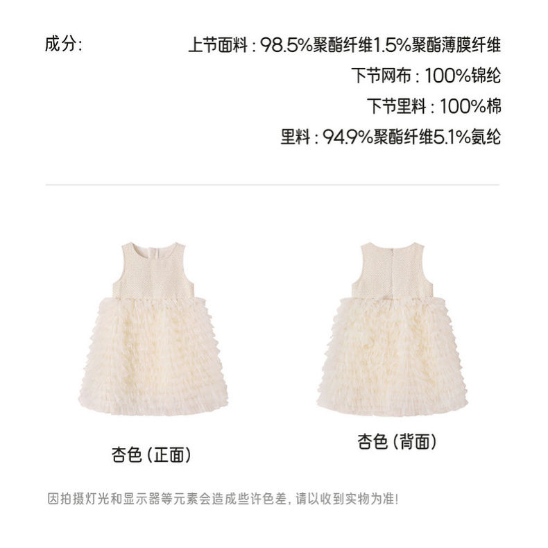 【轻奢小香风】英氏儿童连衣裙女童春秋新款背心裙杏黄色网纱公主裙可爱百搭裙子