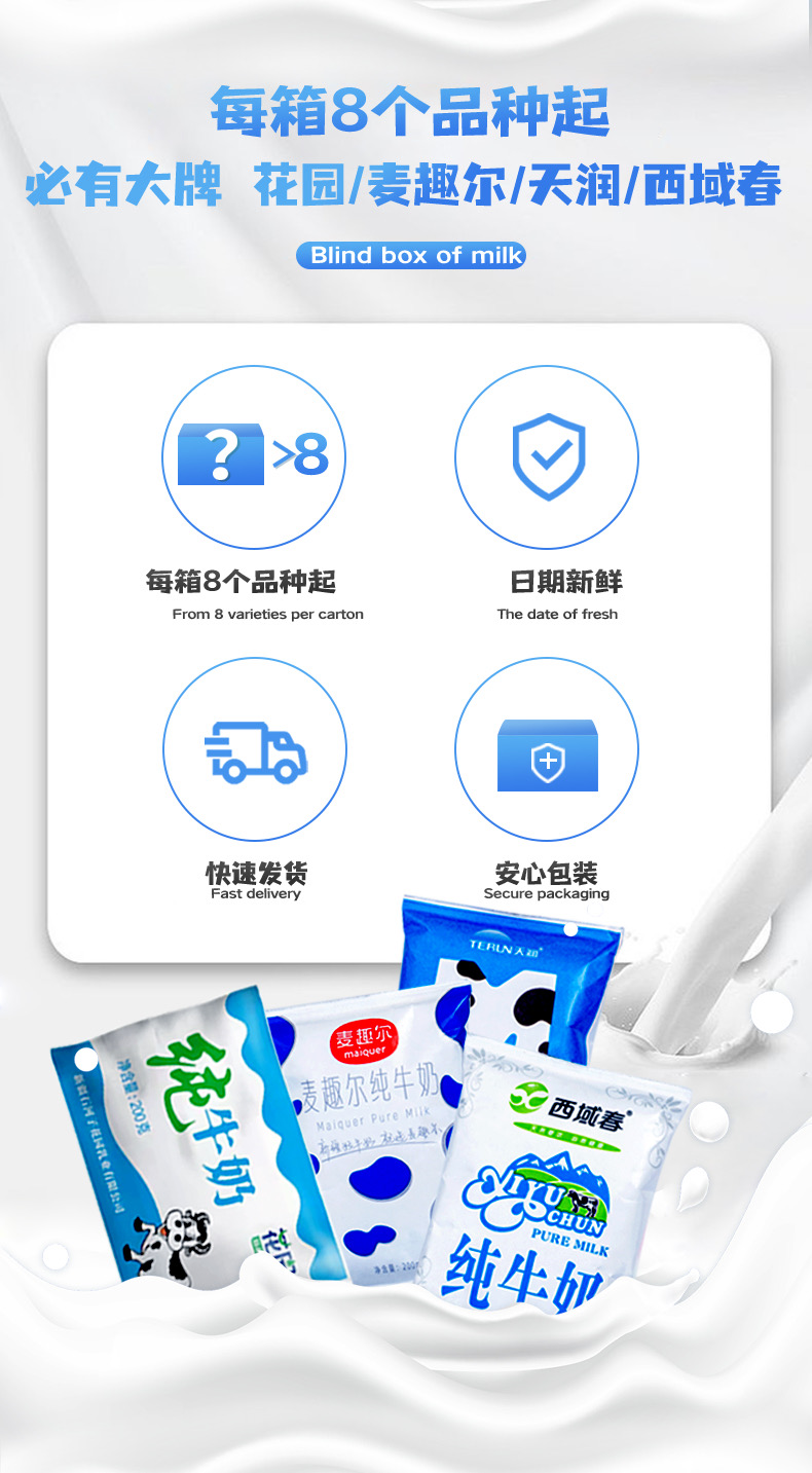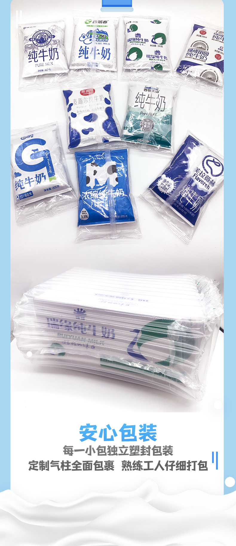 随机牛奶原箱+每包独立塑封袋+定制气柱