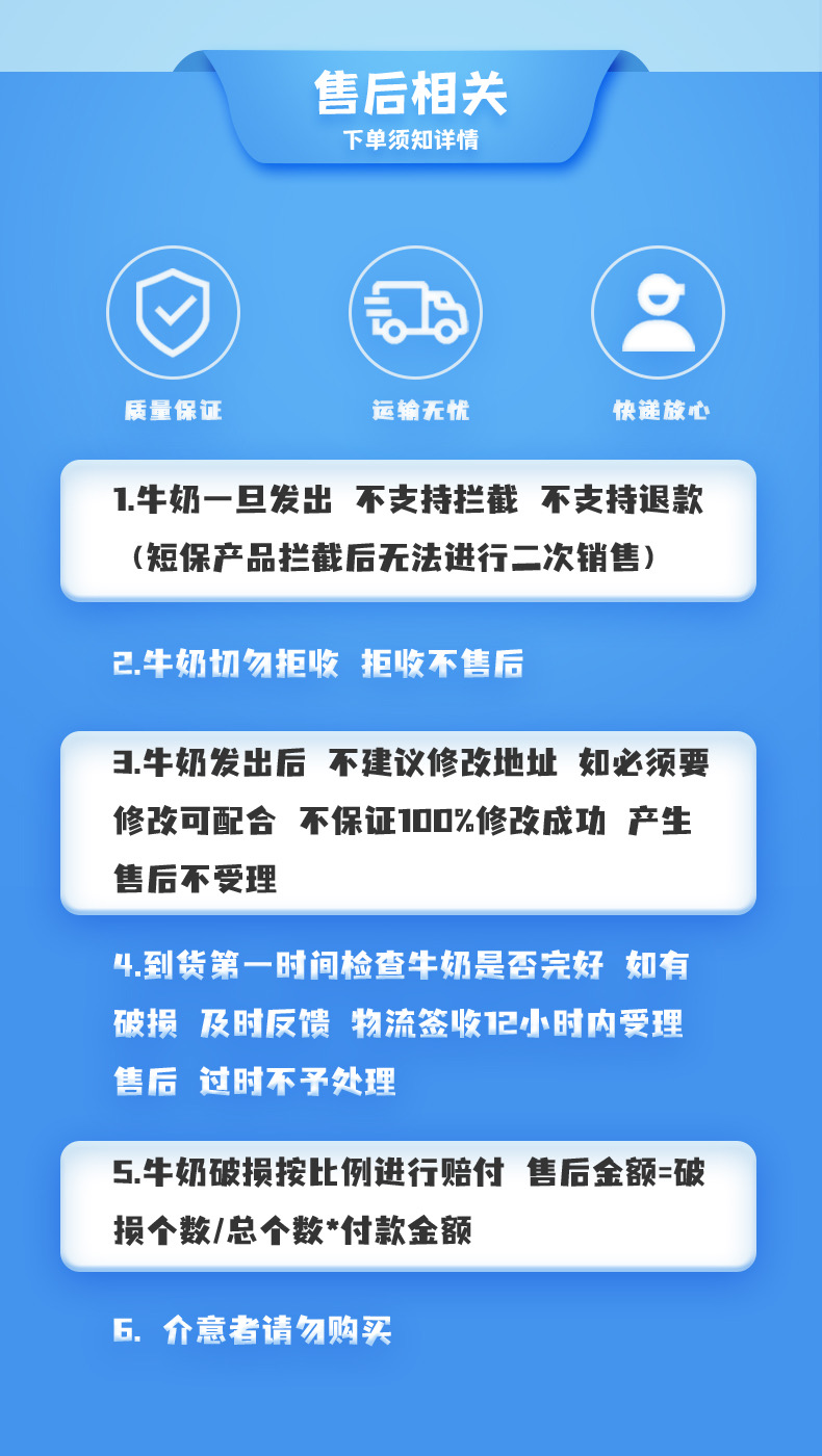 3.牛奶发出后 不建议修改地址 如必须要修改可配合 不保证100%修改成功 产生售后不受理