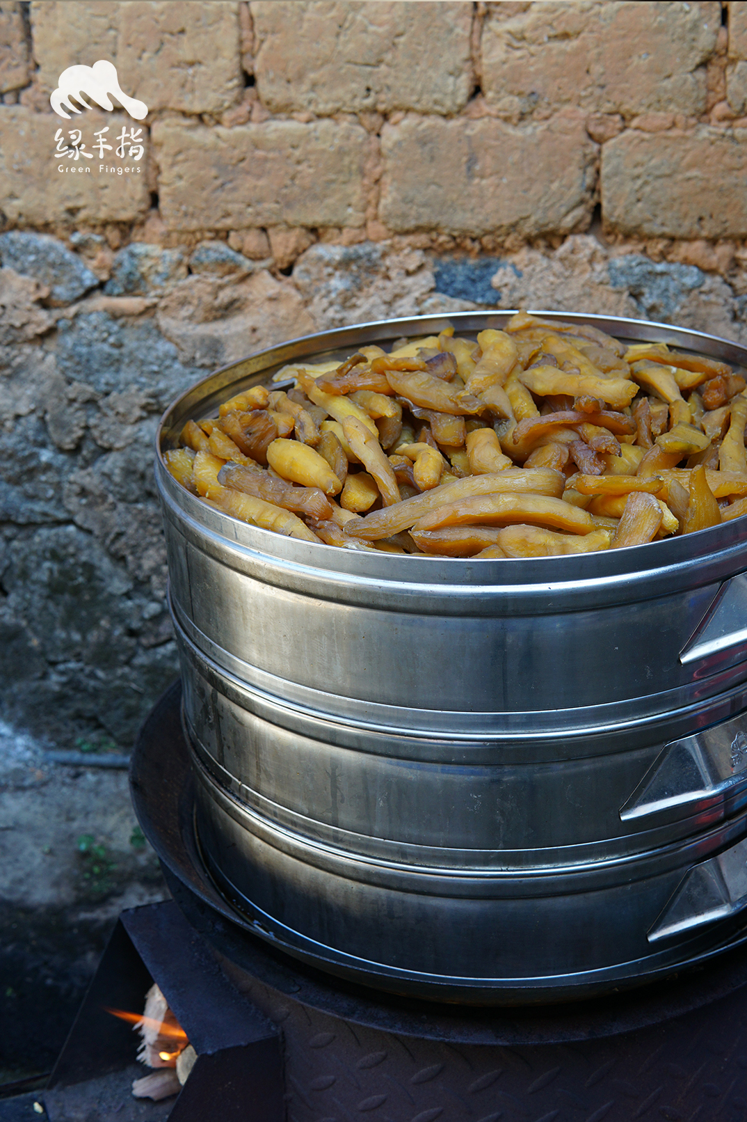 采收的红薯,为了保存糖分,洗净后红薯的第一次蒸煮要带皮,蒸煮后再趁热手工去皮(那是得多烫呀…),在晴天里日晒。然后蒸晒蒸晒,如此往复3遍。100斤红薯出20斤红薯干。