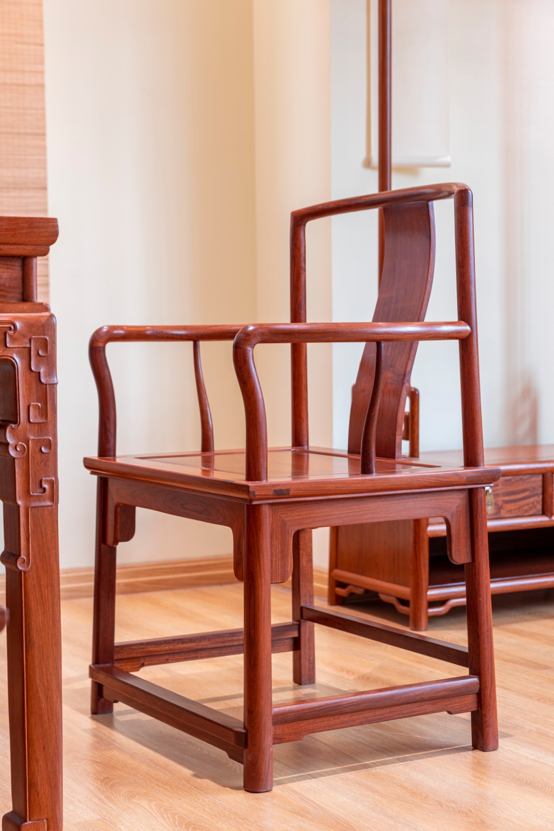 小茶椅 南官帽椅:此南官帽椅以缅甸花梨木制成,红润有泽。搭脑后弯,造形弯弧美观,三弯靠背板纹理流畅美观,不雕纹饰。扶手先外弯又向内收,线条柔婉流畅,兼顾乘坐的舒适性。后腿上截向下穿过椅盘成为腿足,前腿亦为相同造法。扶手与前腿鹅脖同样以挖烟袋锅榫的造法连接,联帮棍上细下粗,为典型的做法。座面硬屉,边抹光素,底修一道利落的线条。椅盘下装光素刀牙板,四足有侧脚,腿间施步步高管脚枨,结构严谨稳固。