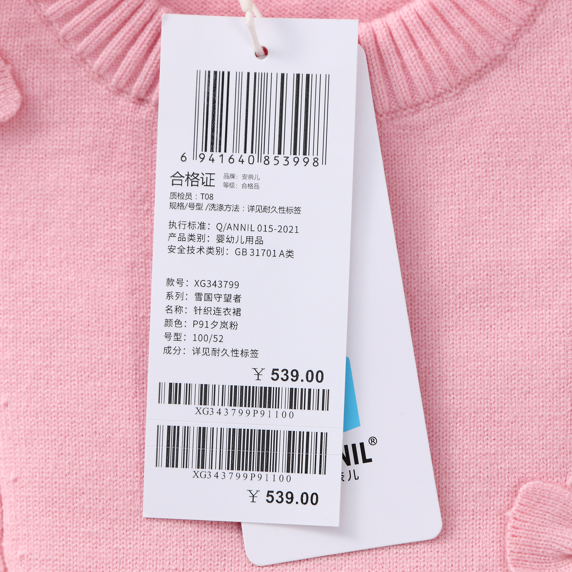 【实体店同款】女童针织连衣裙2023年冬季新款安奈儿童装XG343799