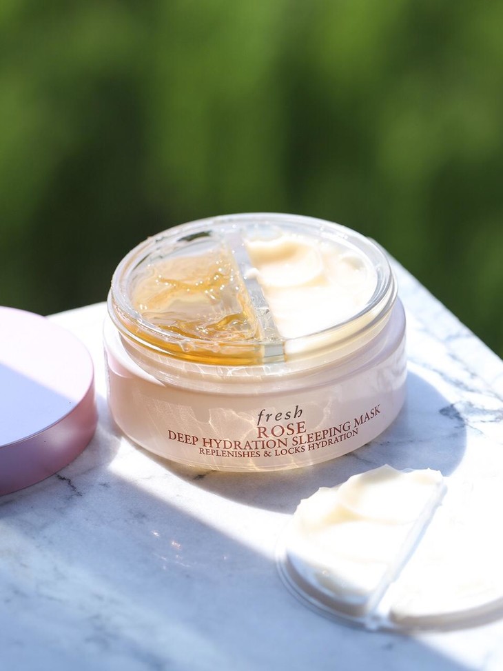 Fresh玫瑰深层保湿睡眠面膜70ML👍一左一右两种质地,1️⃣啫喱+2️⃣乳霜,香香的~重点是太好用了,连熬大夜的脸🌚都能救回来!超适合夏天☀,敷在脸上自带一种凉凉的感觉🌀,非常舒服!这款面膜主打深层补水💦💦,通过一层啫喱一层乳霜的叠加使用来使补水保湿镇定舒缓的功效加倍💞~💁使用步骤先薄涂啫喱再涂乳霜哦,这两个步骤结合了玫瑰🌹的优点和先进的定时释放液体贴片,使补水保湿镇定舒缓的功效发挥到极致!👏👏