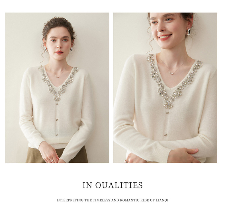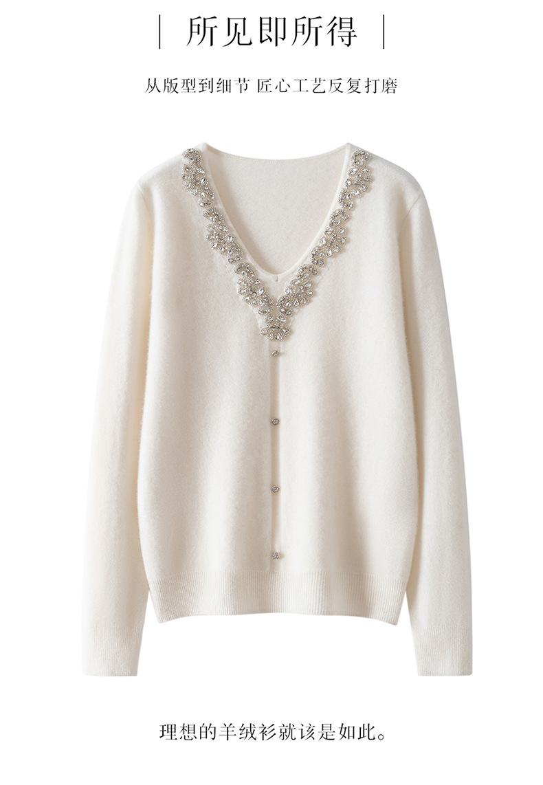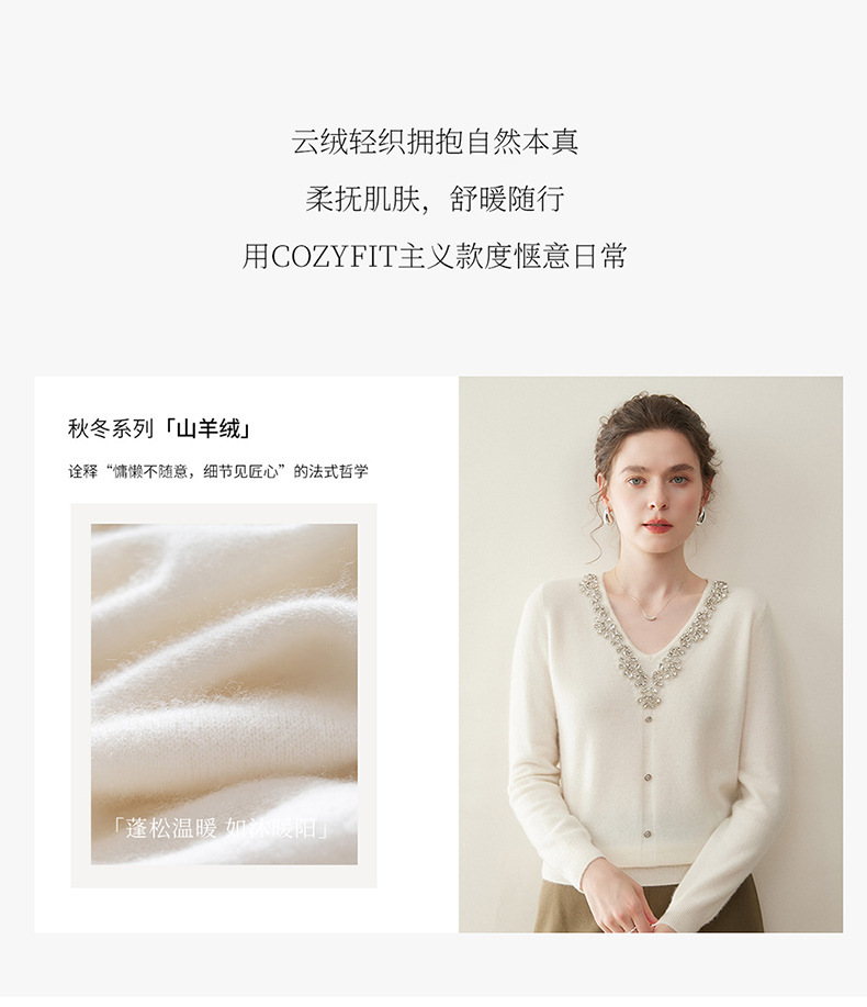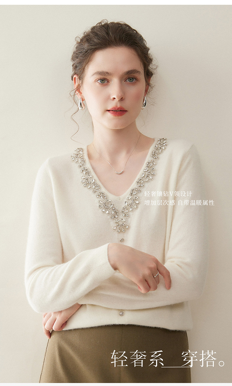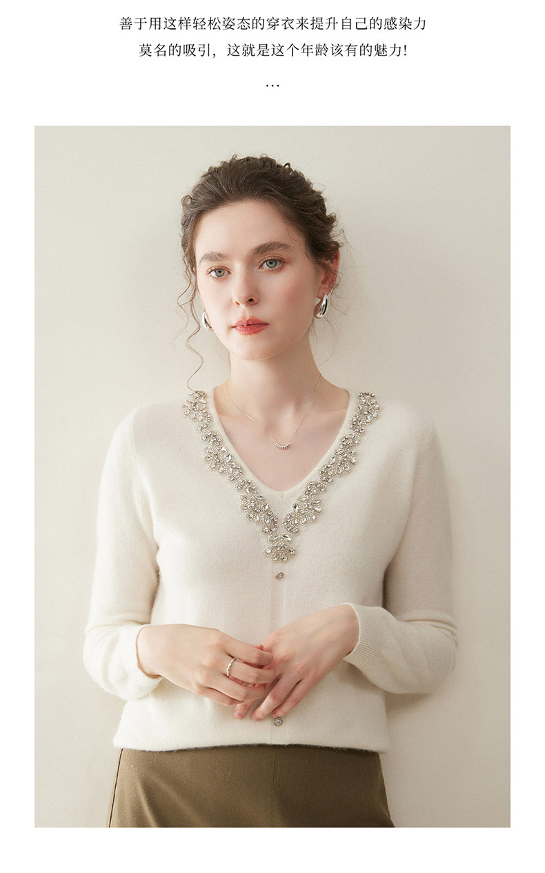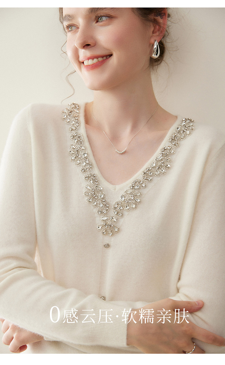 「自」全新升级【铂金会员422/天猫569/差价147】(23147)洛诗琳重工镶钻羊绒上衣2025秋冬气质V领显瘦针织毛衣女
