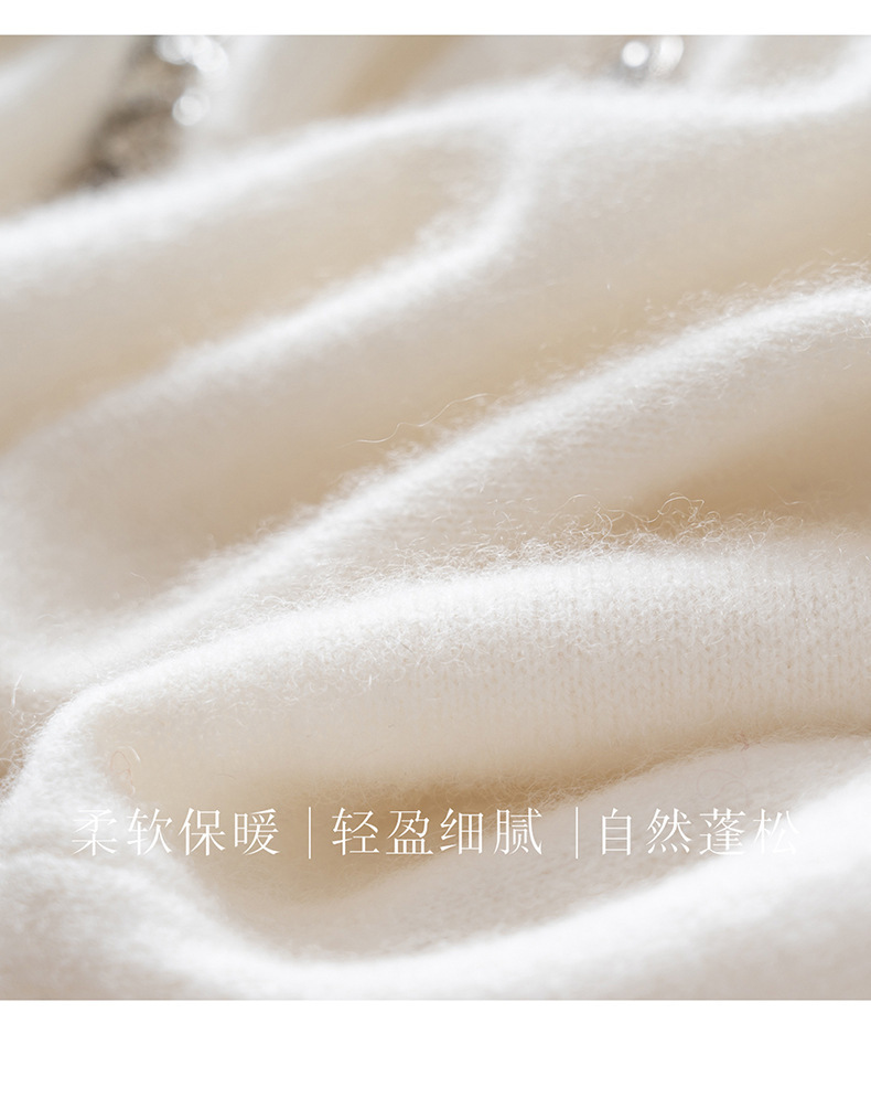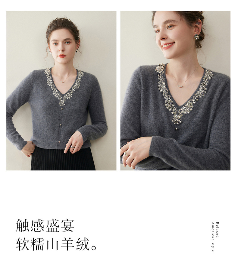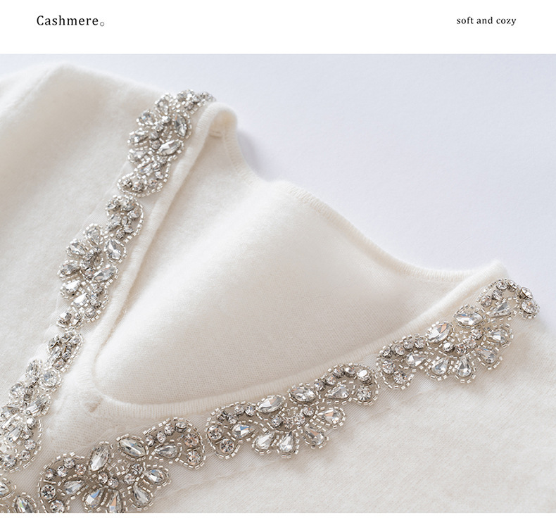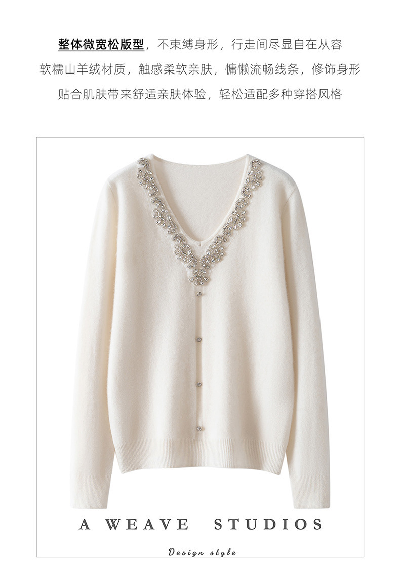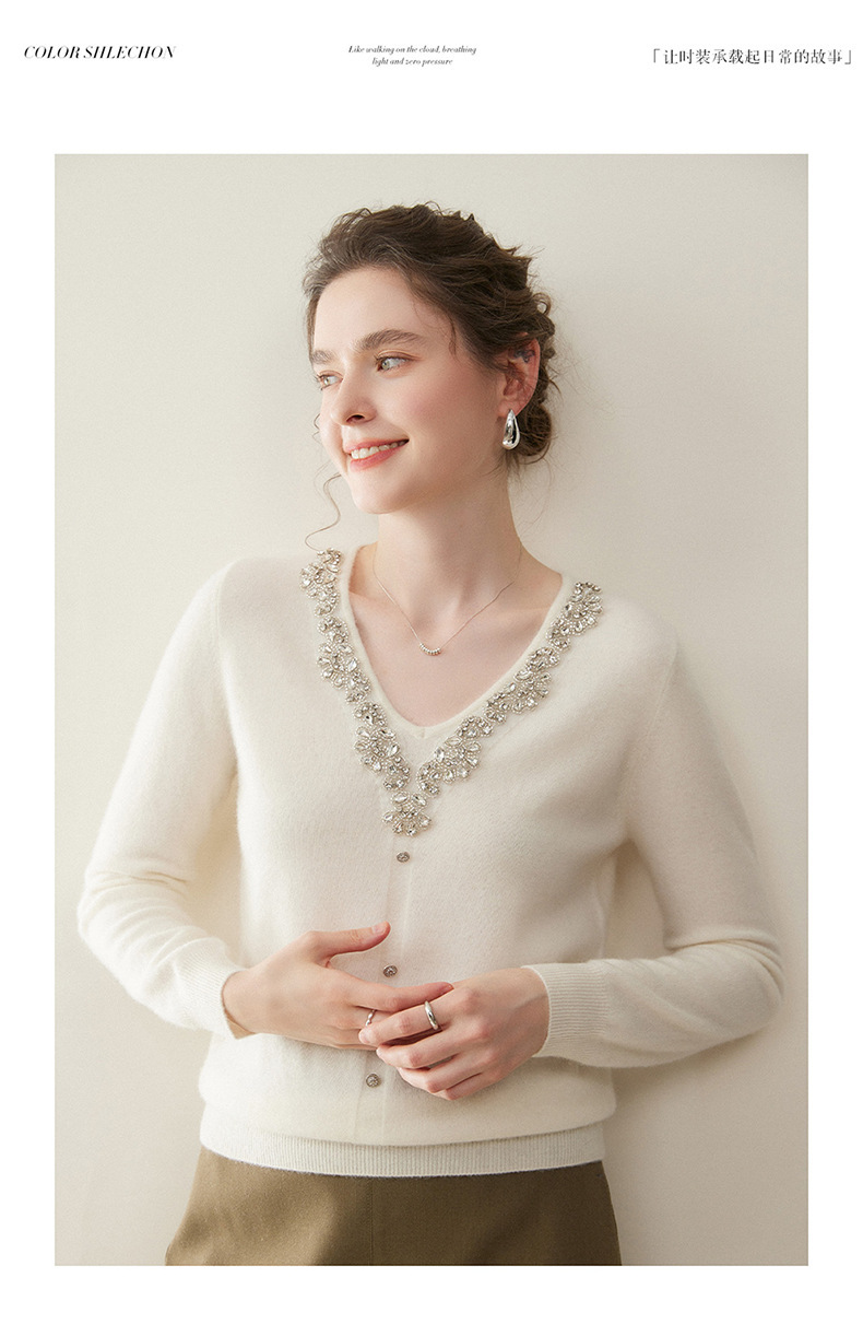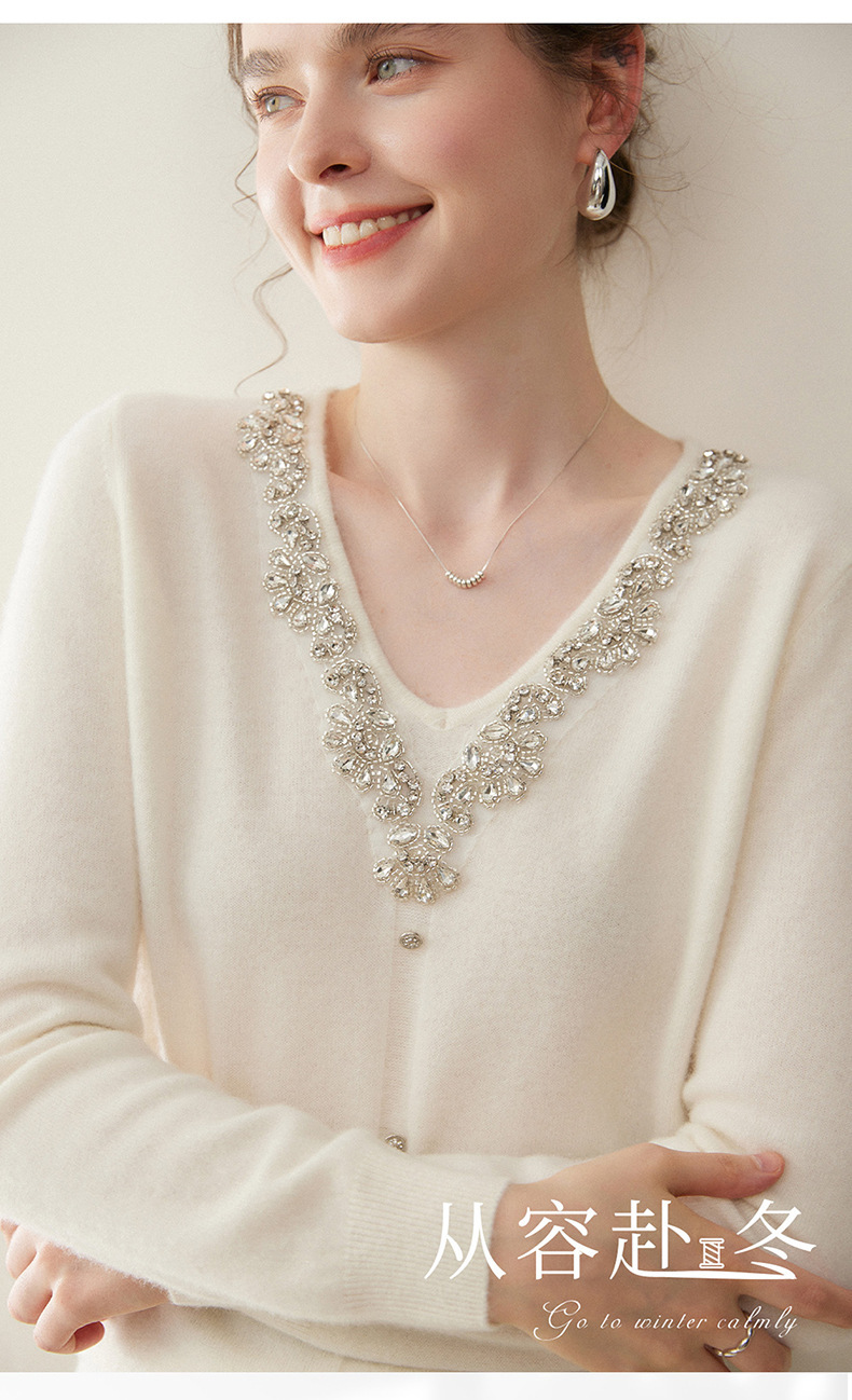 「自」全新升级【铂金会员422/天猫569/差价147】(23147)洛诗琳重工镶钻羊绒上衣2025秋冬气质V领显瘦针织毛衣女