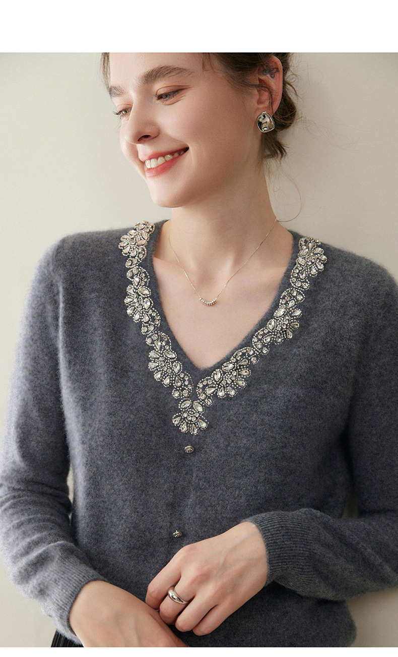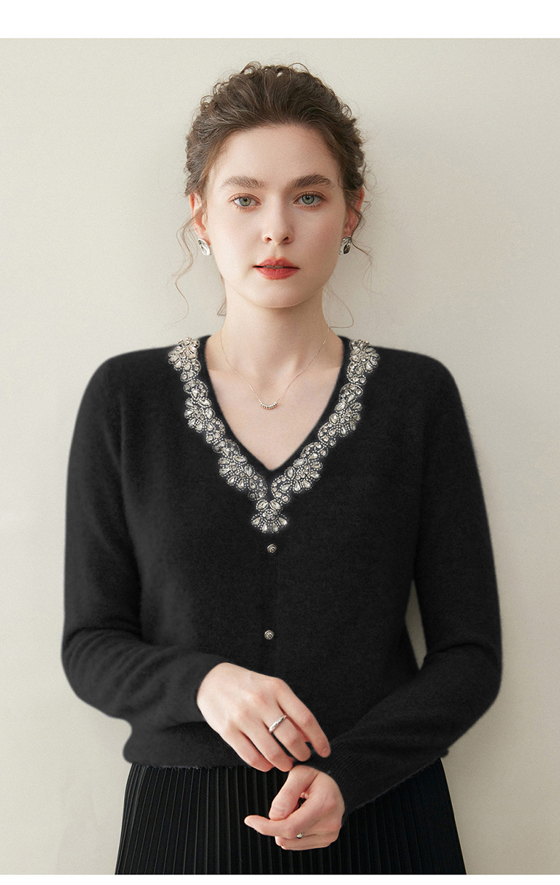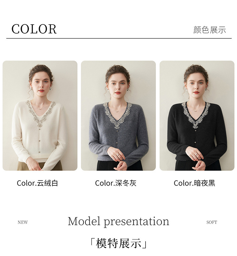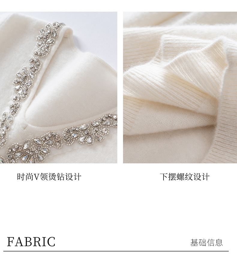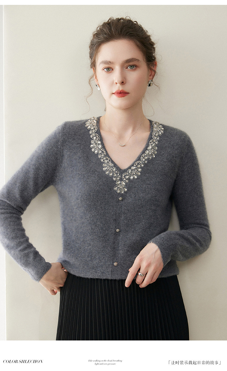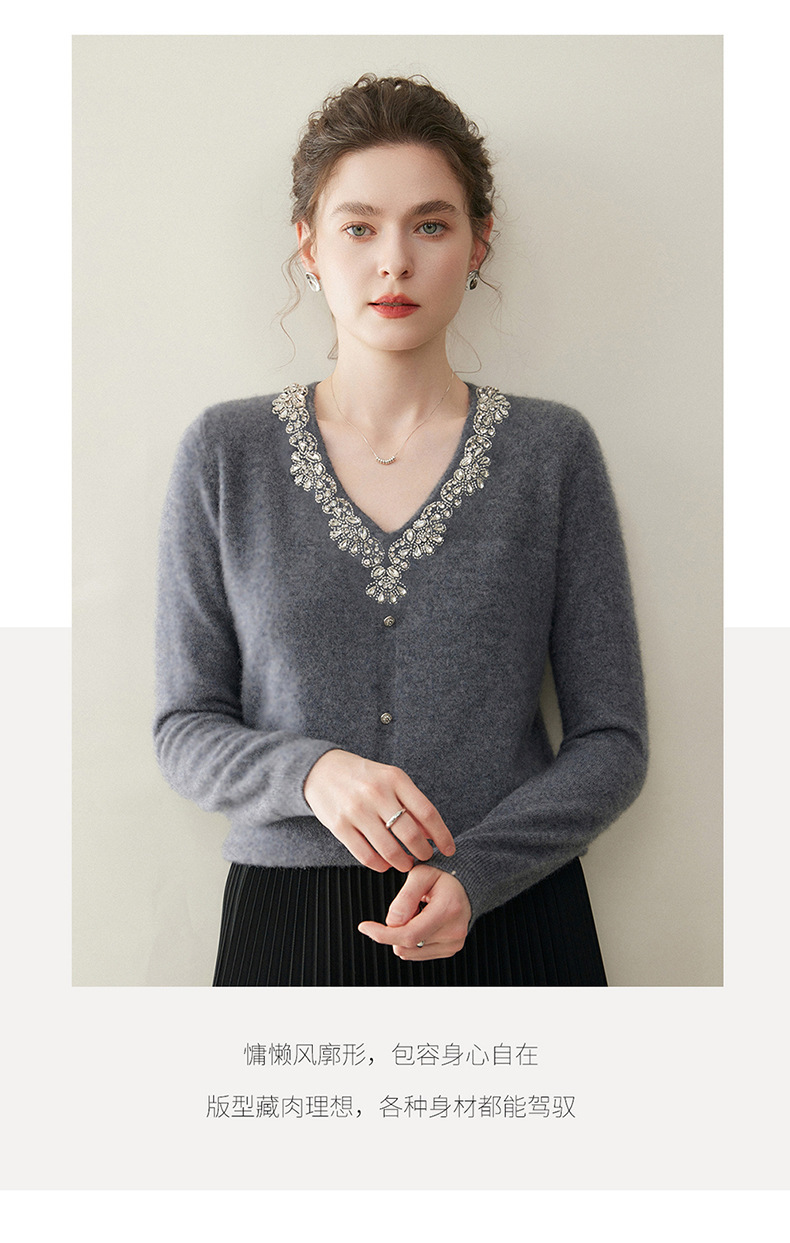 「自」全新升级【铂金会员422/天猫569/差价147】(23147)洛诗琳重工镶钻羊绒上衣2025秋冬气质V领显瘦针织毛衣女