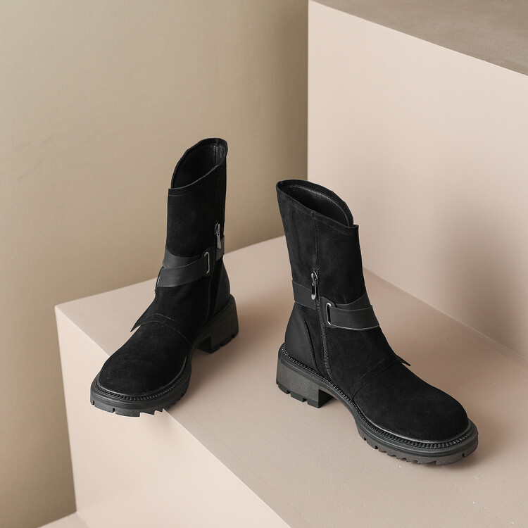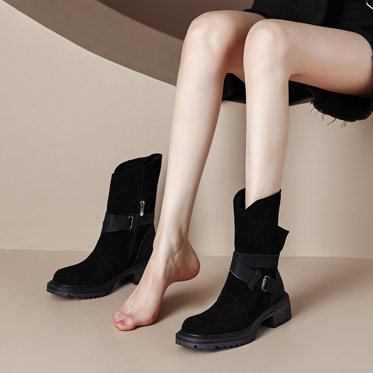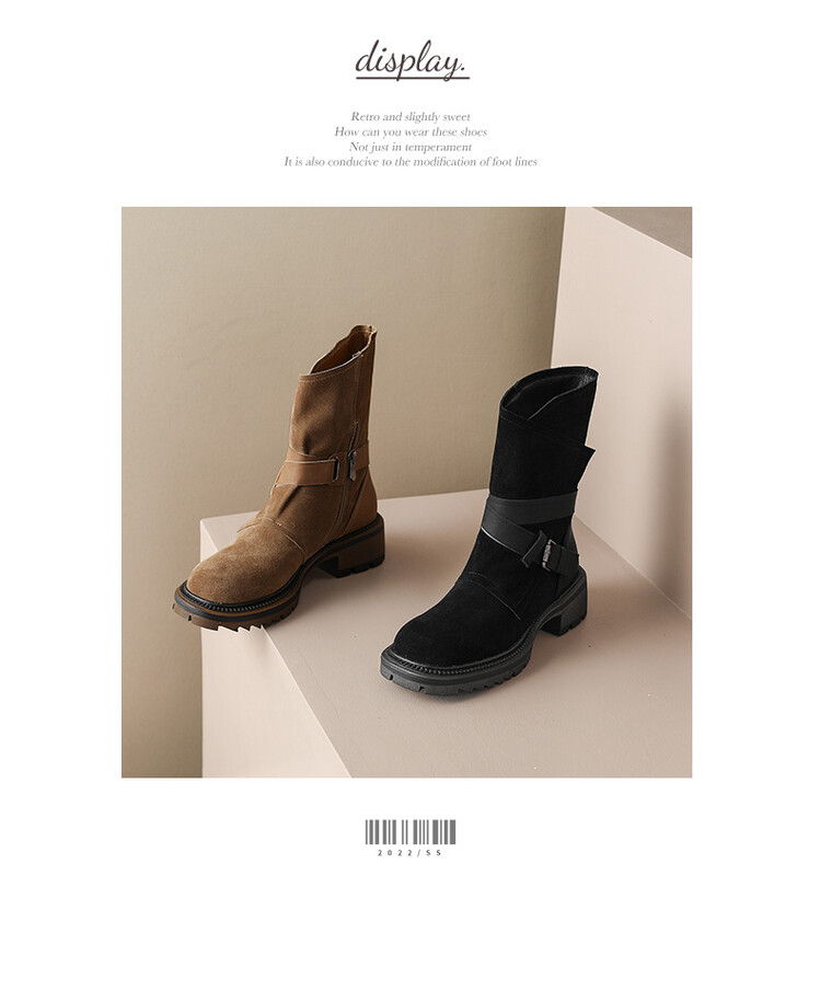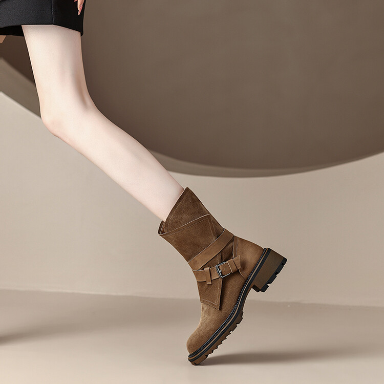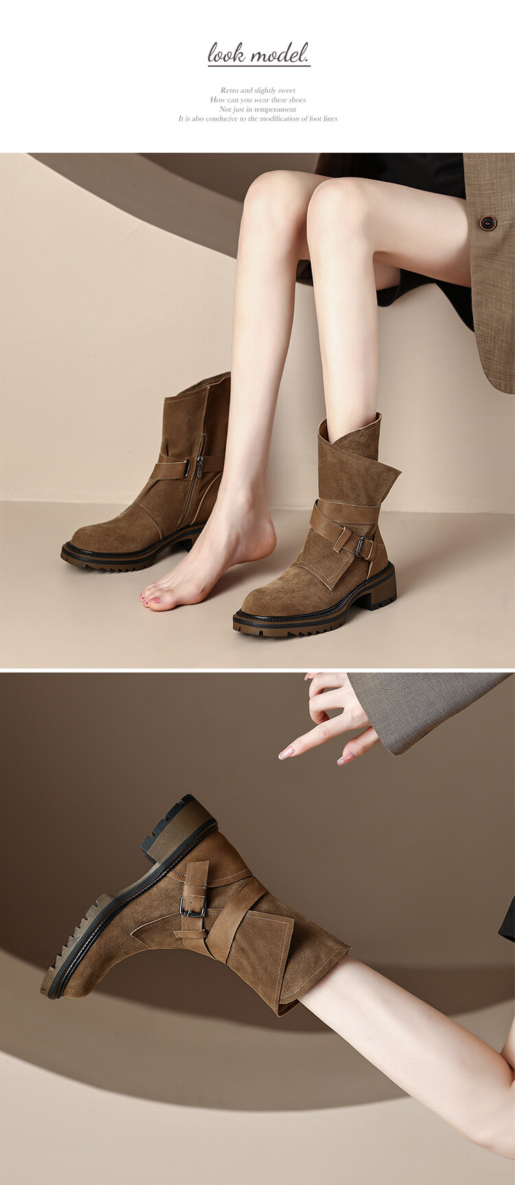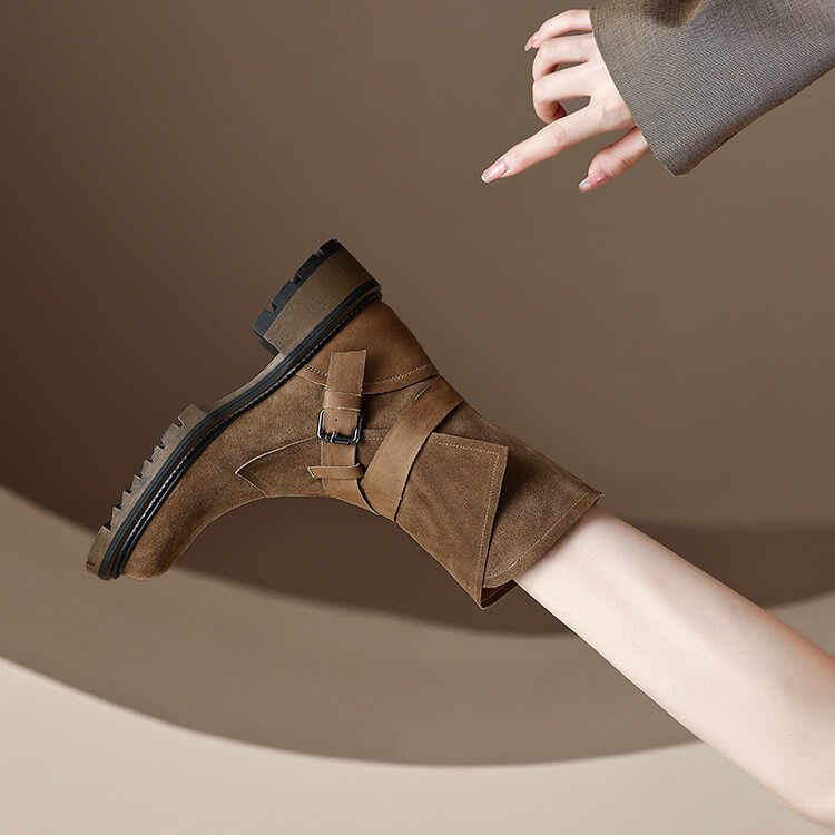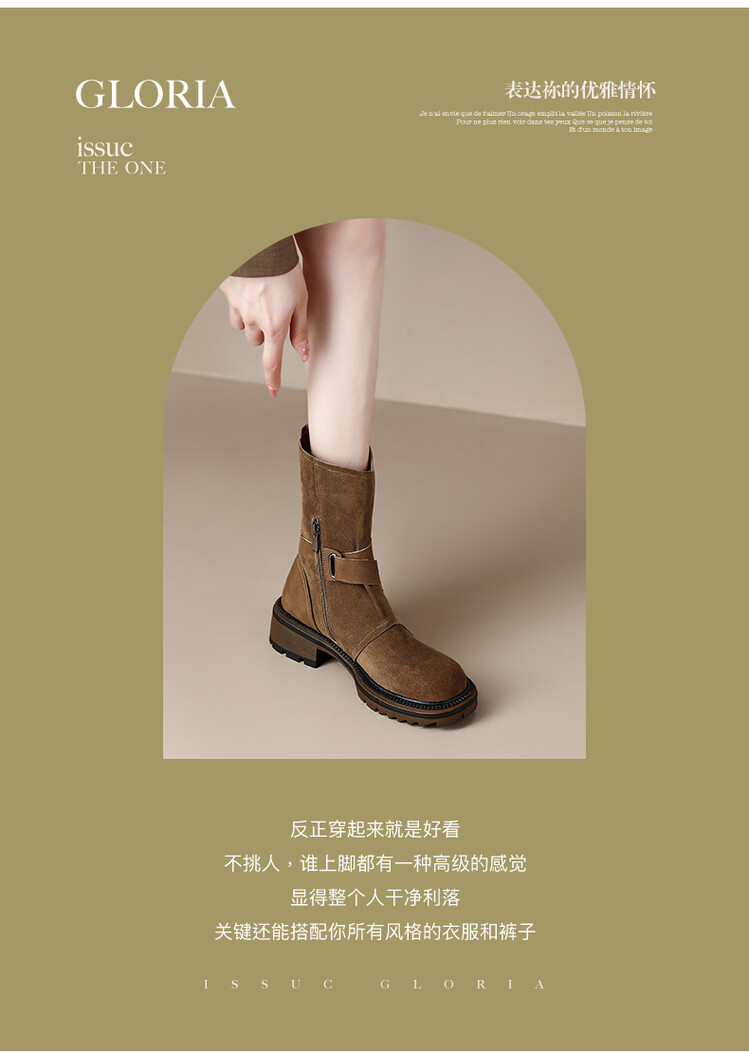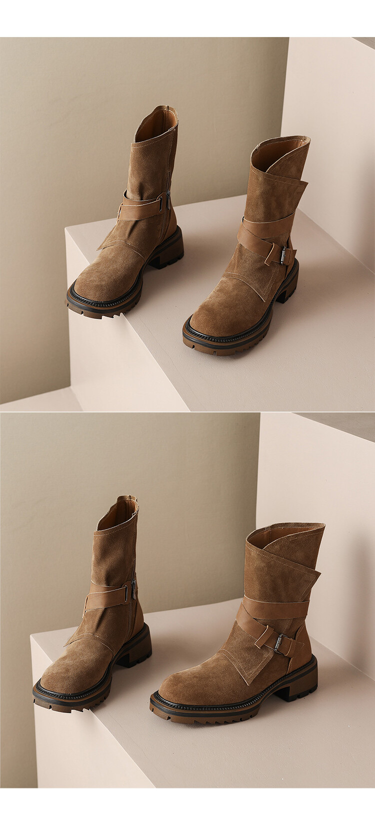 【预售5天】法式复古皮带扣慵懒风西部牛仔靴秋冬季新款绒面侧拉链沙漠靴女MX&mx22-095