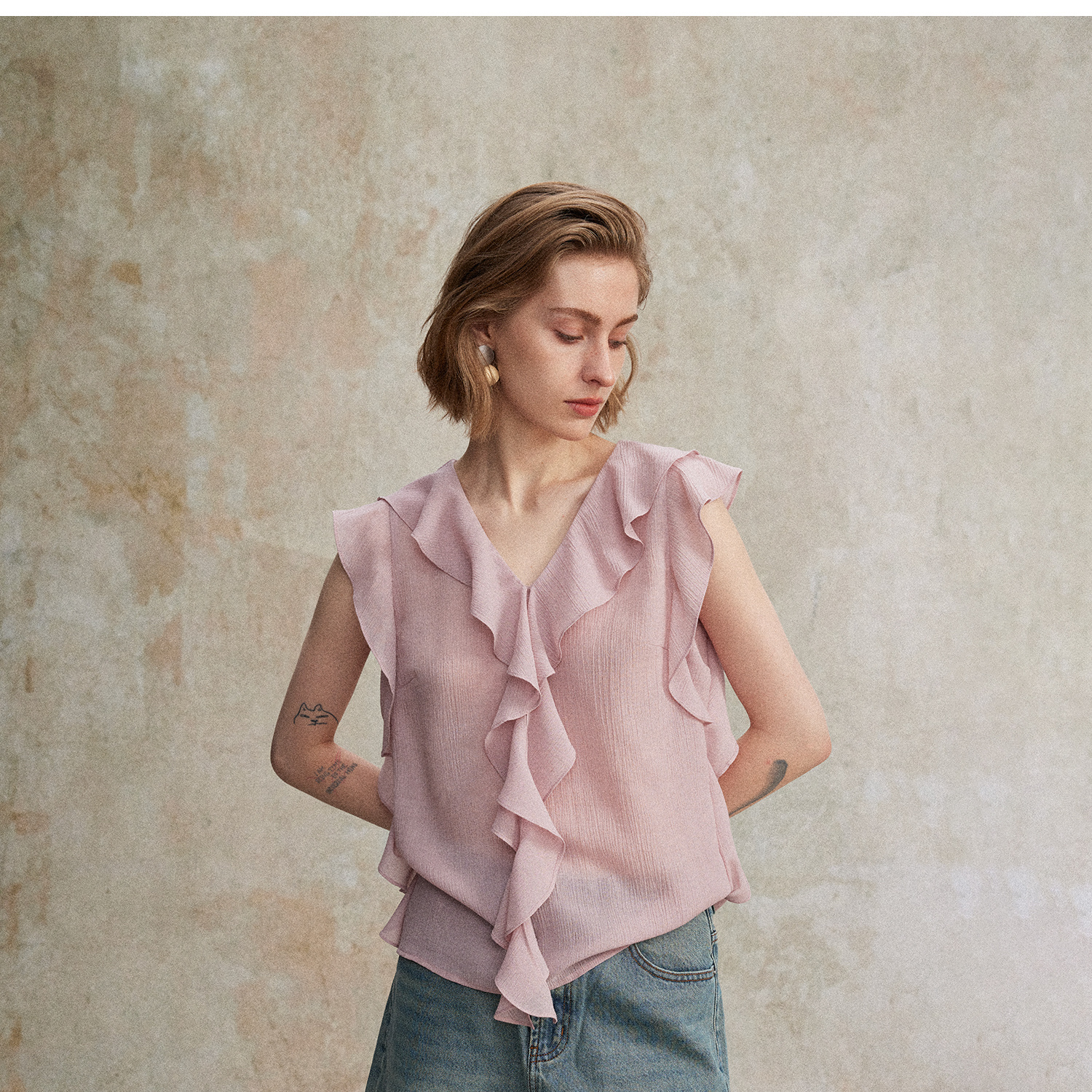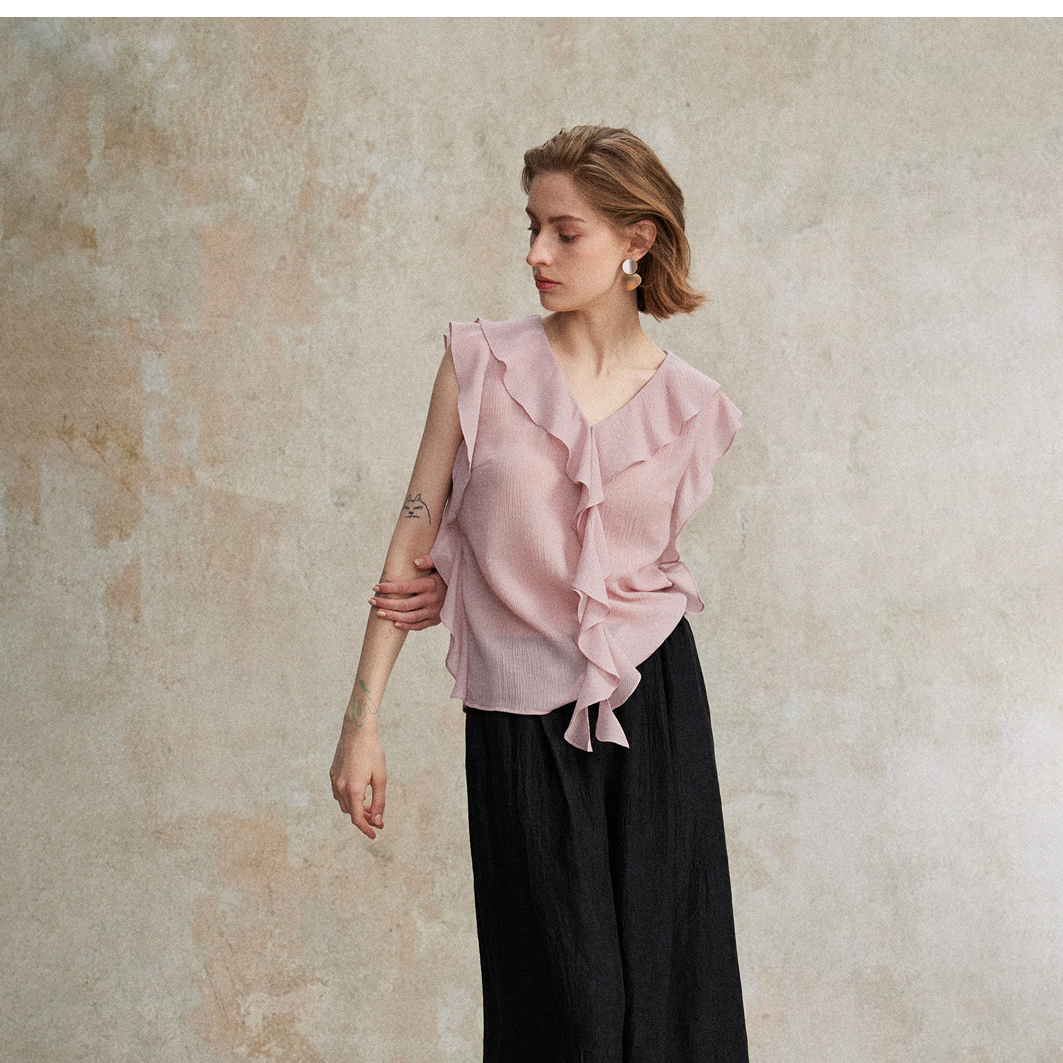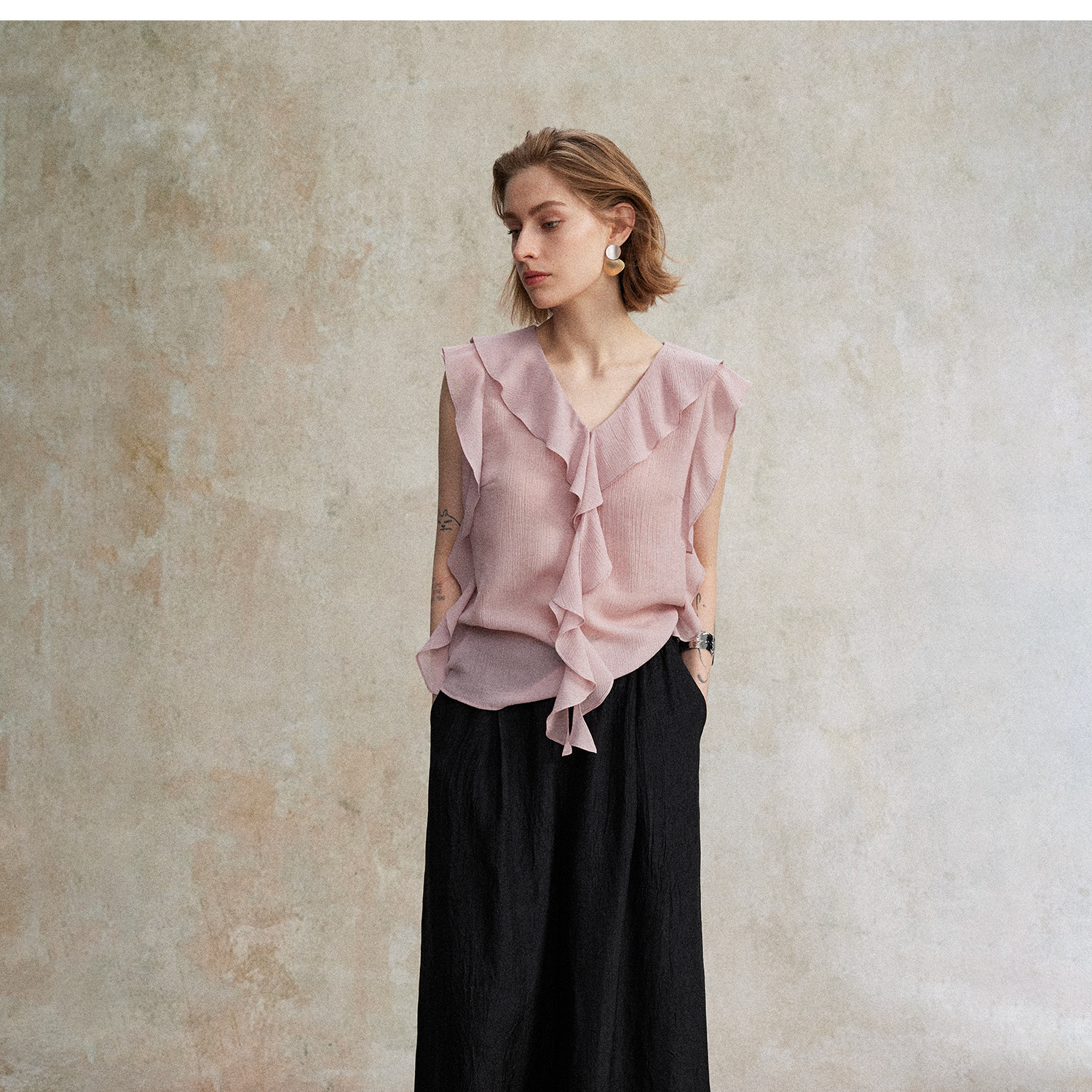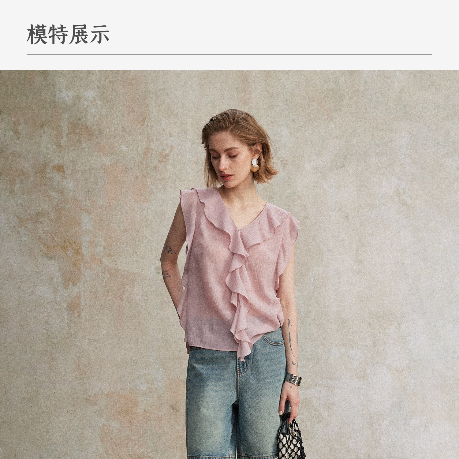 C+IMPRESS/西嘉天丝羊毛混纺 优雅法式浪漫荷叶边V领衬衫无袖上衣CS2502119