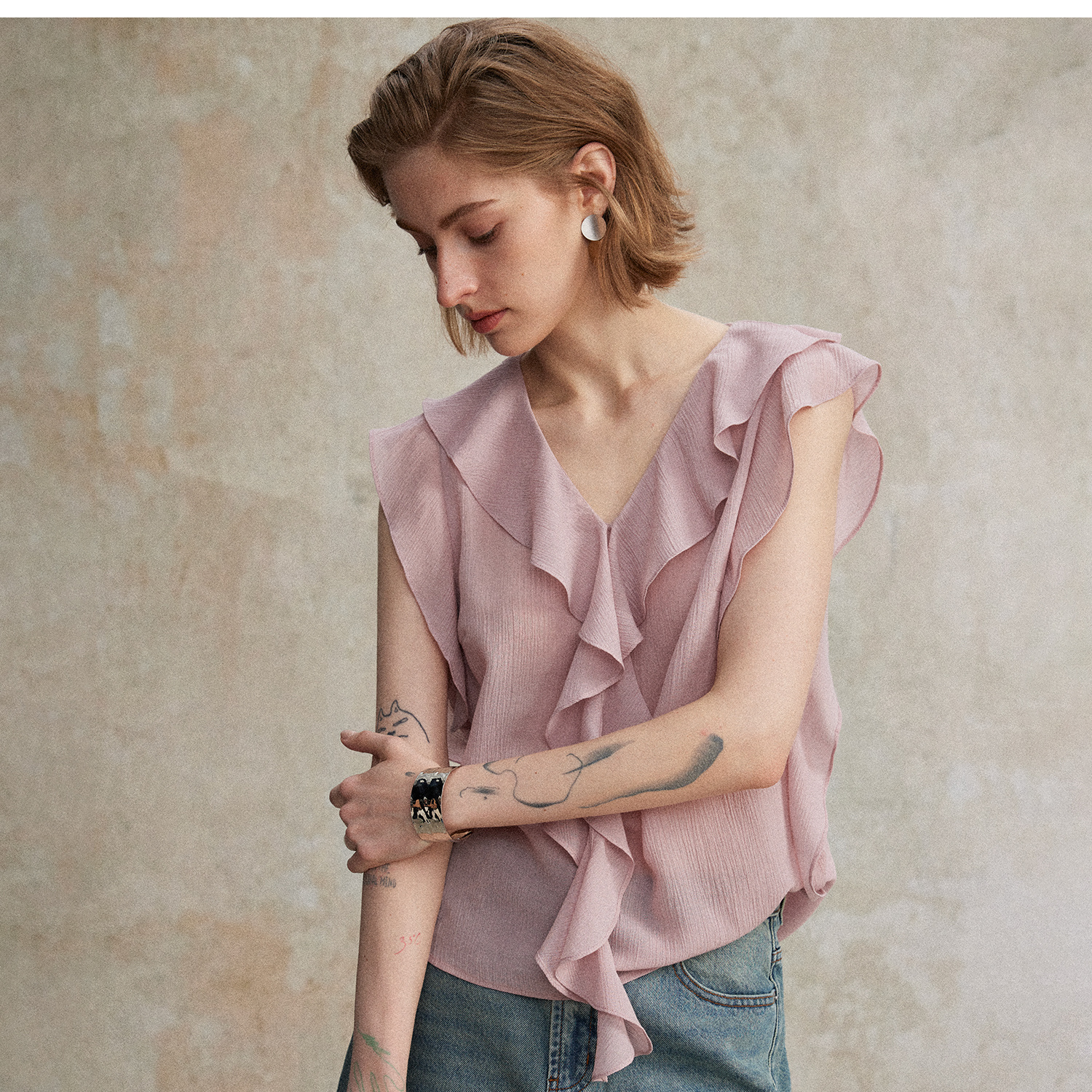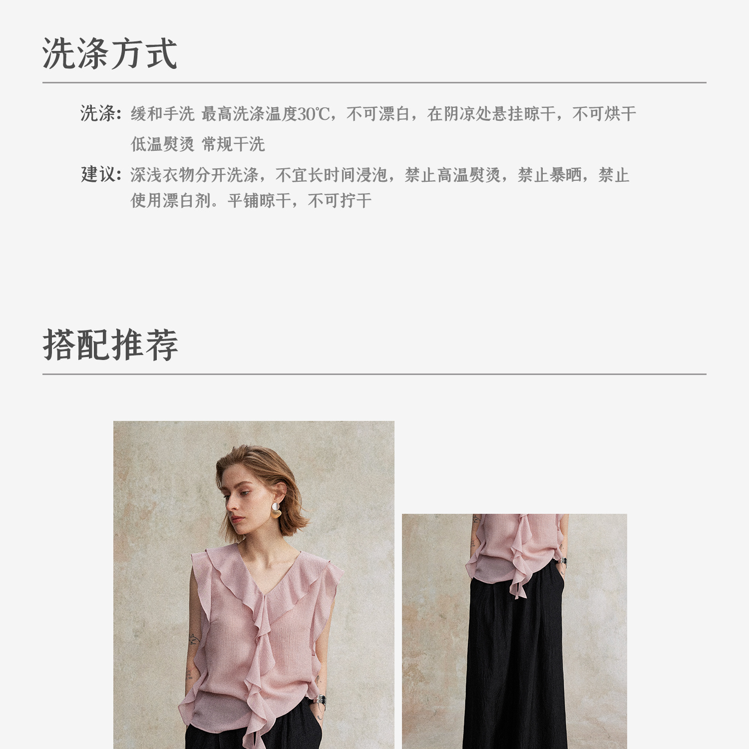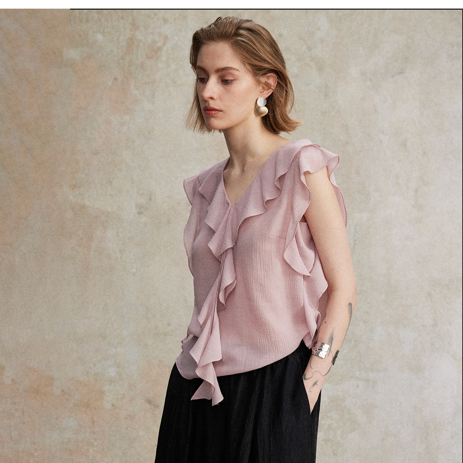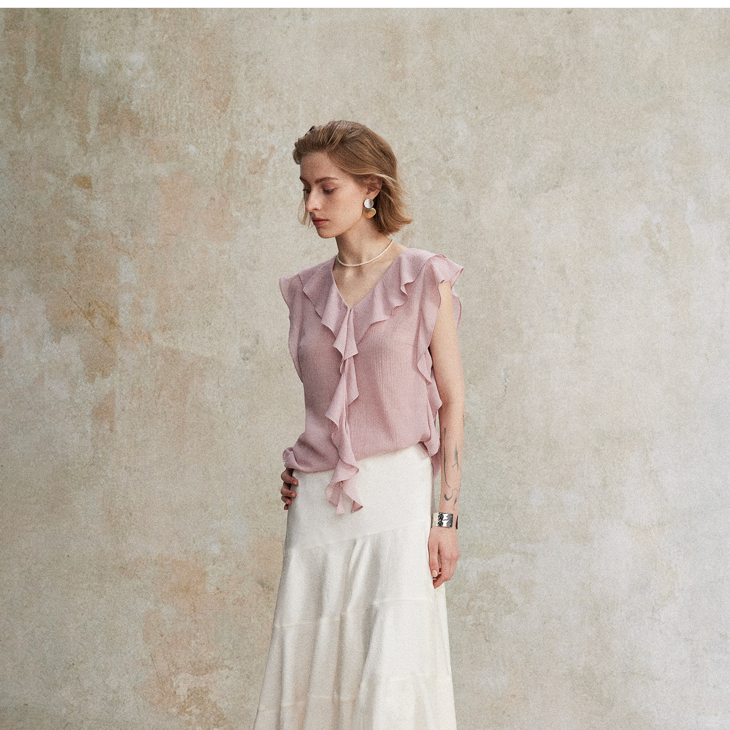 C+IMPRESS/西嘉天丝羊毛混纺 优雅法式浪漫荷叶边V领衬衫无袖上衣CS2502119