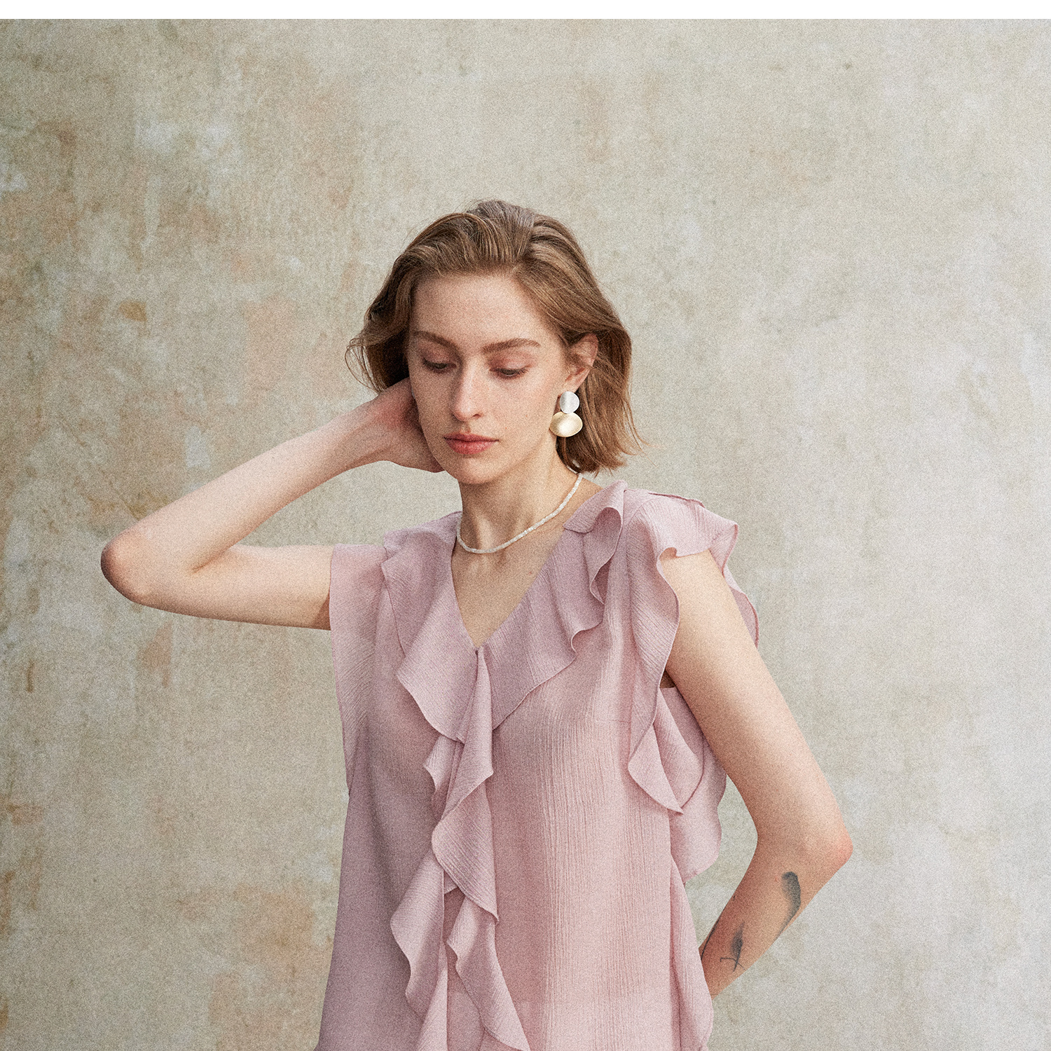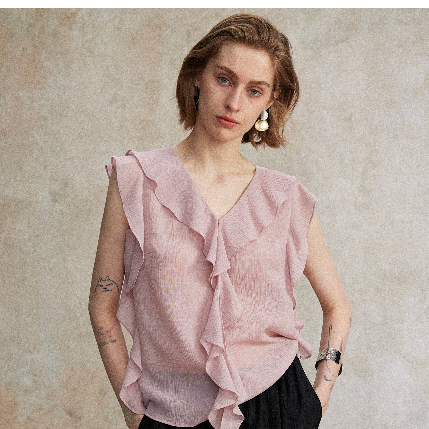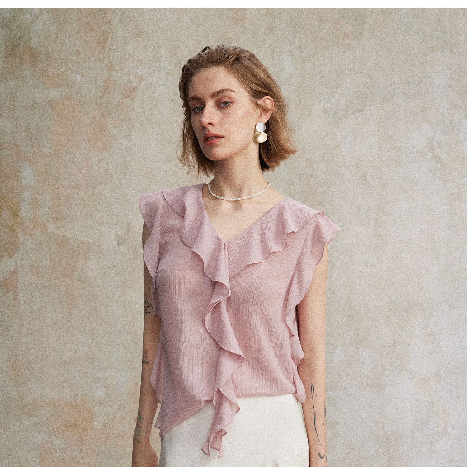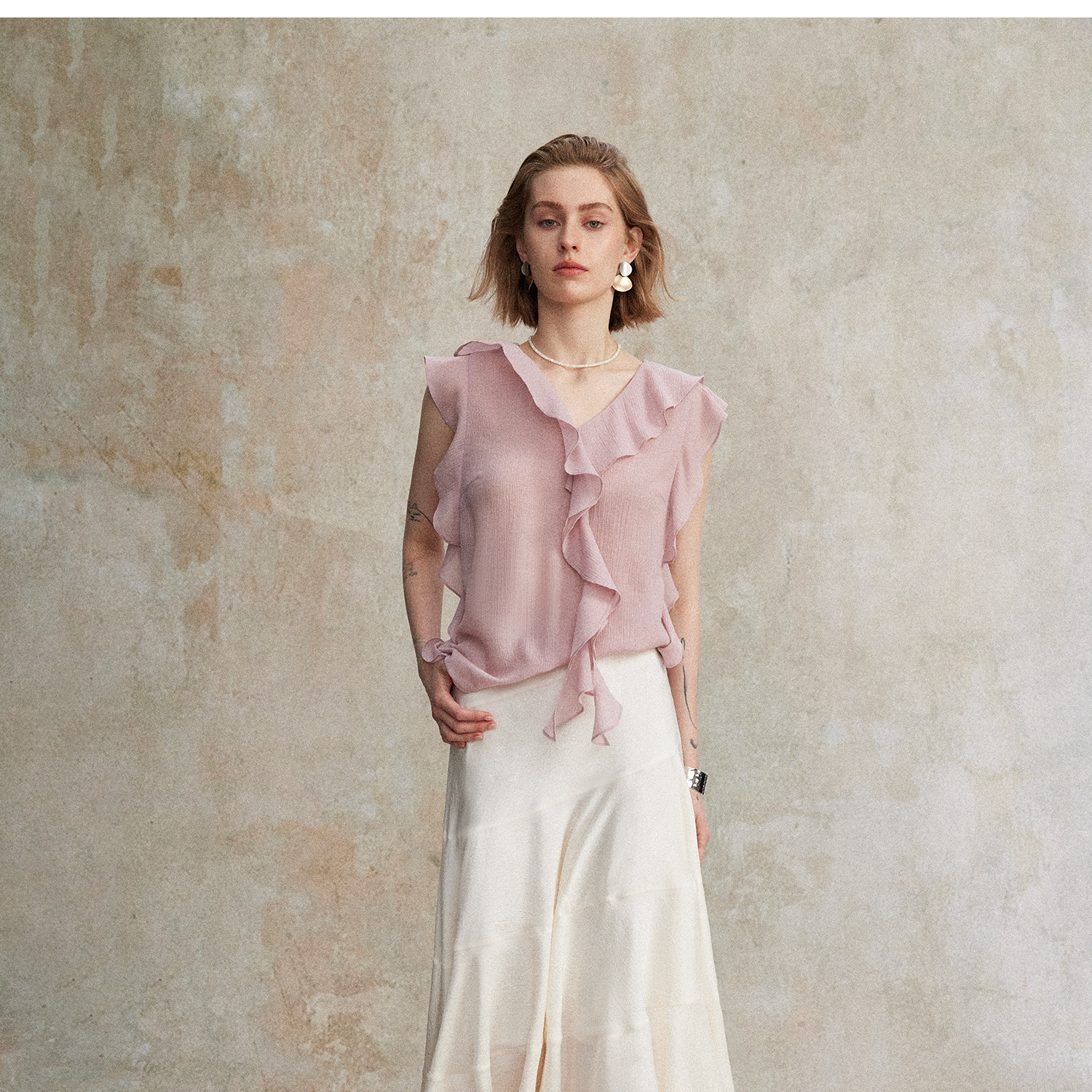 C+IMPRESS/西嘉天丝羊毛混纺 优雅法式浪漫荷叶边V领衬衫无袖上衣CS2502119