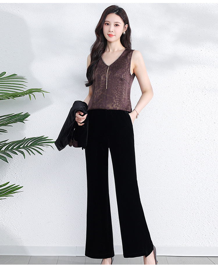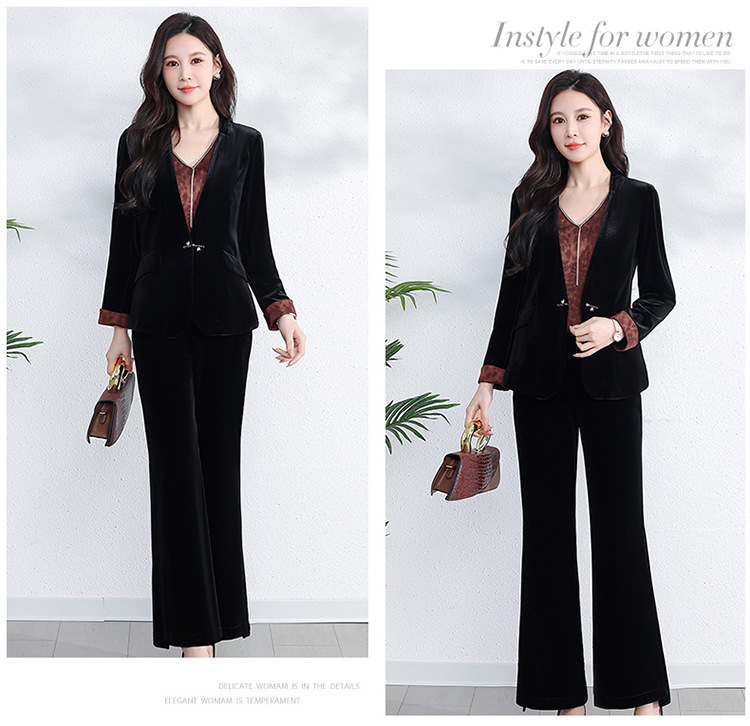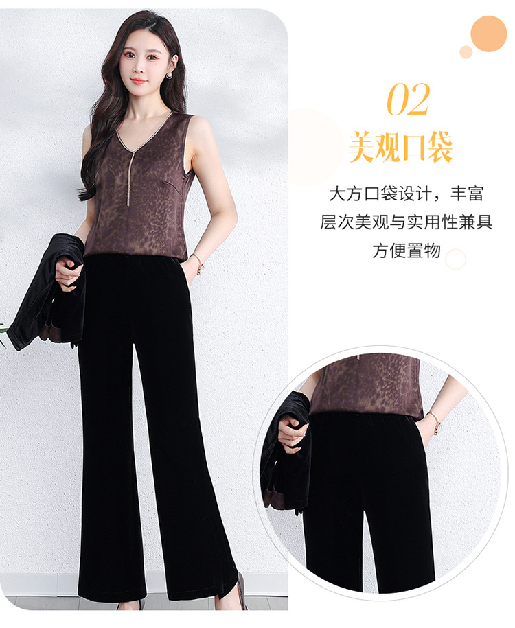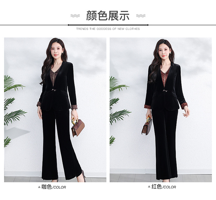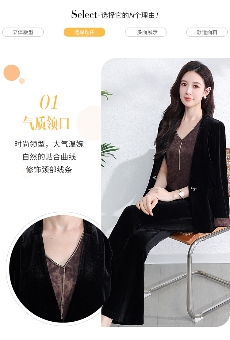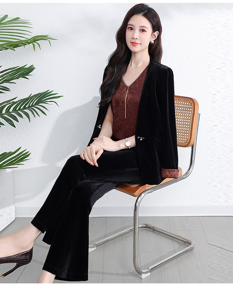 QYM 99H225-Y金丝绒三件套妈妈装打底衫+西装外套+长款微喇裤套装