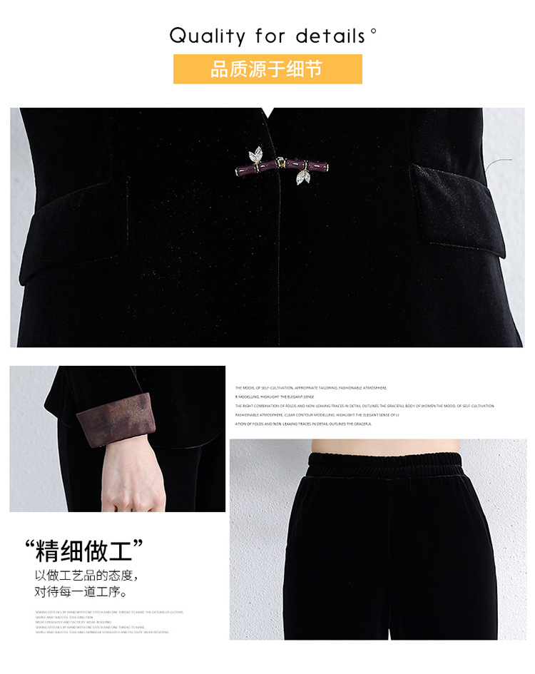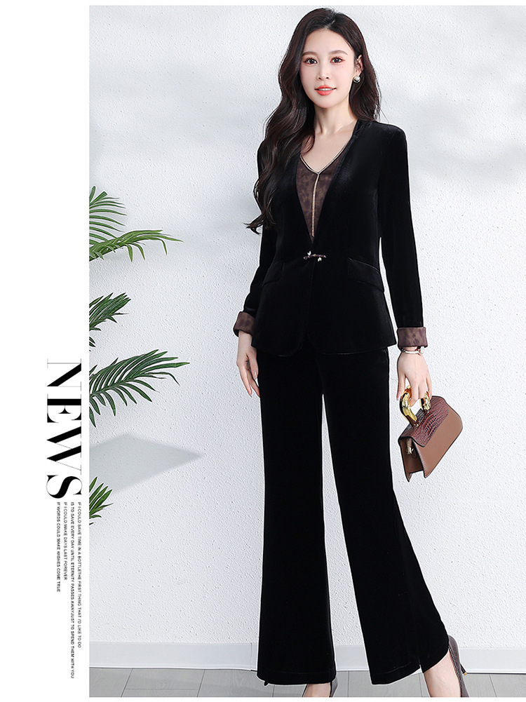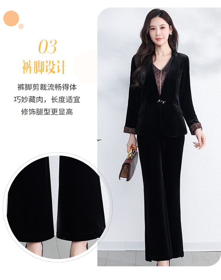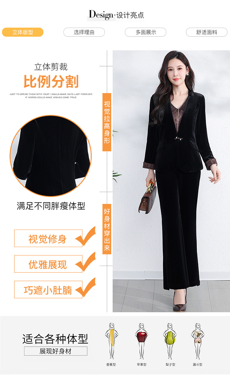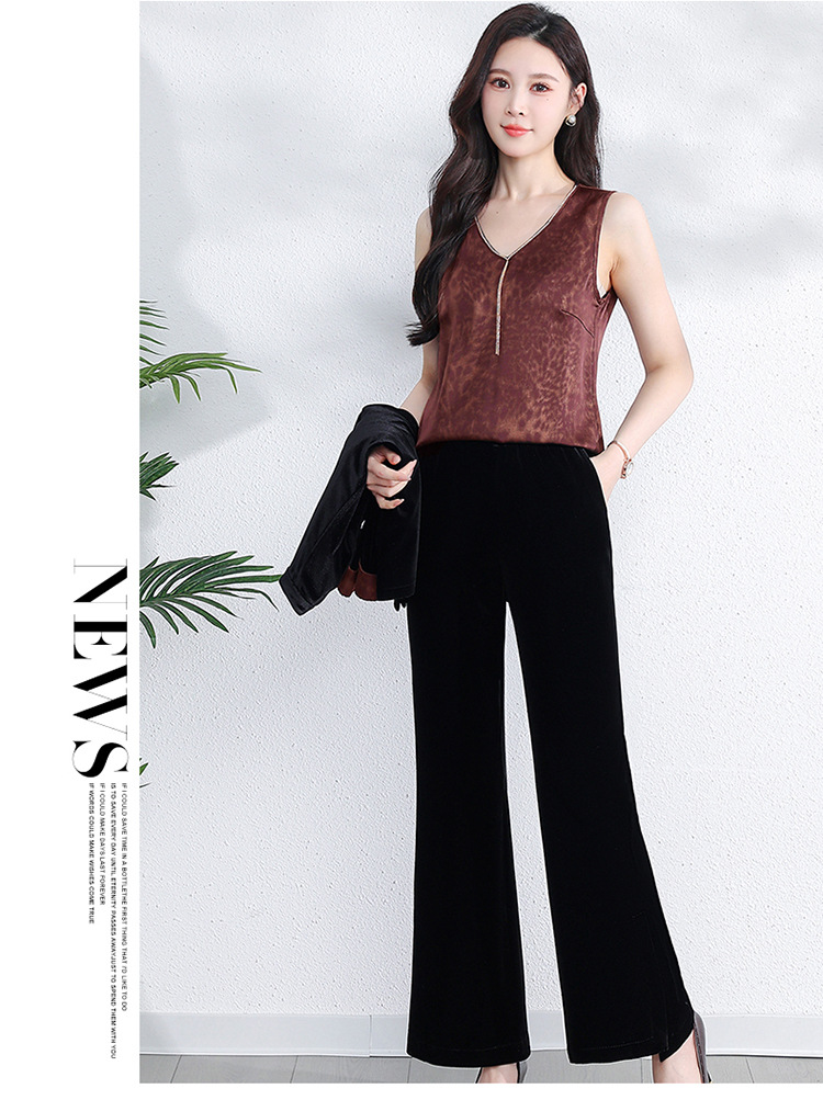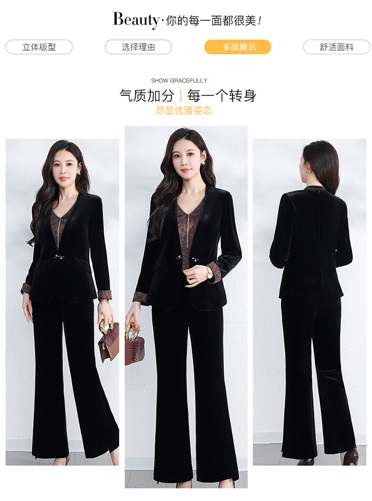QYM 99H225-Y金丝绒三件套妈妈装打底衫+西装外套+长款微喇裤套装