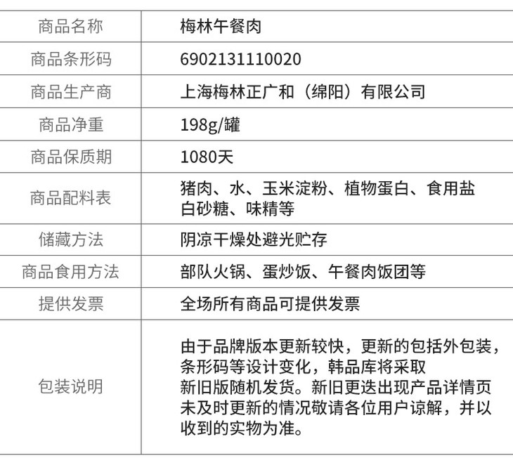 meiling돼지고기햄梅林午餐肉198g