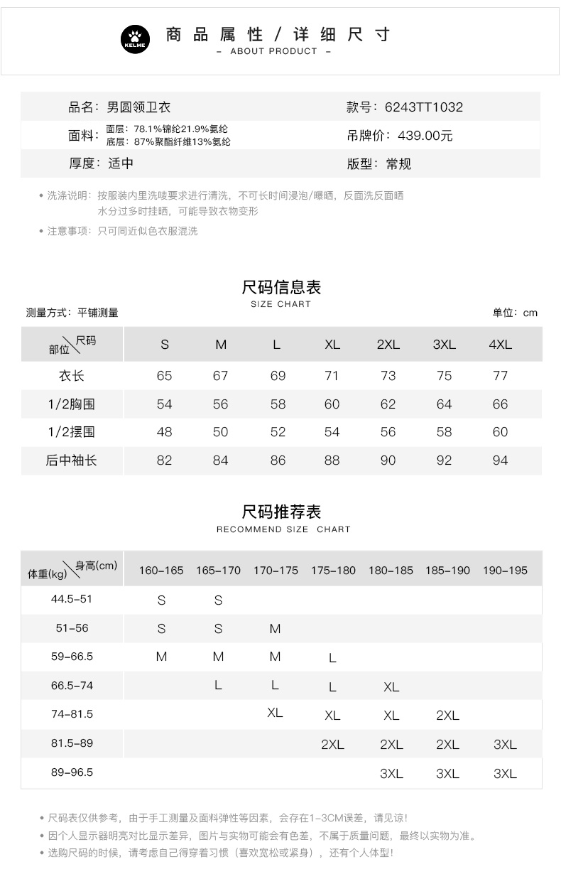 卡尔美圆领卫衣男秋冬套头衫百搭运动休闲长袖上衣