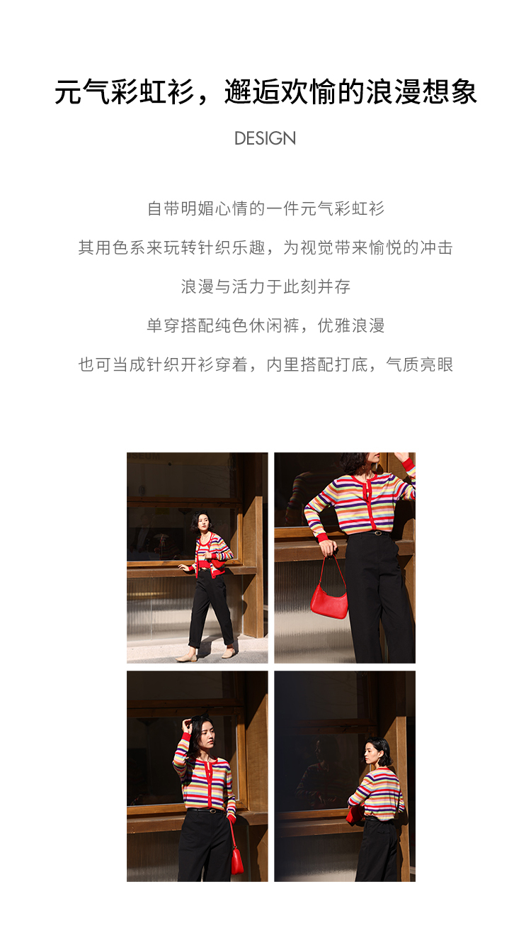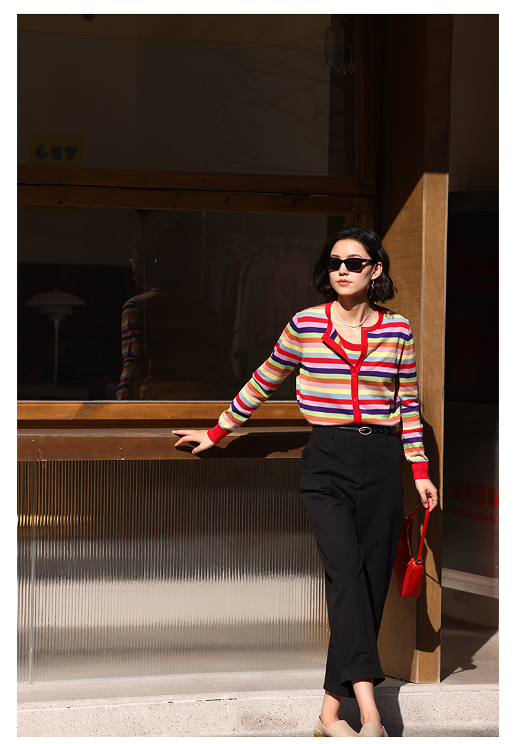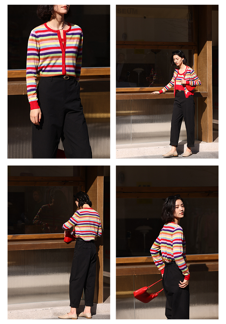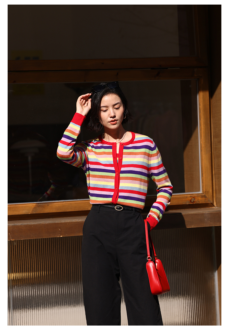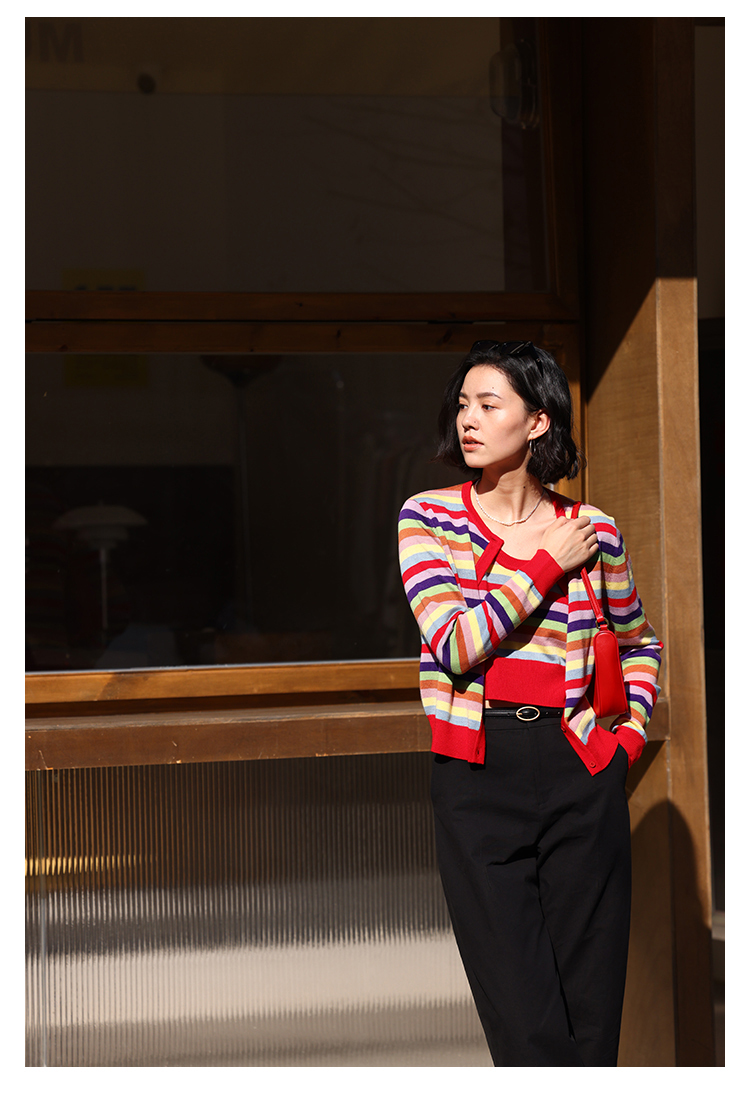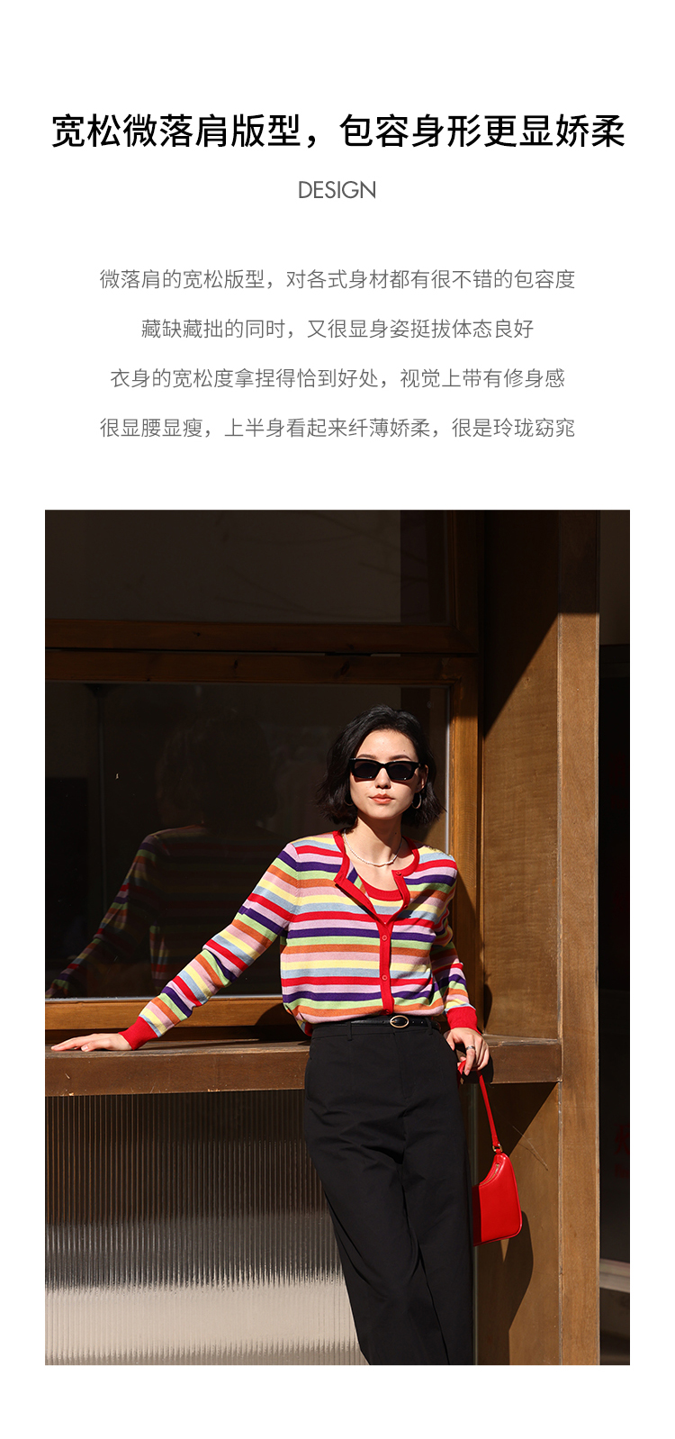 HeyDress彩虹针织开衫女春季法式条纹撞色设计感小众减龄短款上衣