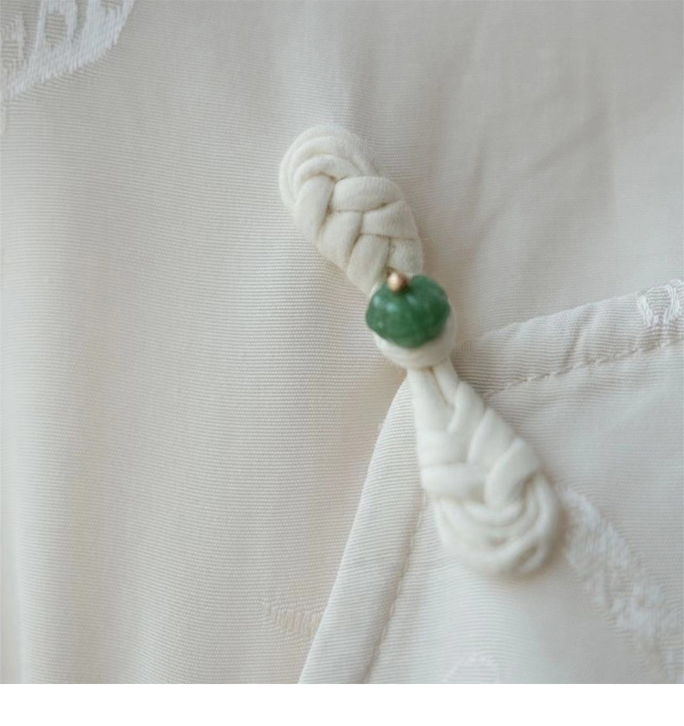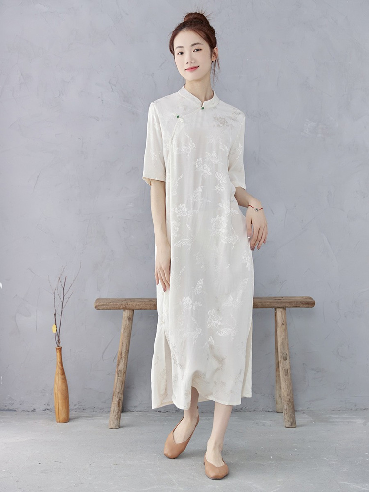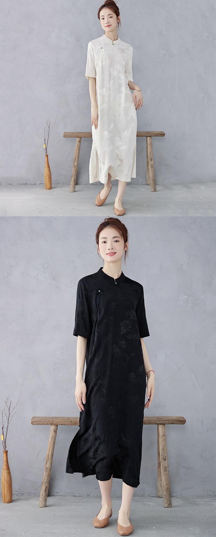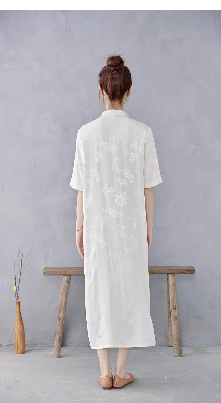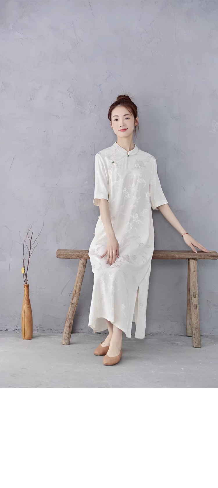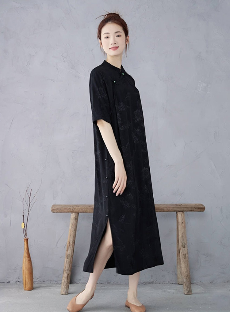 雀说 夏季人丝提花新中式立领珠扣喇叭袖旗袍大码宽松套头连衣裙4ZF-2347