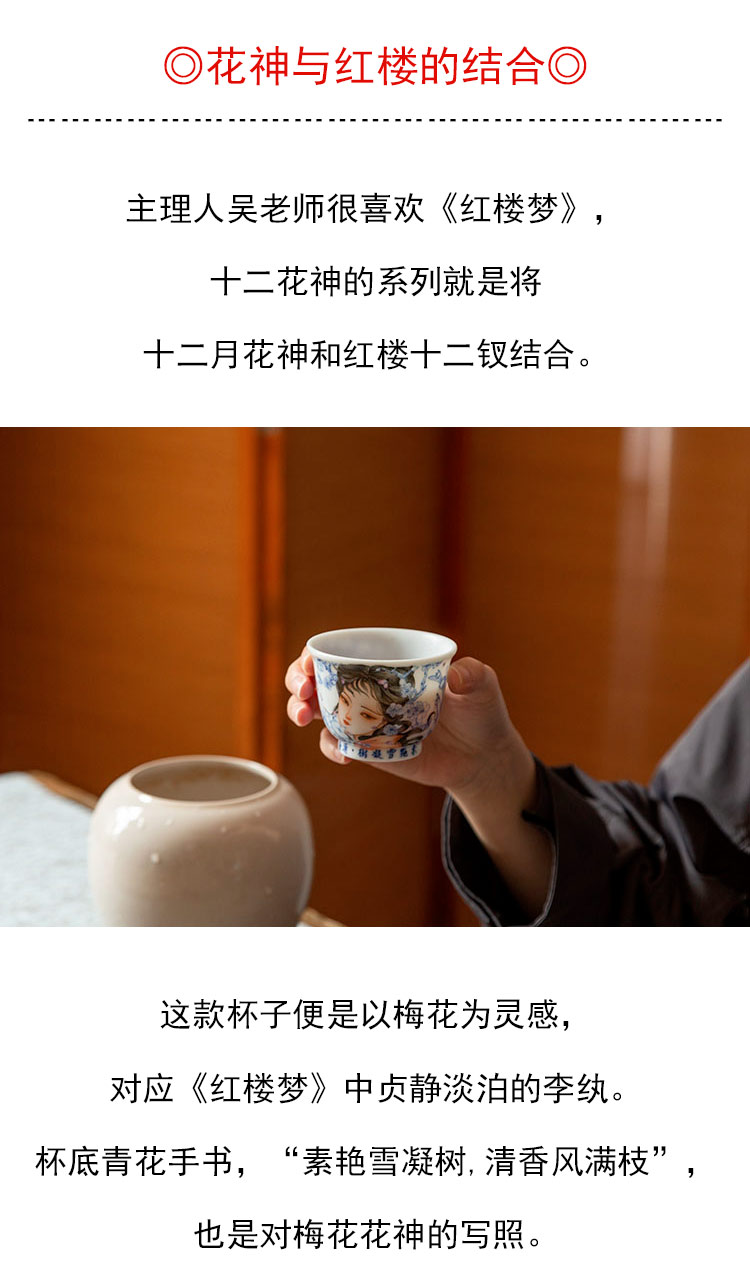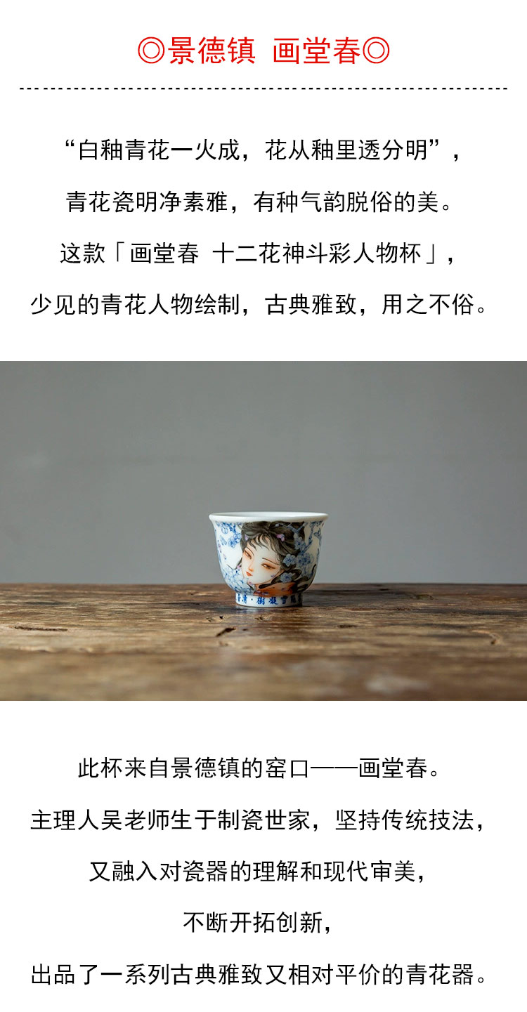 茶香记 画堂春 十二花神斗彩人物杯 梅花花神 古雅鲜妍 青花手绘