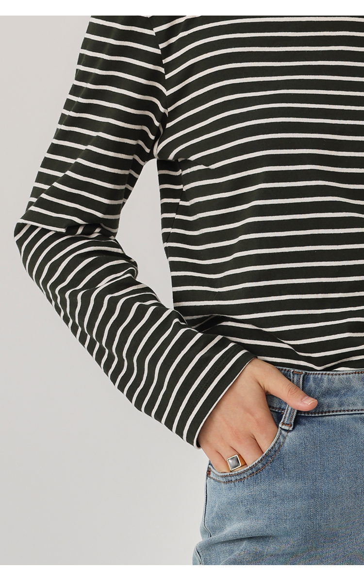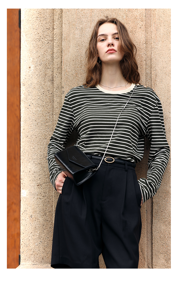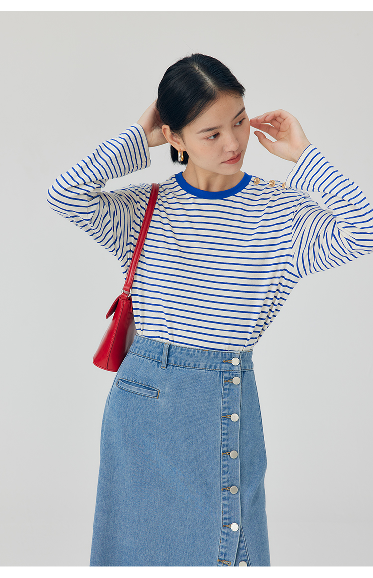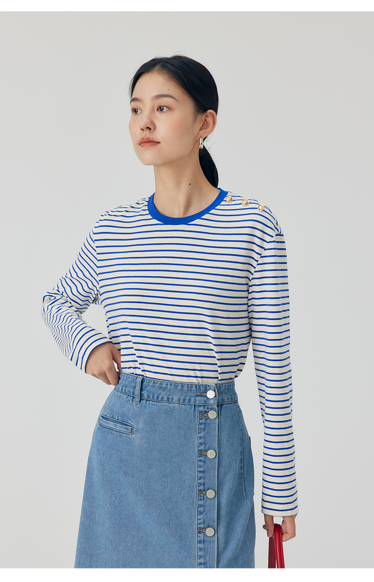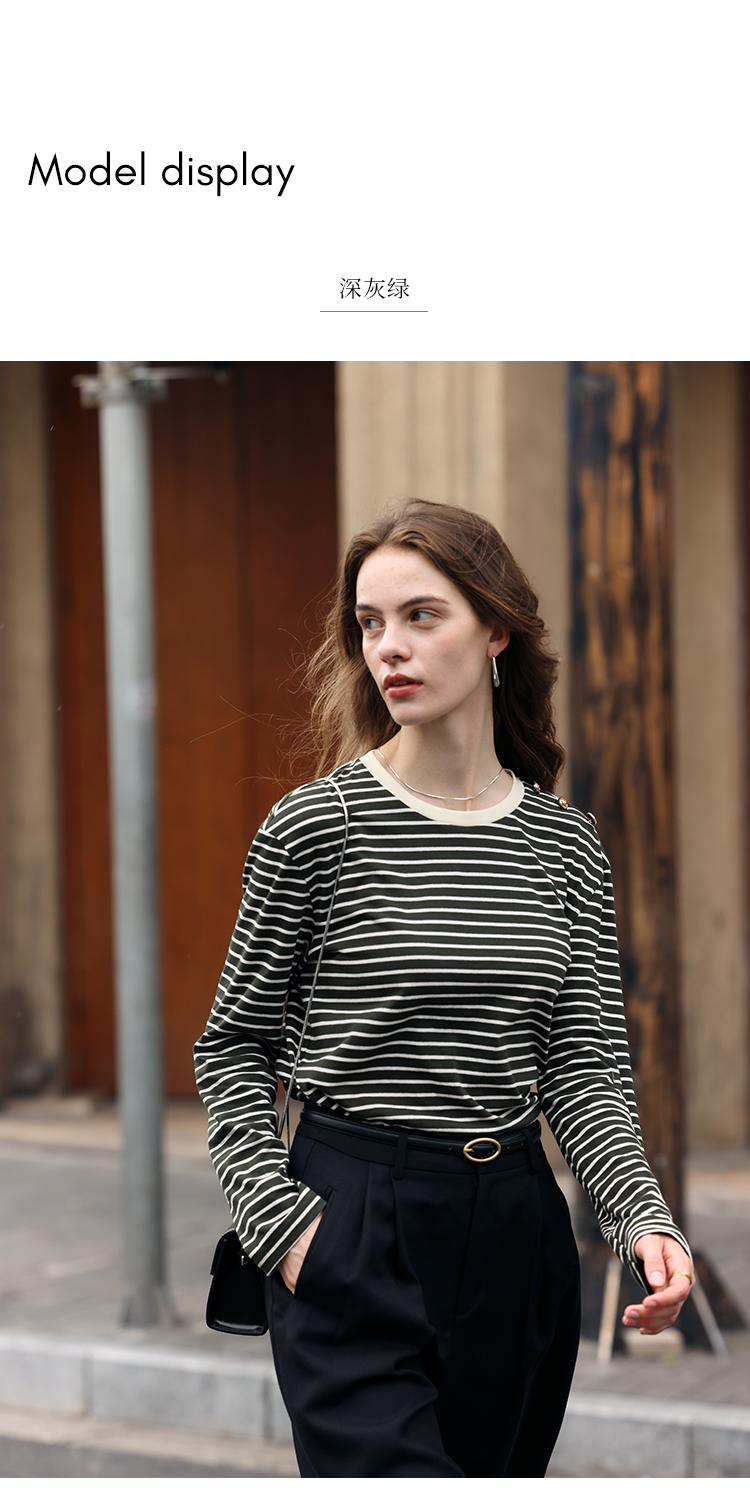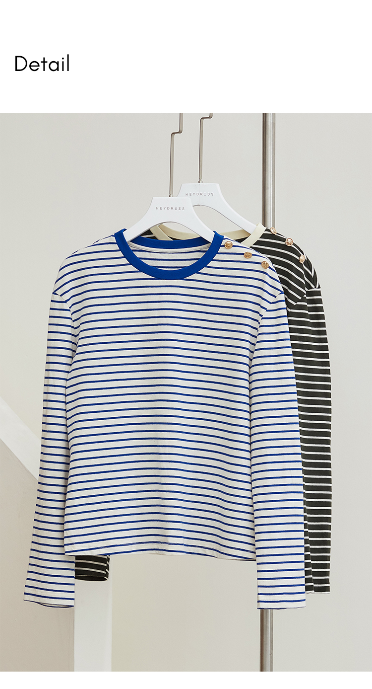 HeyDress条纹针织衫女秋季法式撞色条纹设计感长袖纯棉t恤打底衫