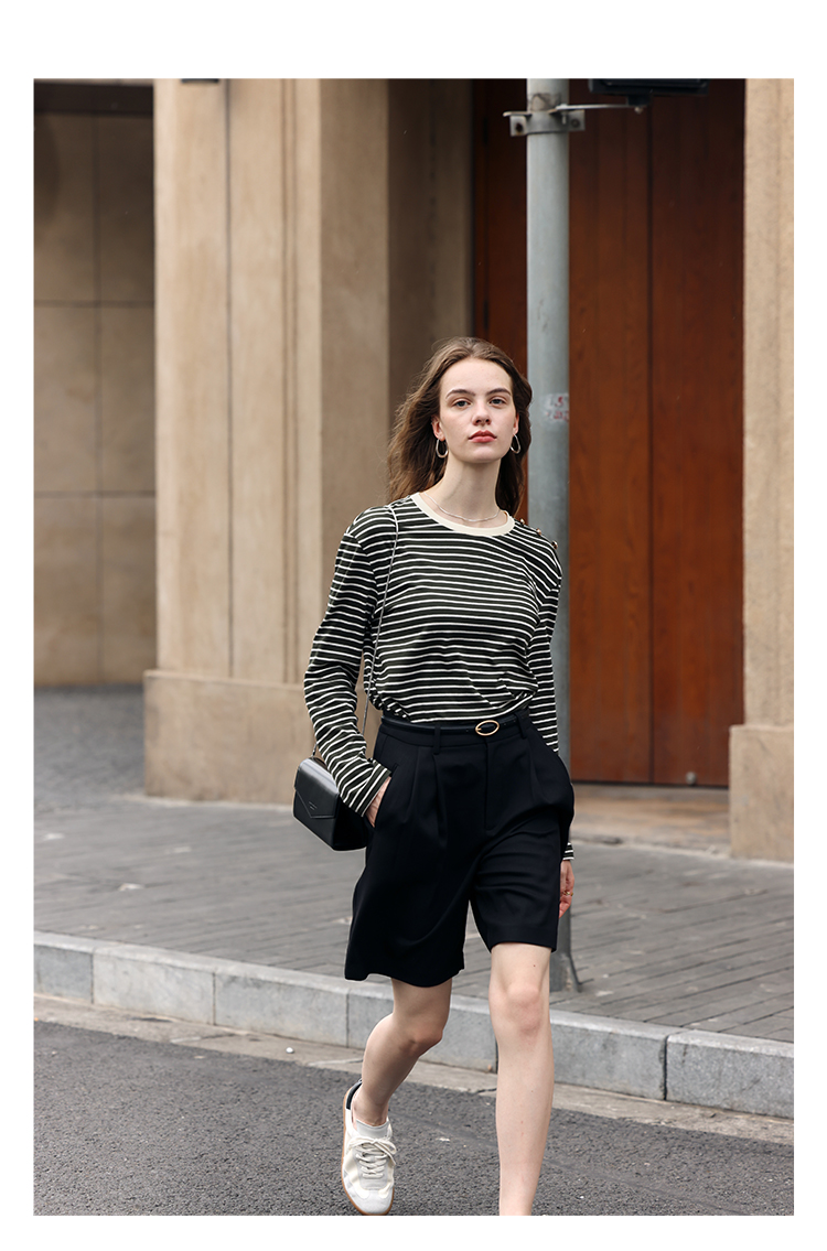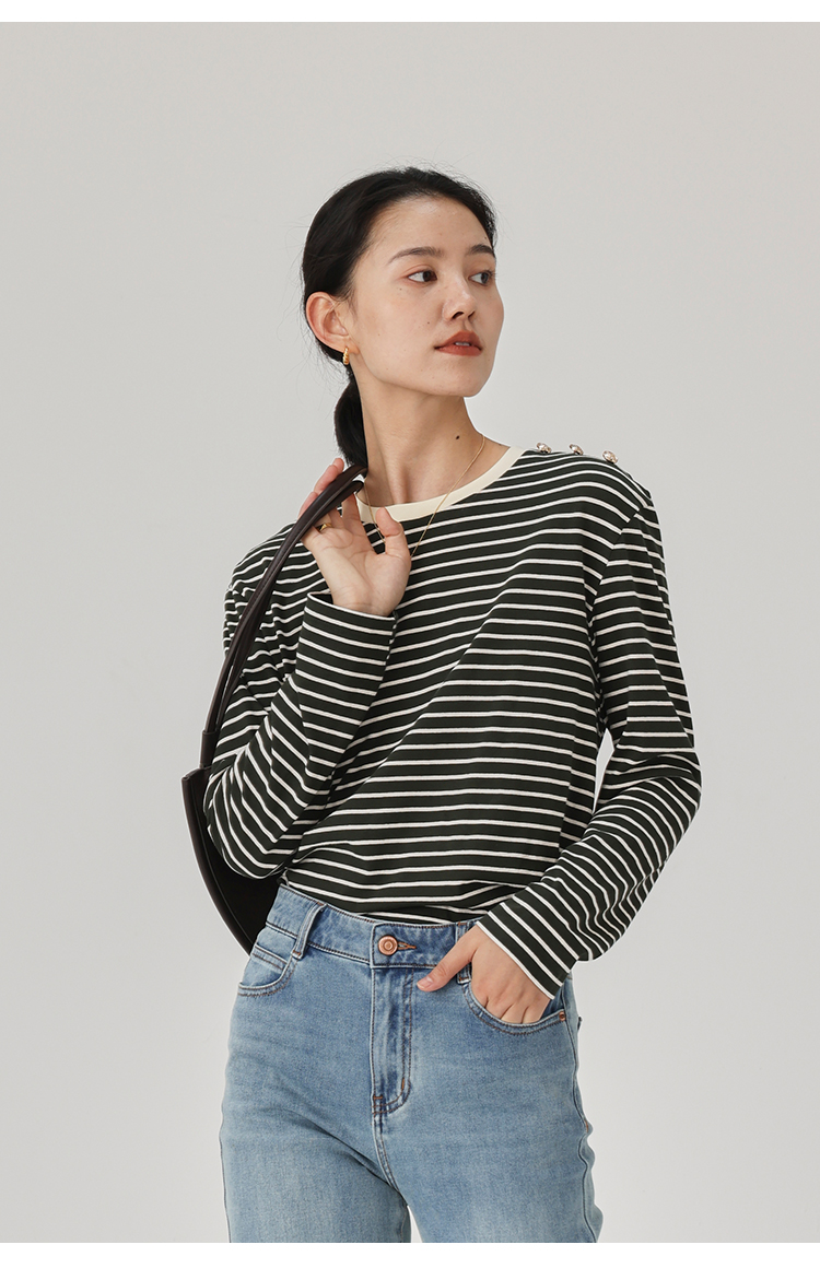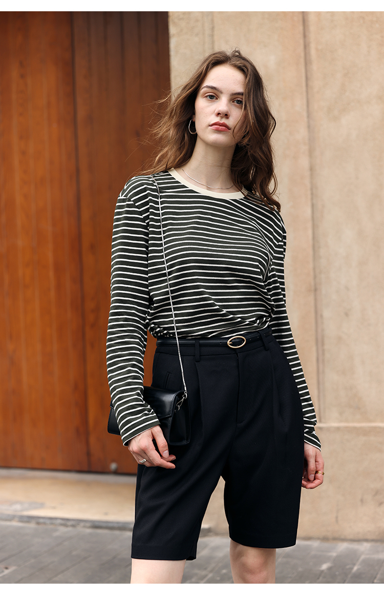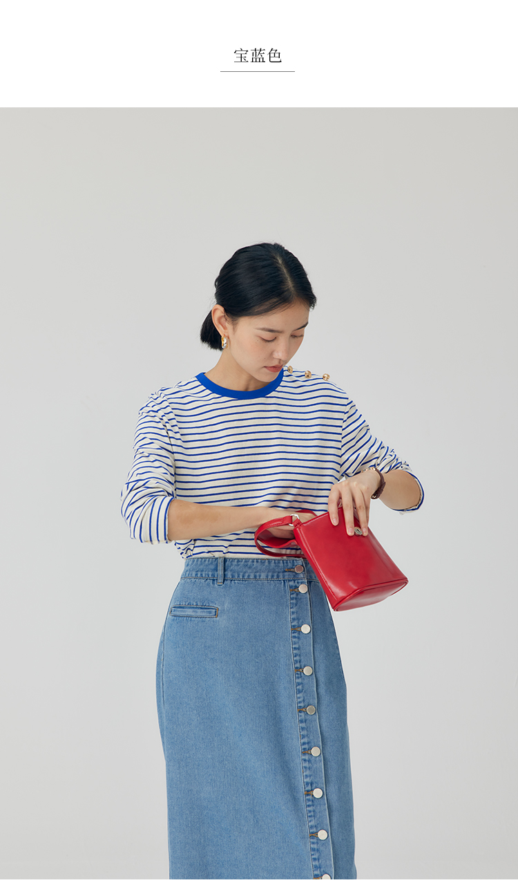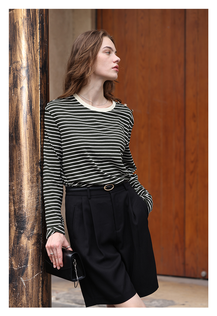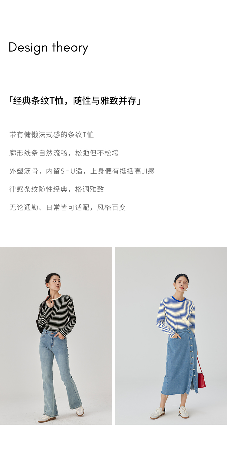 HeyDress条纹针织衫女秋季法式撞色条纹设计感长袖纯棉t恤打底衫