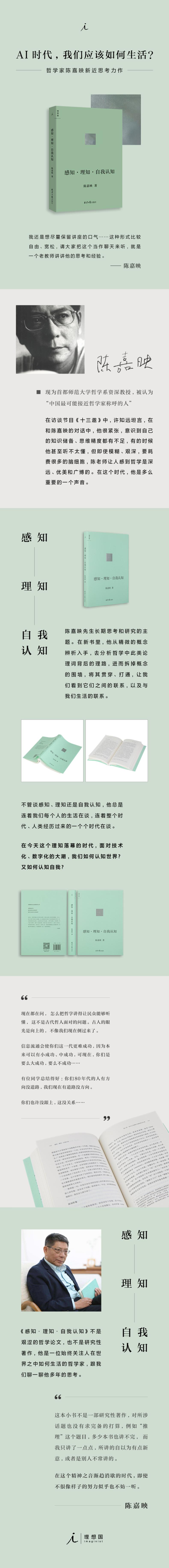 “感知”“理知”“自我认知”是著名哲学家陈嘉映先生长期思考和研究的主题。秉持一贯的论述特点,在本书中,他从精微的概念辨析入手,去分析哲学中此类论理词背后的理路,进而拆掉概念的围墙,将其贯穿、打通,让我们看到它们之间的联系,以及与我们生活的联系。不管谈感知、理知还是自我认知,他总是连着我们每个人的生活在谈,连着整个时代、人类经历过来的一个个时代在谈。