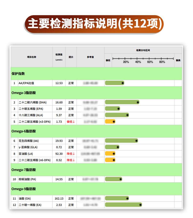 检测内容:检测ω-3族ALA/EPA/DPA/DHA、ω-6族AA,报告12项指标