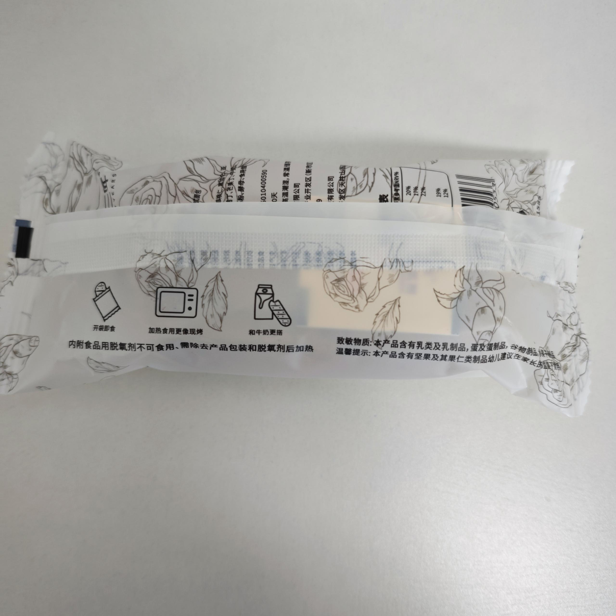 【配料】黑全麦粉、小麦粉、麦麸、核桃仁、黑加仑、亚麻籽、南瓜子、重瓣玫瑰花瓣、桔丁、芒果丁、牛奶、鸡蛋、白砂糖、安佳黄油、全脂奶粉、酵母、食用盐