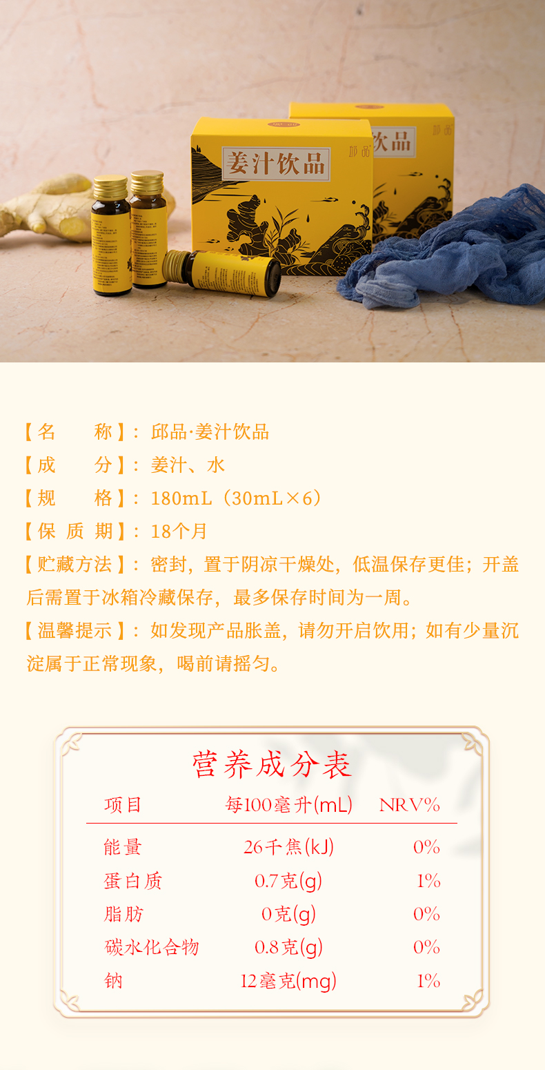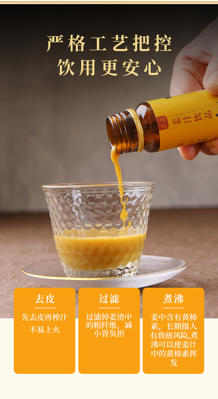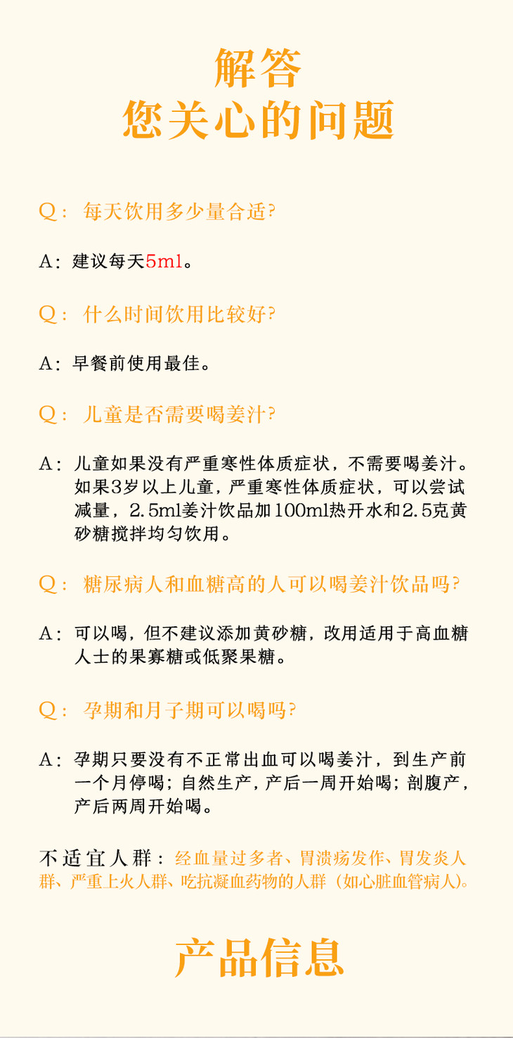 温姜汁做法:取本品5ml(约2瓶盖)+5g左右黄砂糖+100ml温水