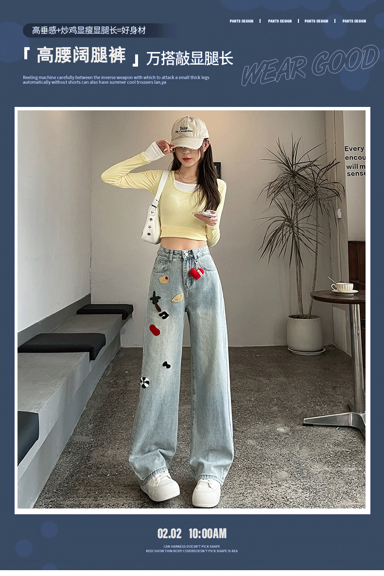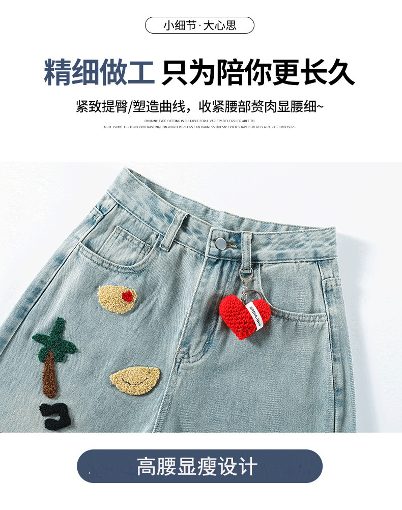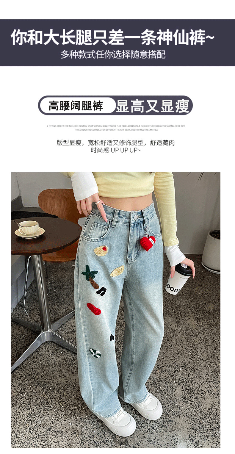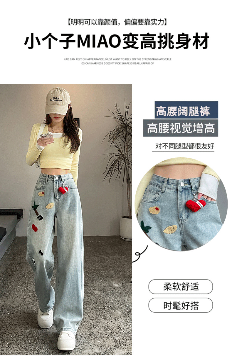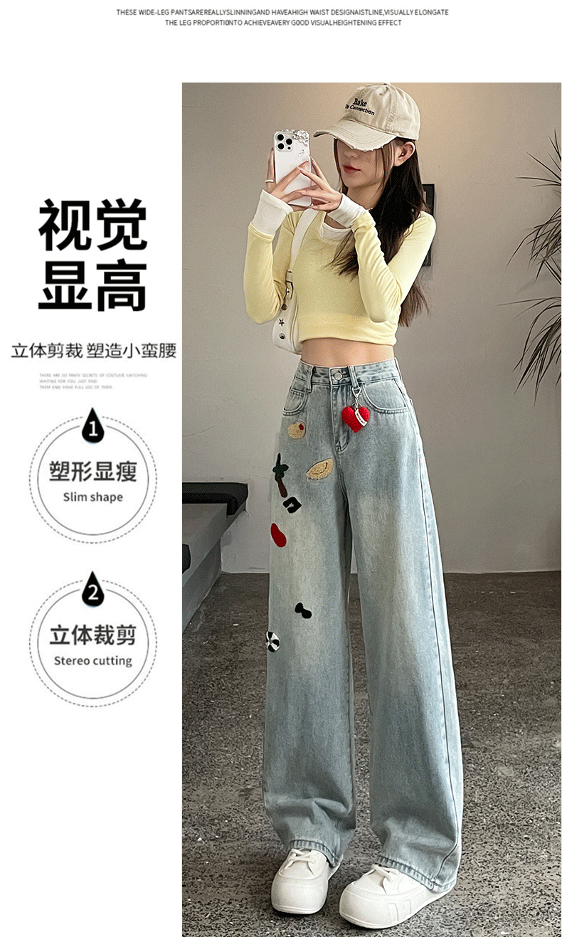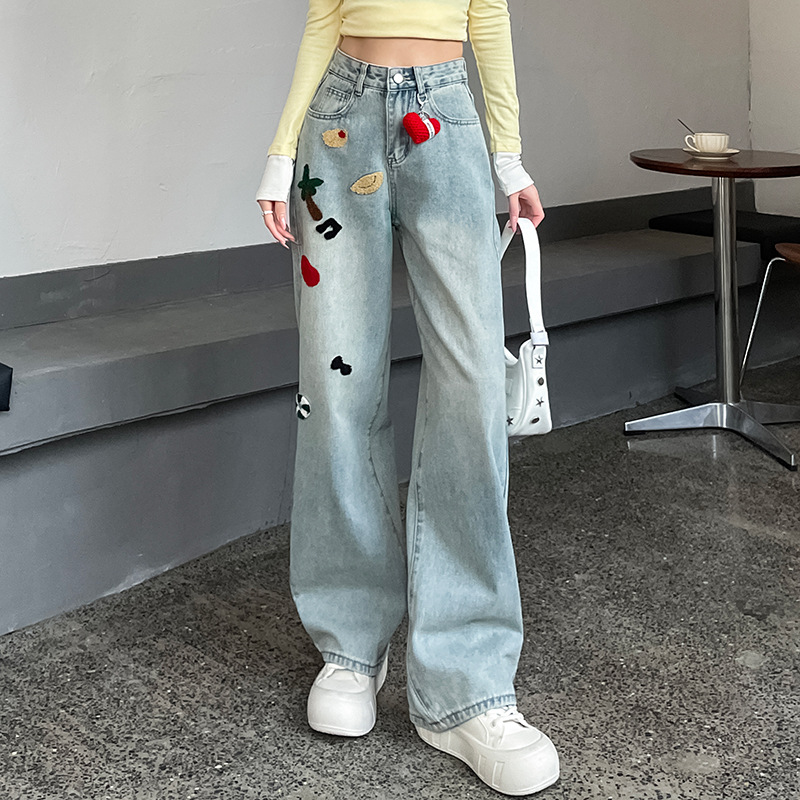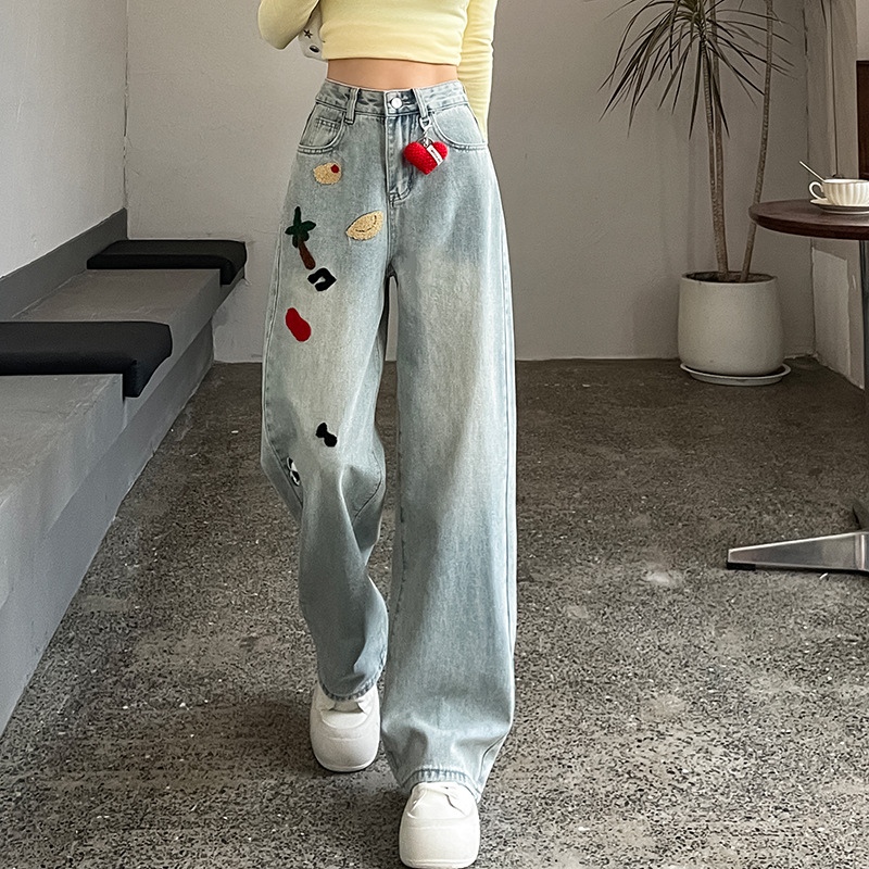 丁摩 重工刺绣牛仔裤女春秋季新款浅色休闲阔腿裤直筒拖地裤子卡通5ZF-0671