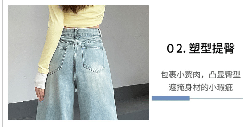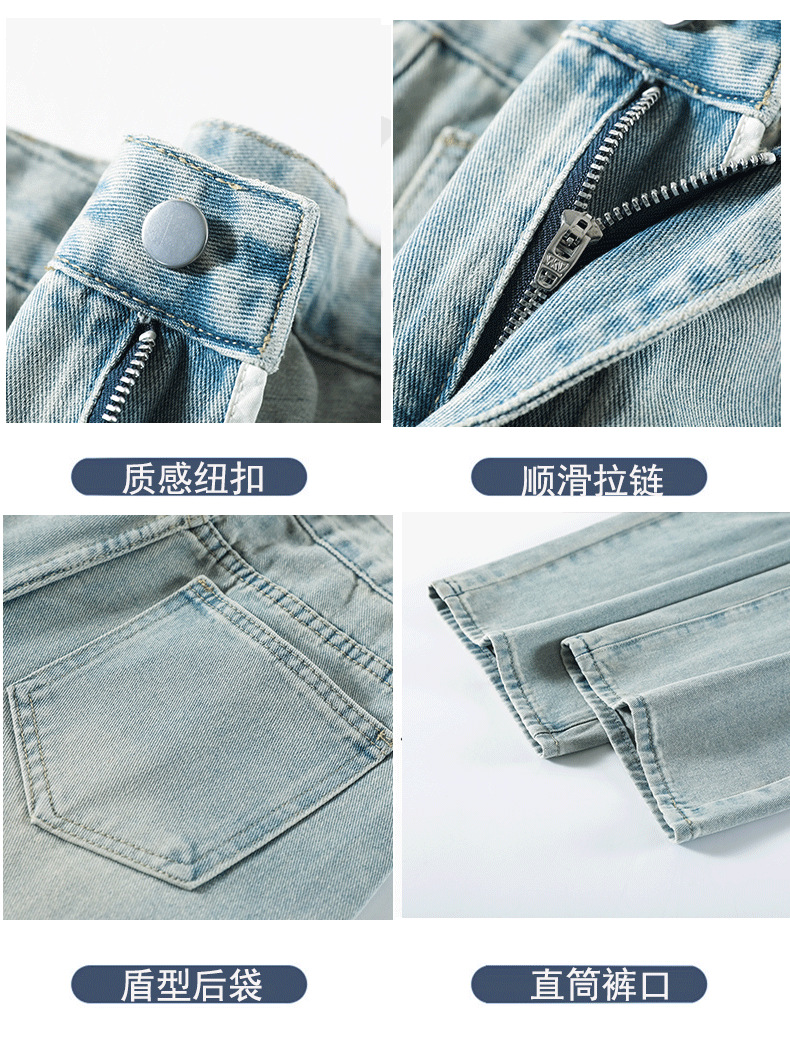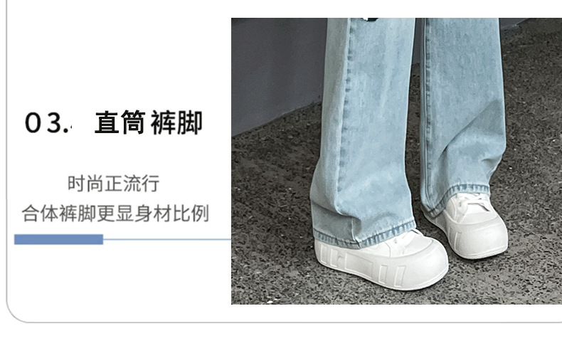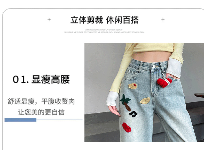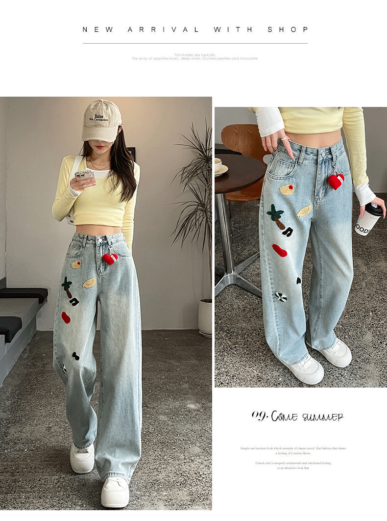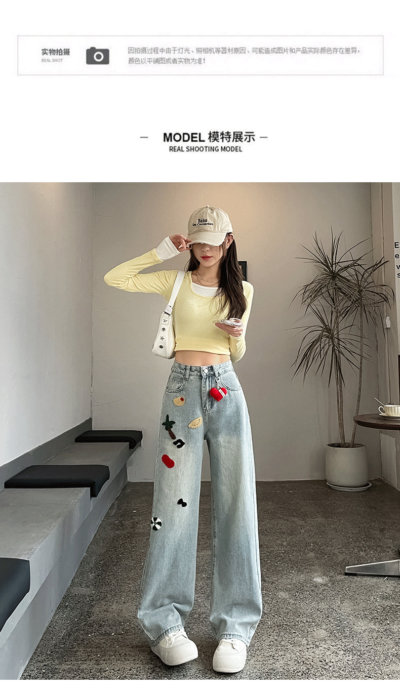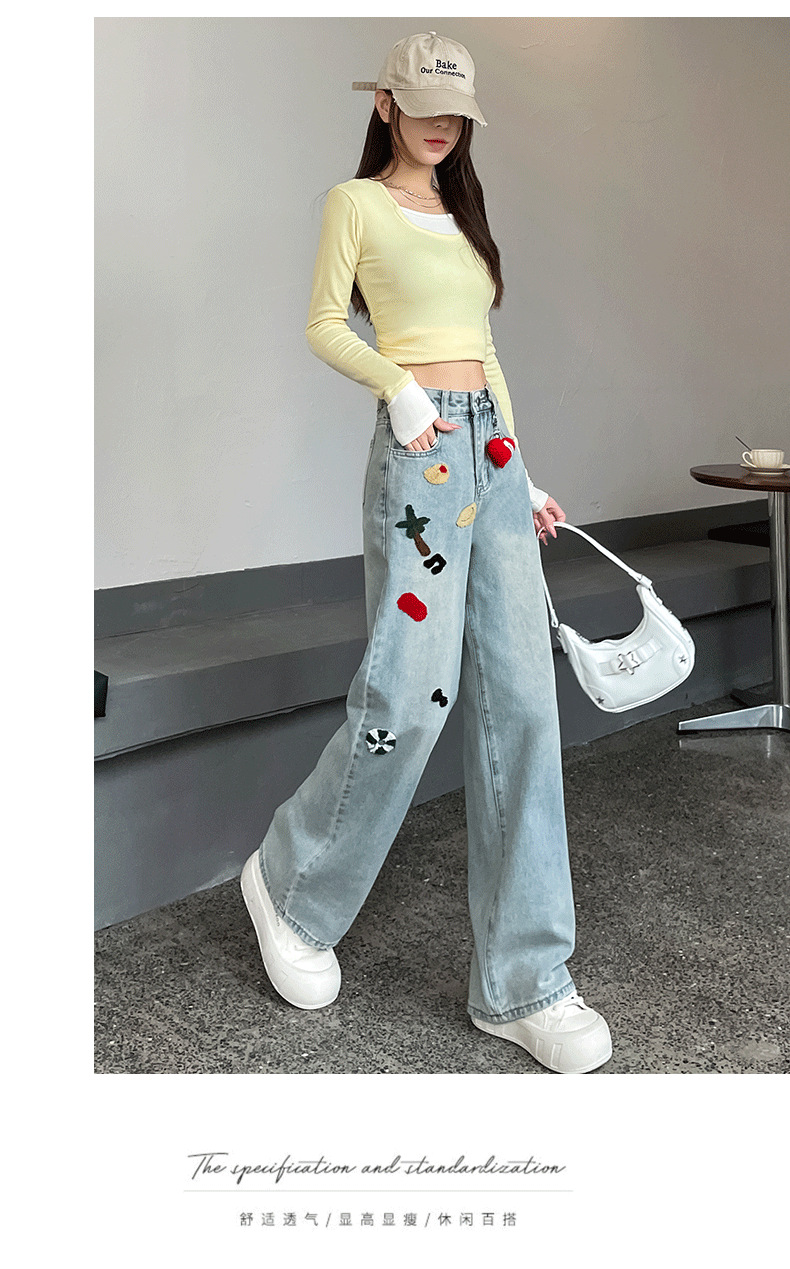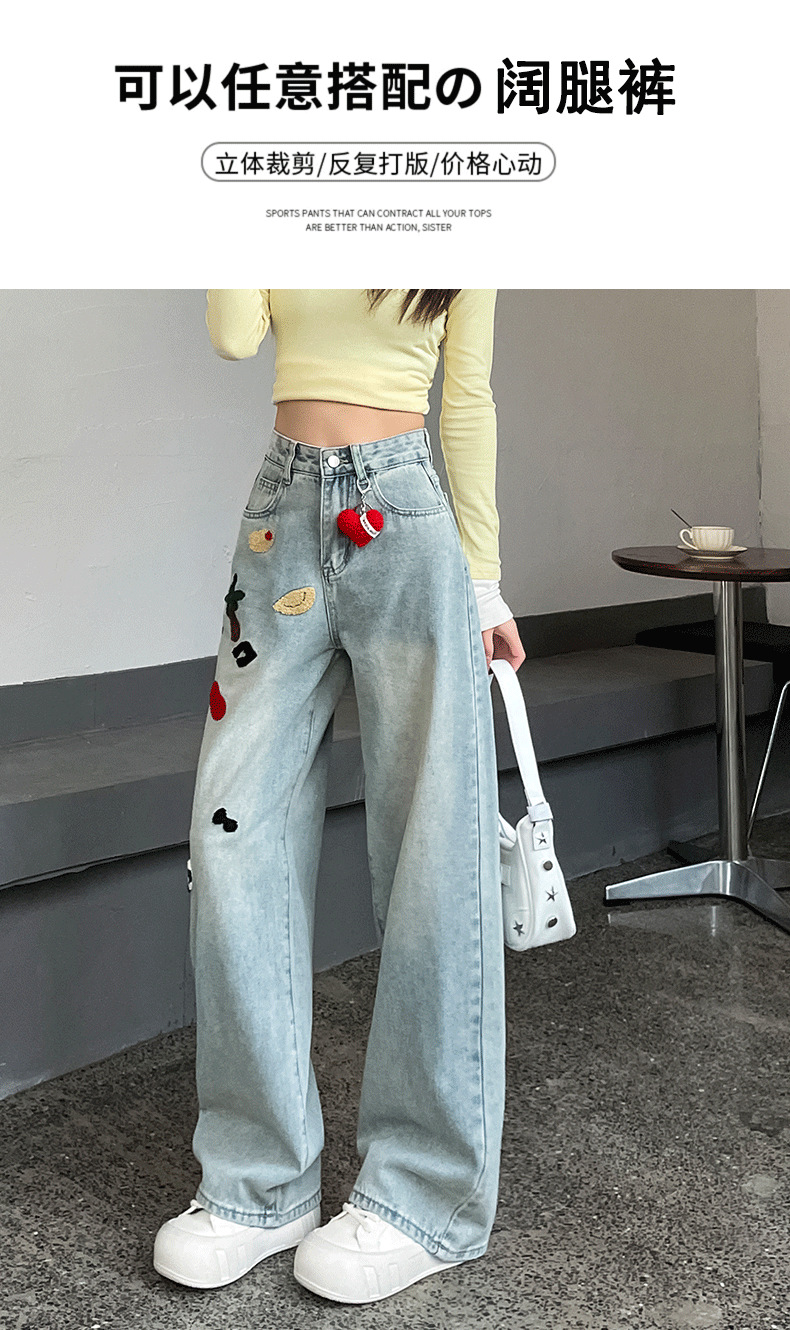 丁摩 重工刺绣牛仔裤女春秋季新款浅色休闲阔腿裤直筒拖地裤子卡通5ZF-0671